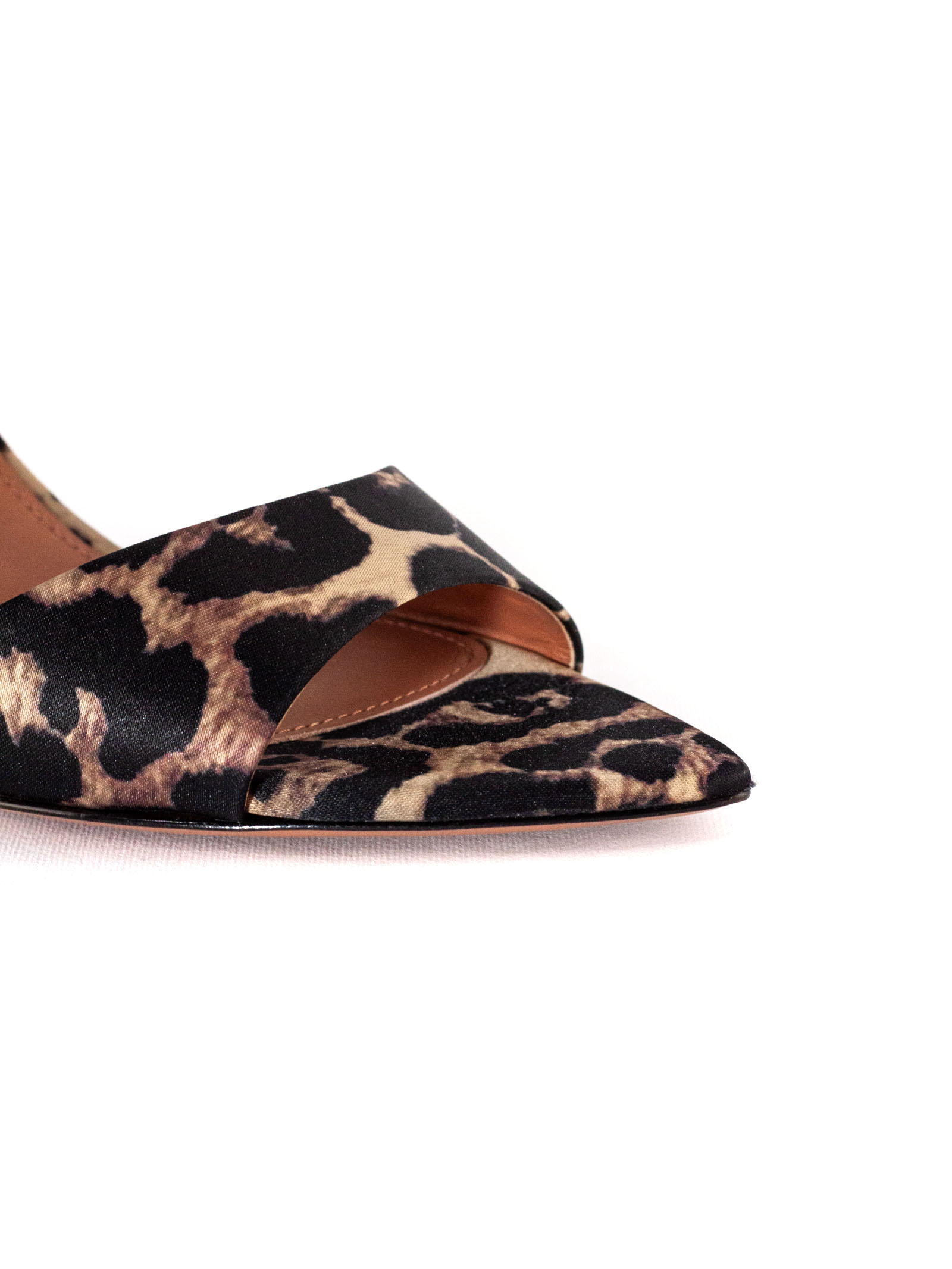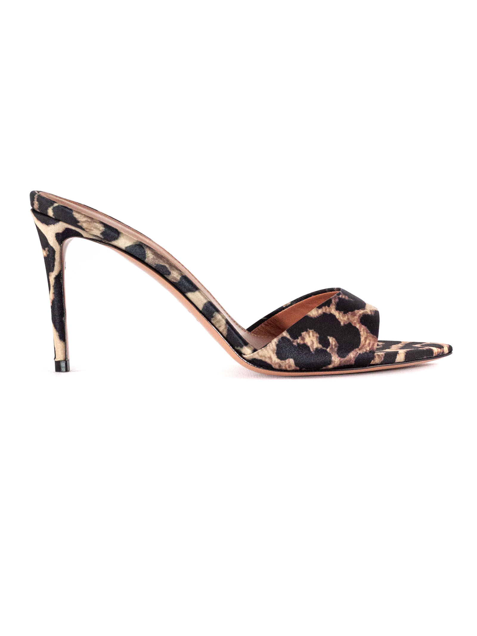 Alixia sandals in leopard satin, thin stiletto heel, open toe, heel height 3.1 inches