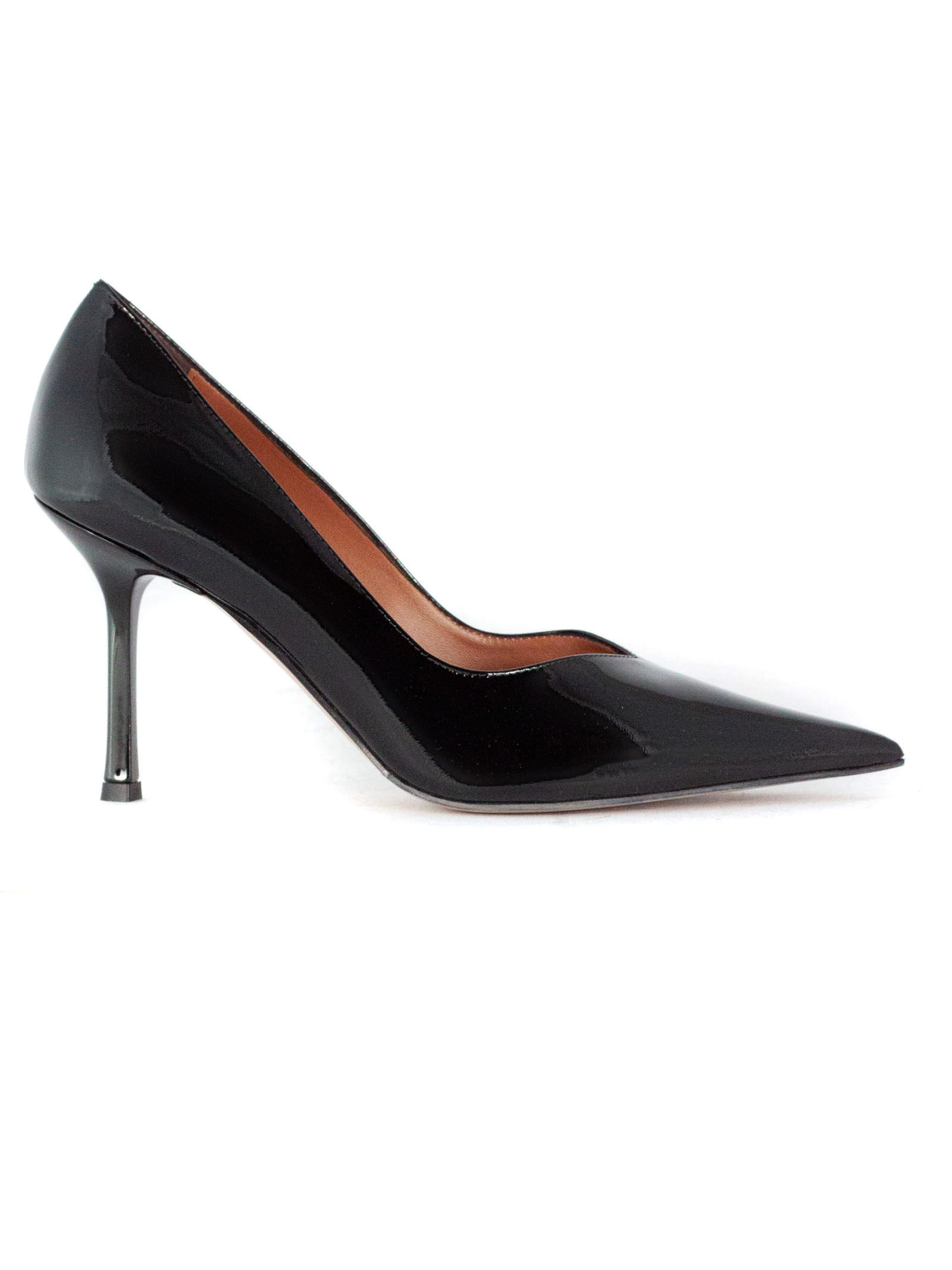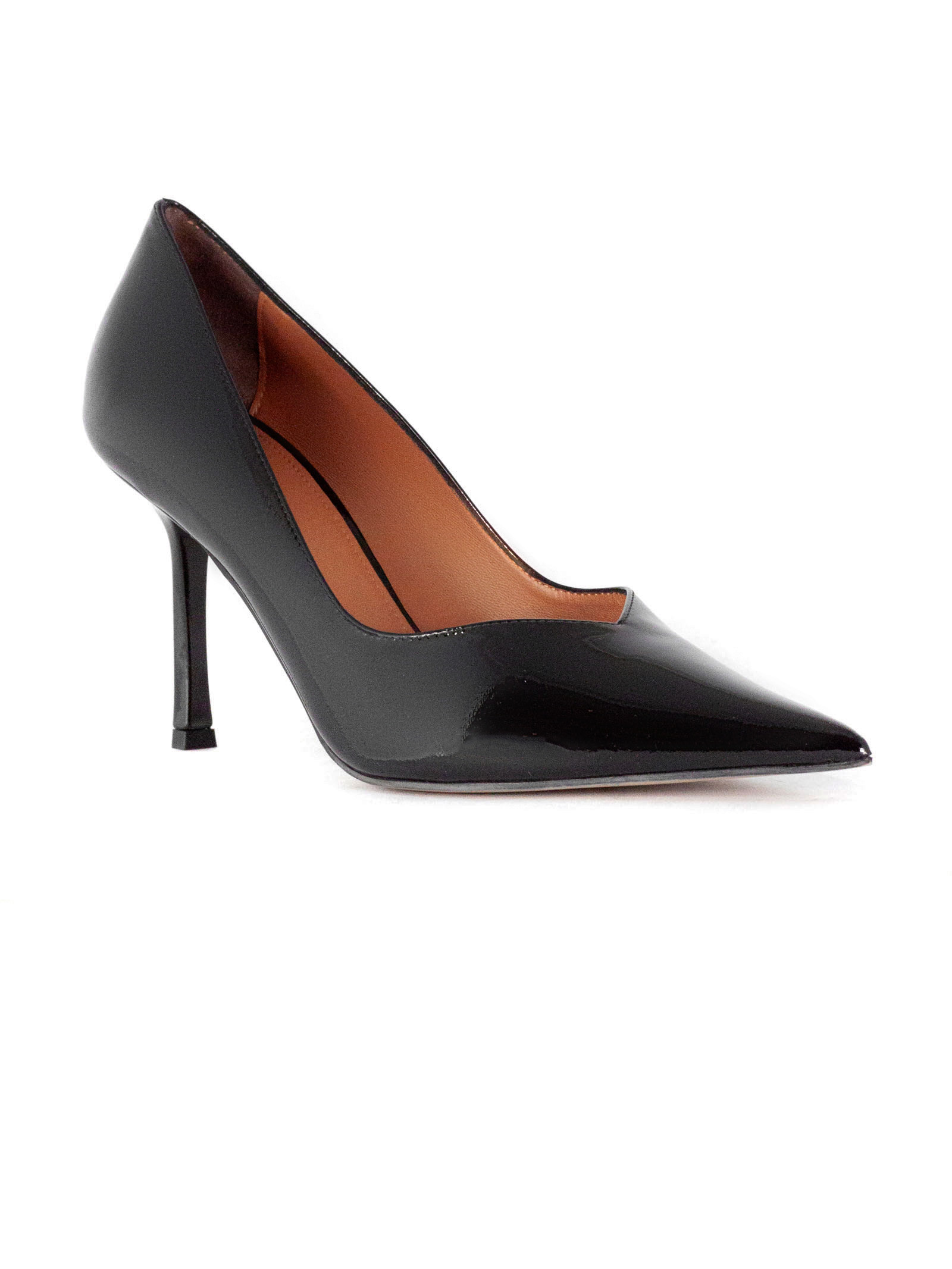 Black patent leather pumps with pointed toe, leather sole with logo, heel height 9 cm