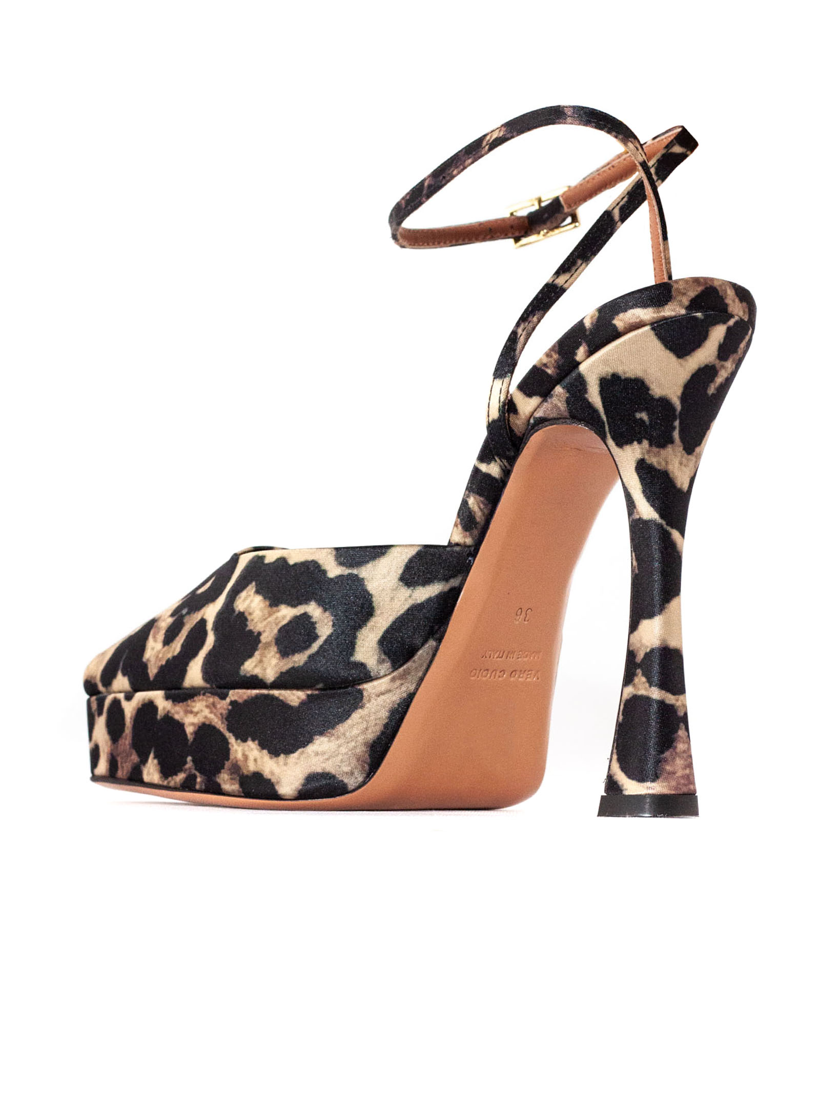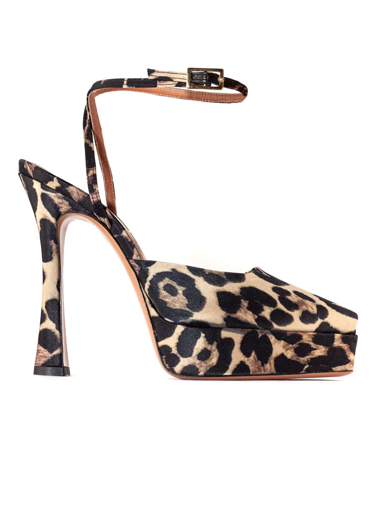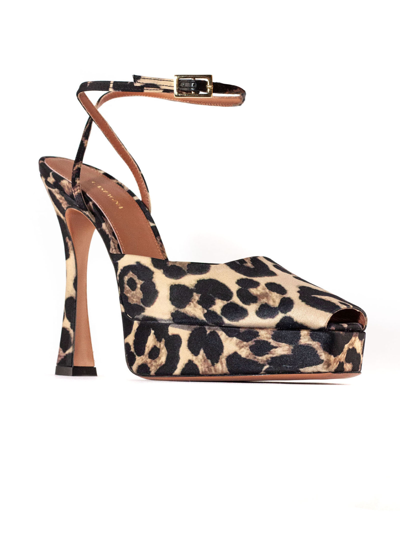 Vicky sandal in leopard print satin, open toe, adjustable gold-colored metal ankle strap, leather sole with logo, 4 cm platform, 12 cm heel
