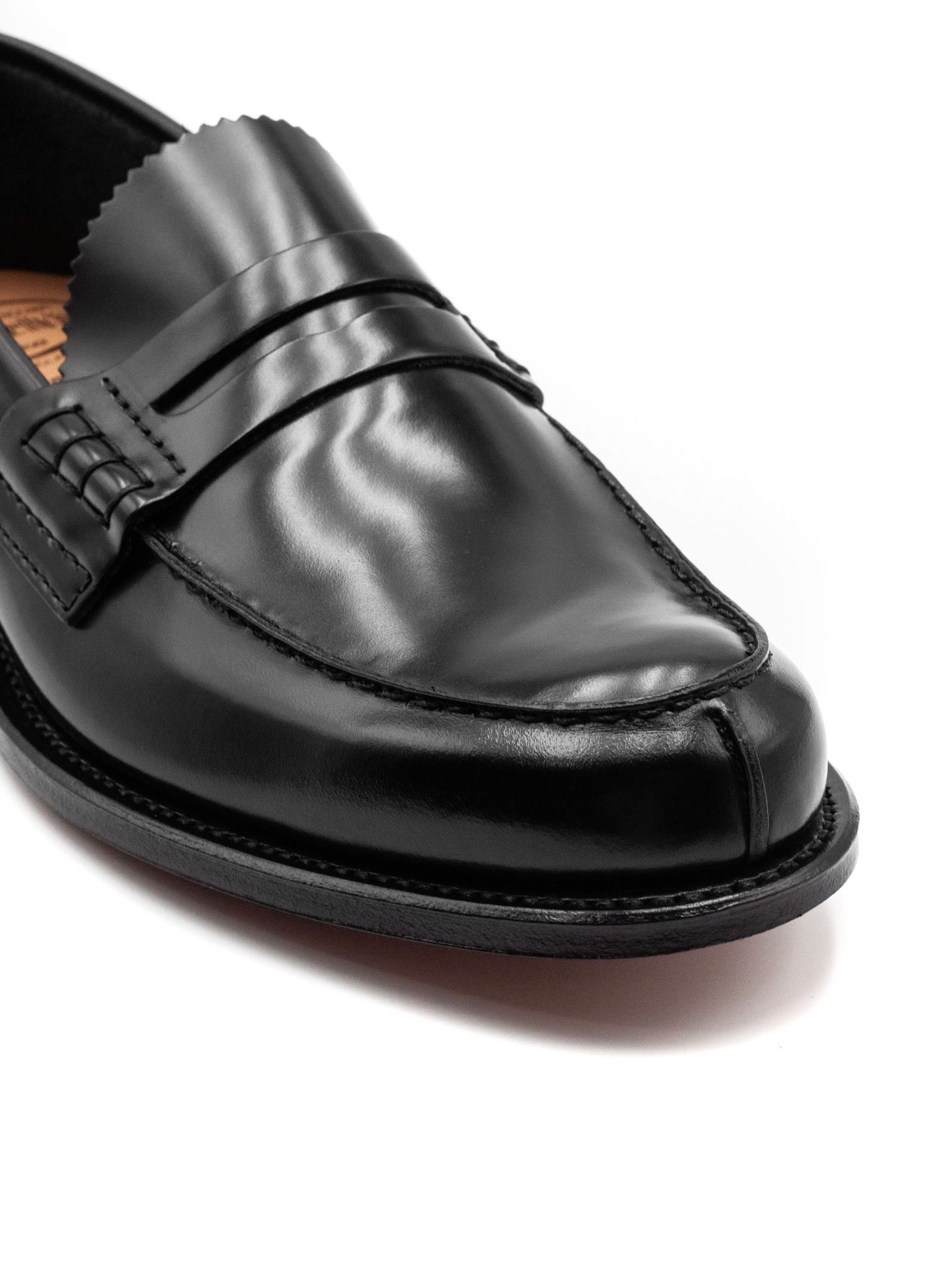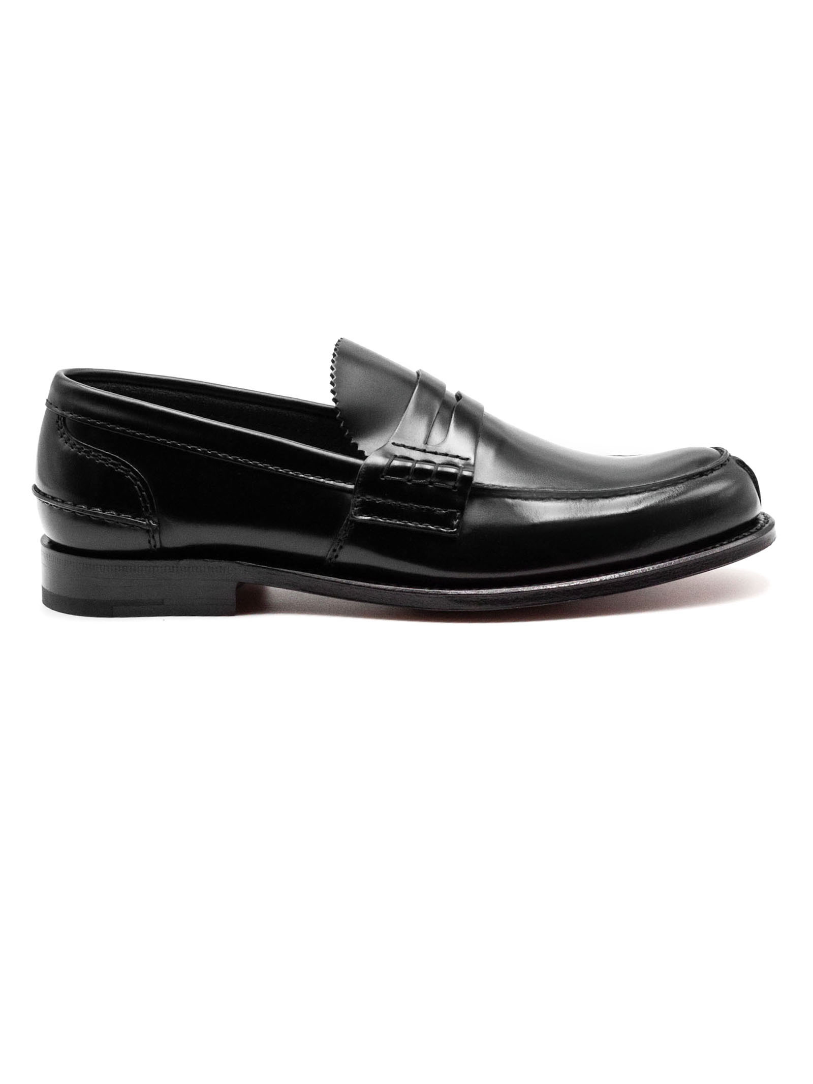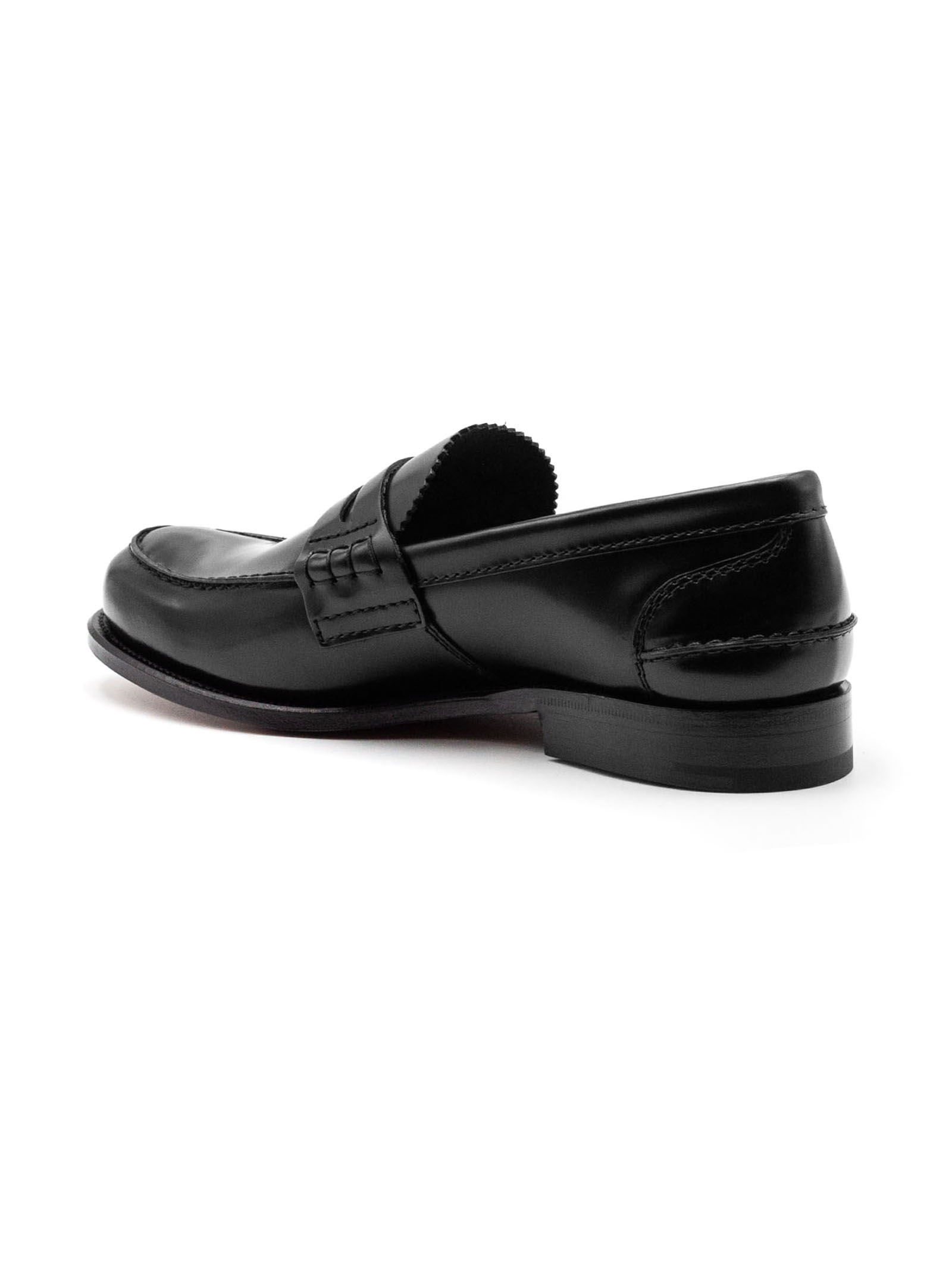 Black Pembrey Bookbinder Fumè Penny Loafer, Gimping to vamp, Heel counter detailing, Folded top line for maximum comfort, Last 126, Leather sole, Unlined for softness, Handwritten shoe info to inner vamp, Goodyear construction, Churchs crest to sock and sole