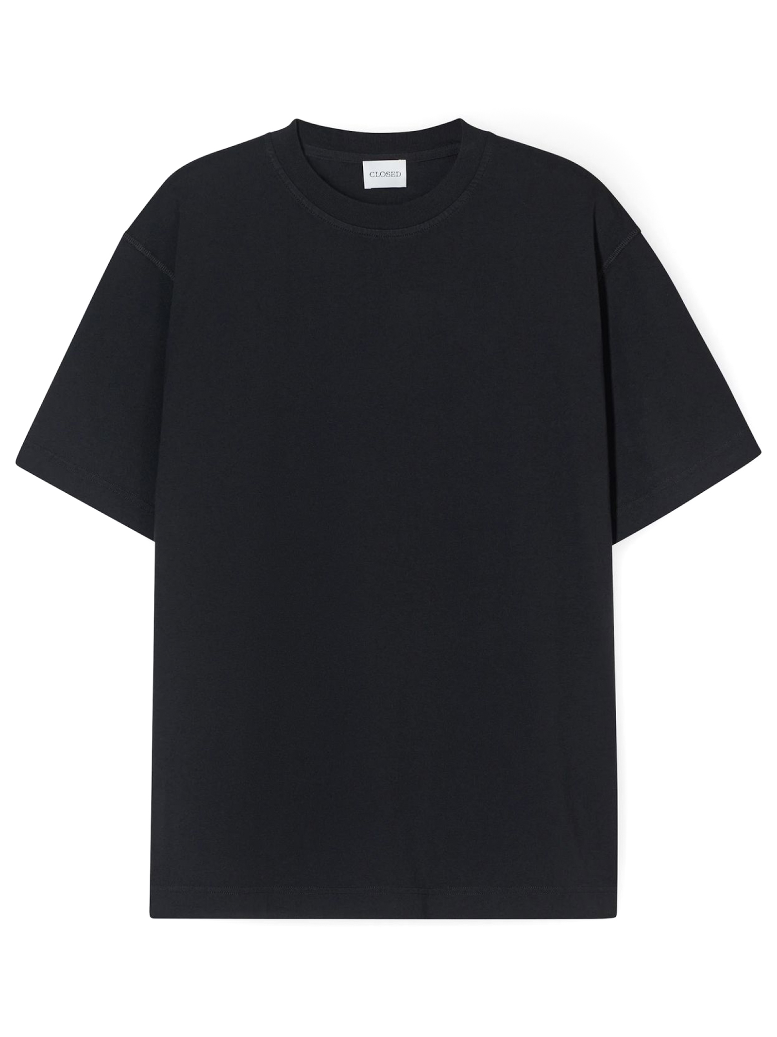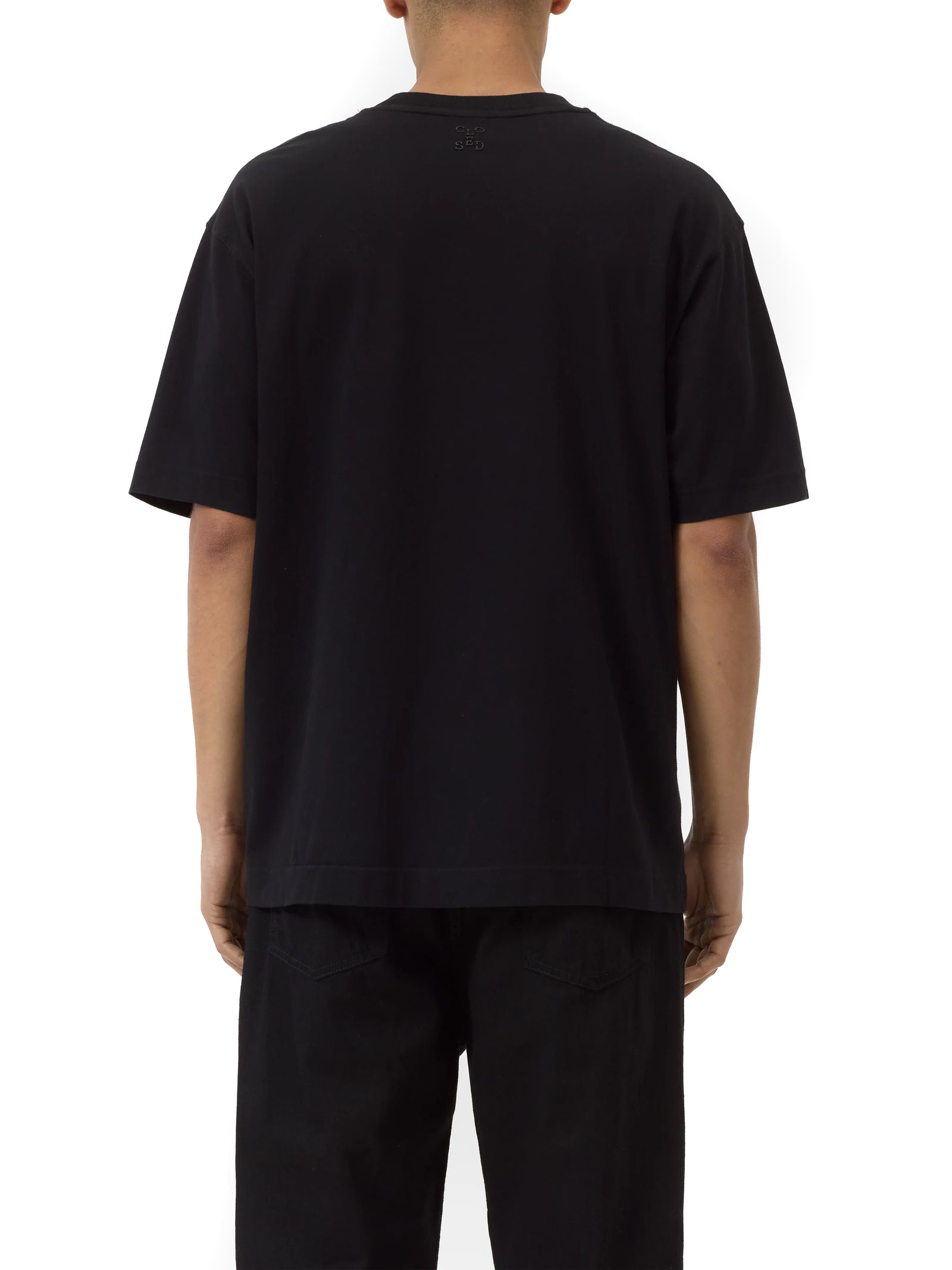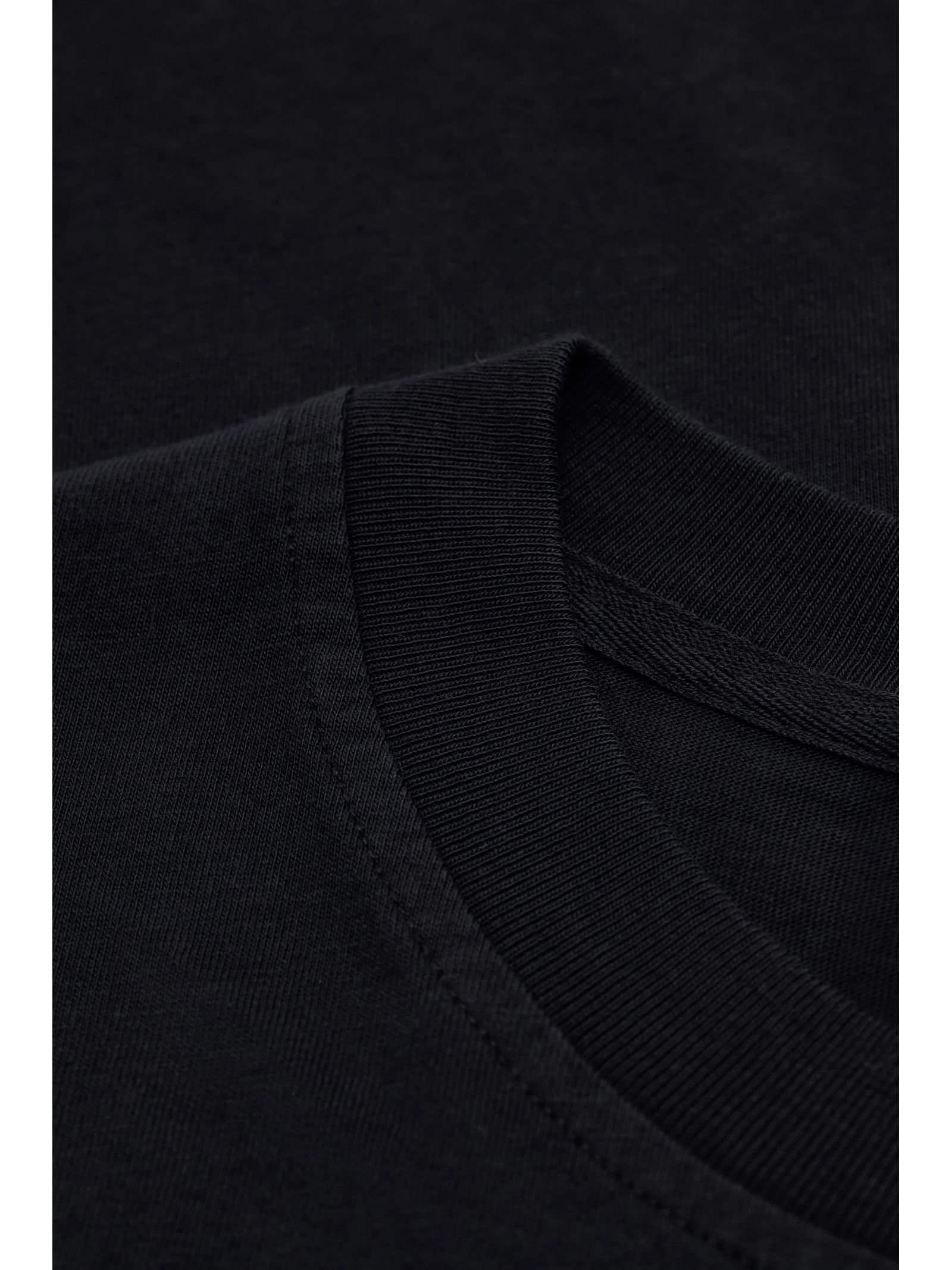 Black cotton T-shirt with a round neckline, subtle logo embroidery on the back, and straight hem and sleeves; comfortable fit