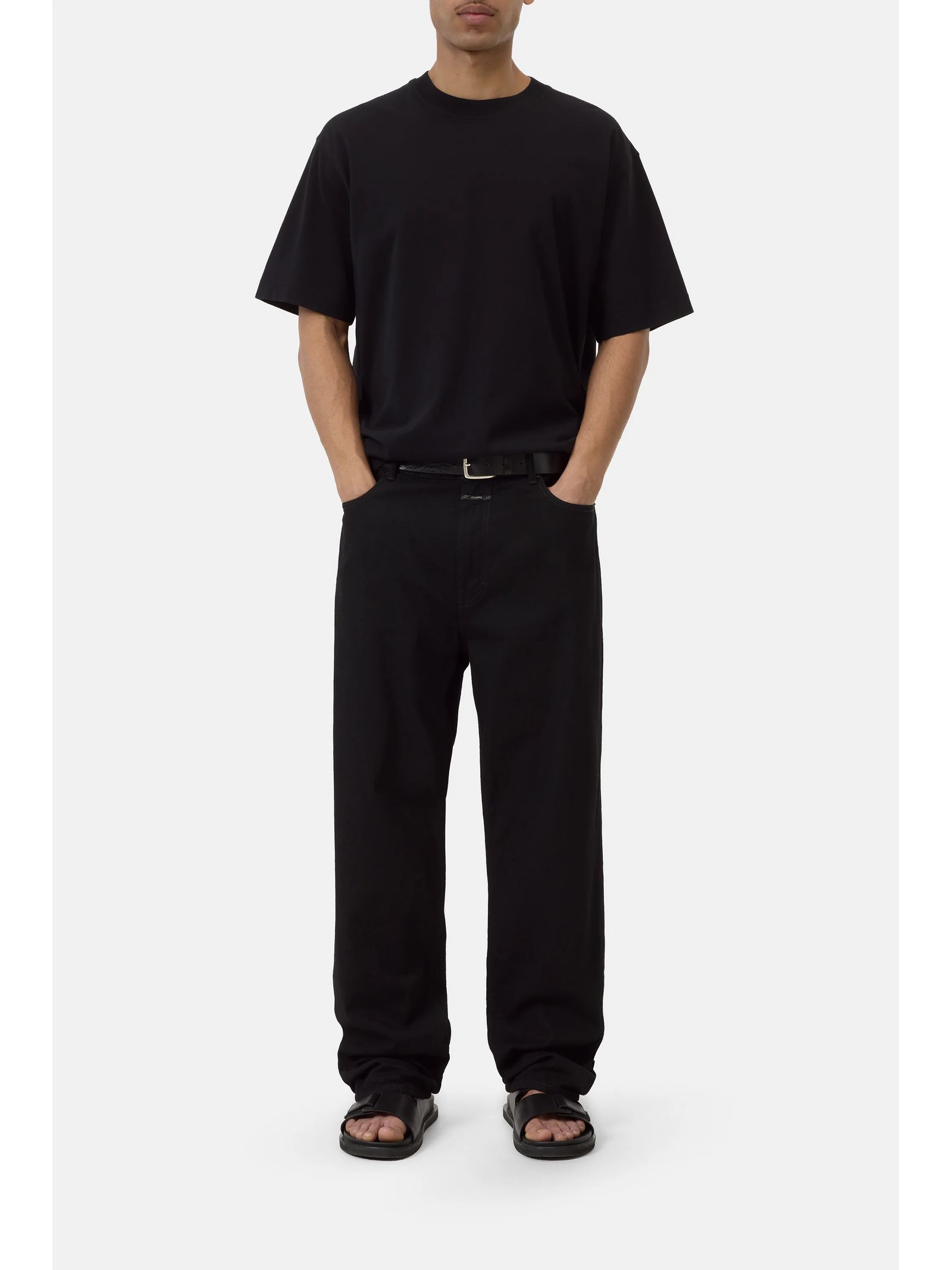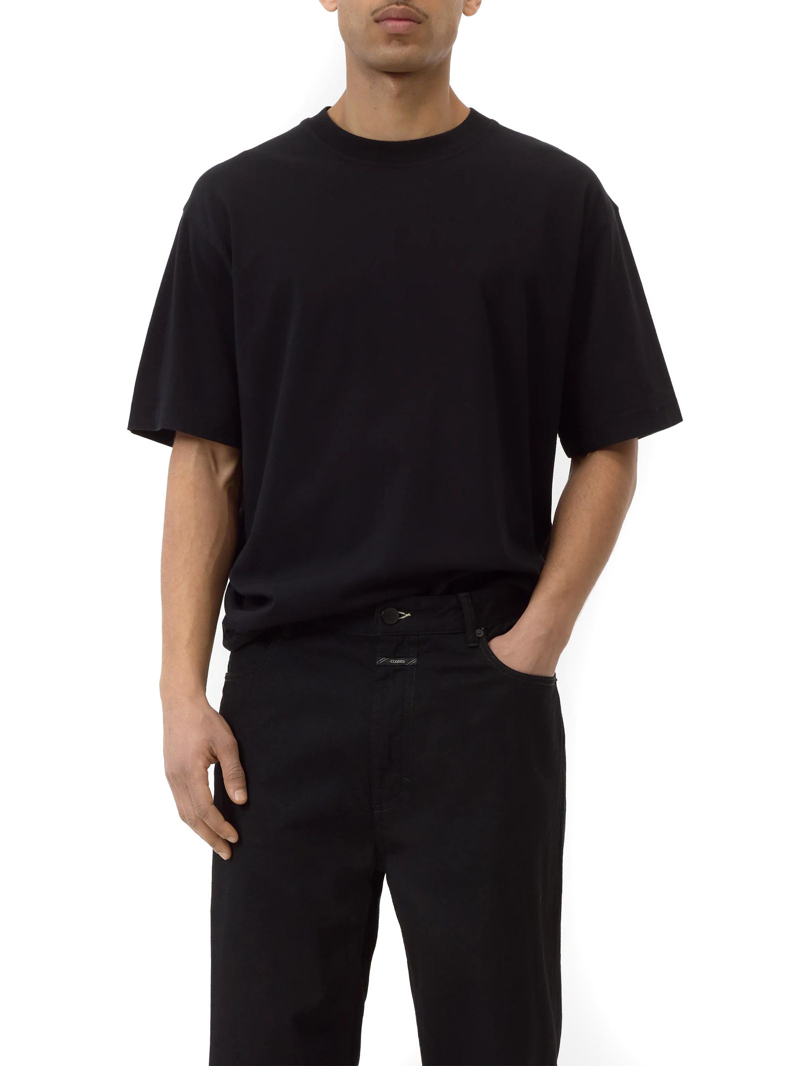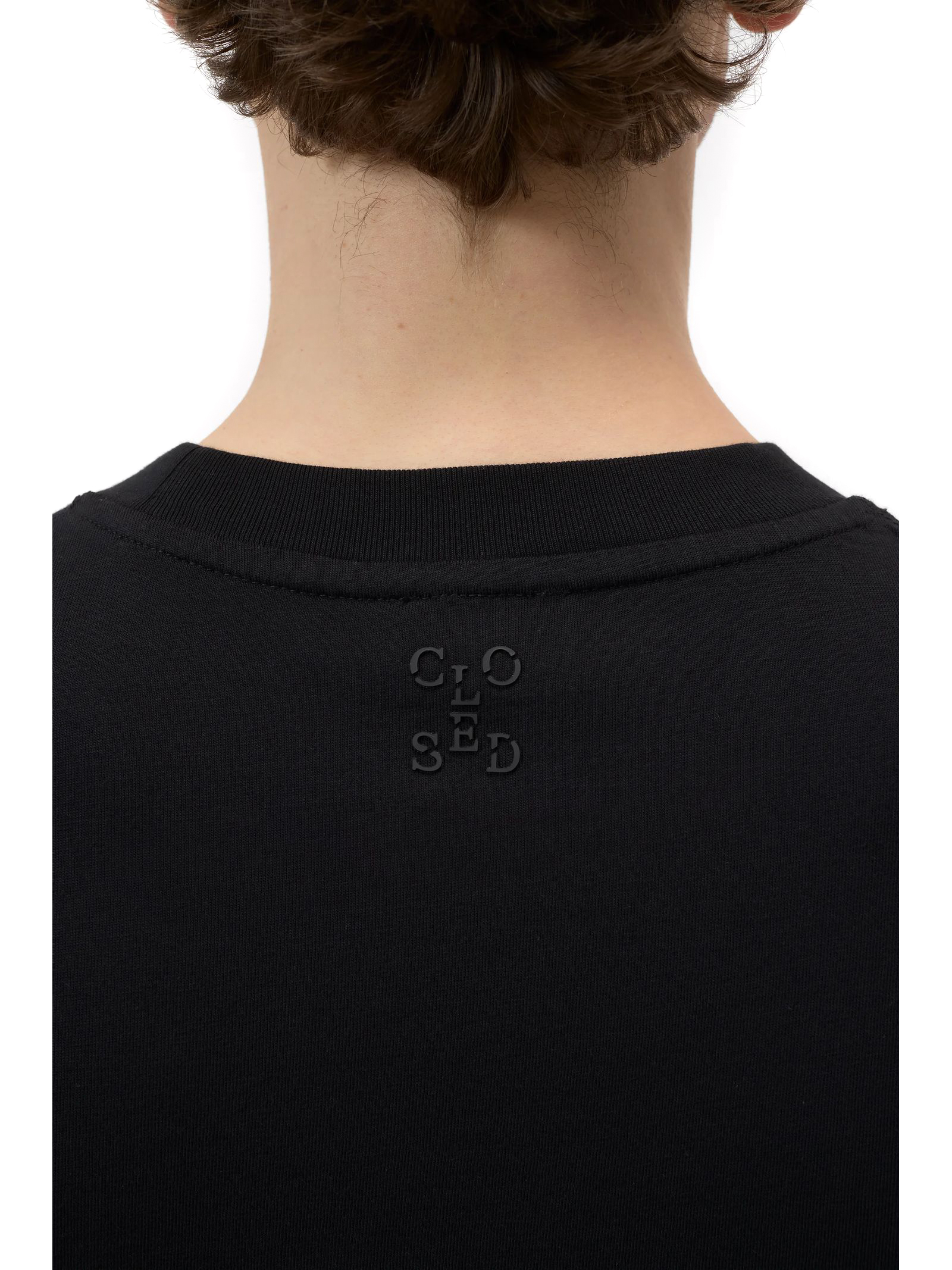 Black cotton T-shirt with a round neckline, subtle logo embroidery on the back, and straight hem and sleeves; comfortable fit