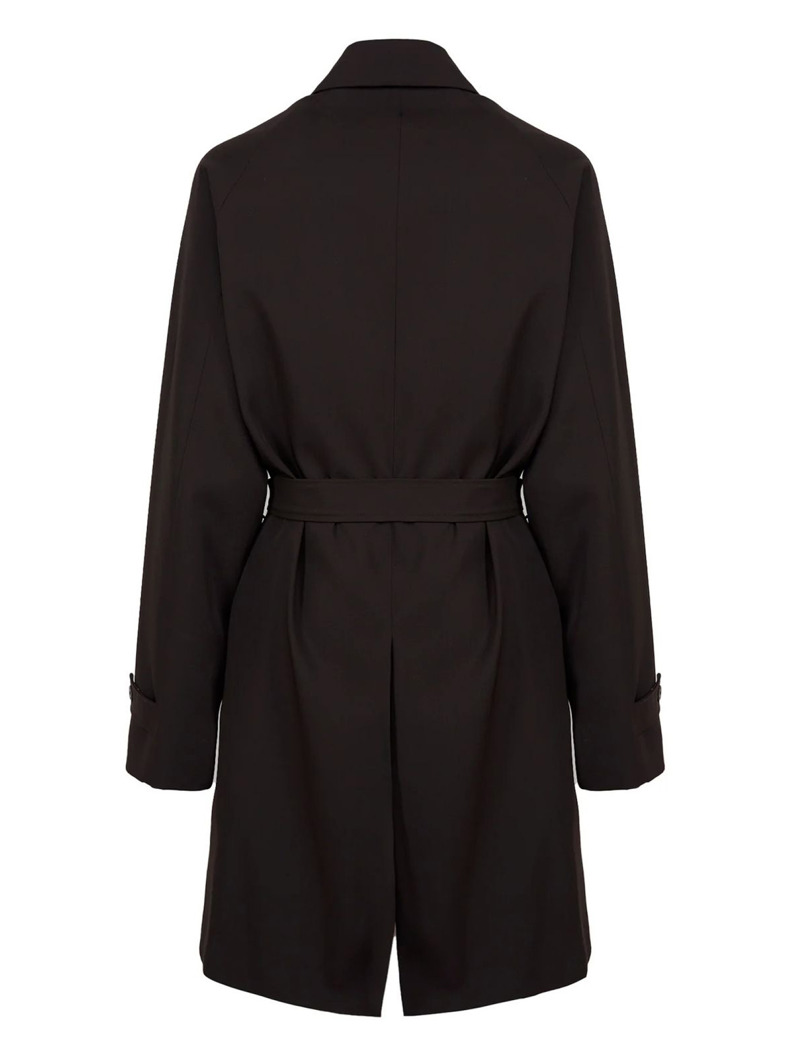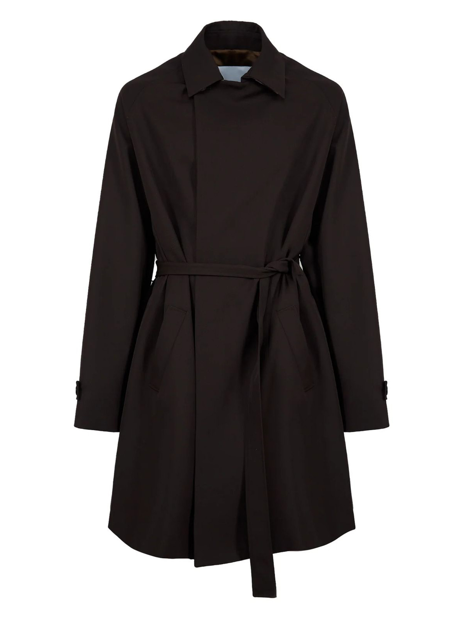 Brown Riko trench coat in technical wool, Italian collar, double-breasted closure with one visible button, belt at the waist, two side pockets, 55% PL, 45% WV