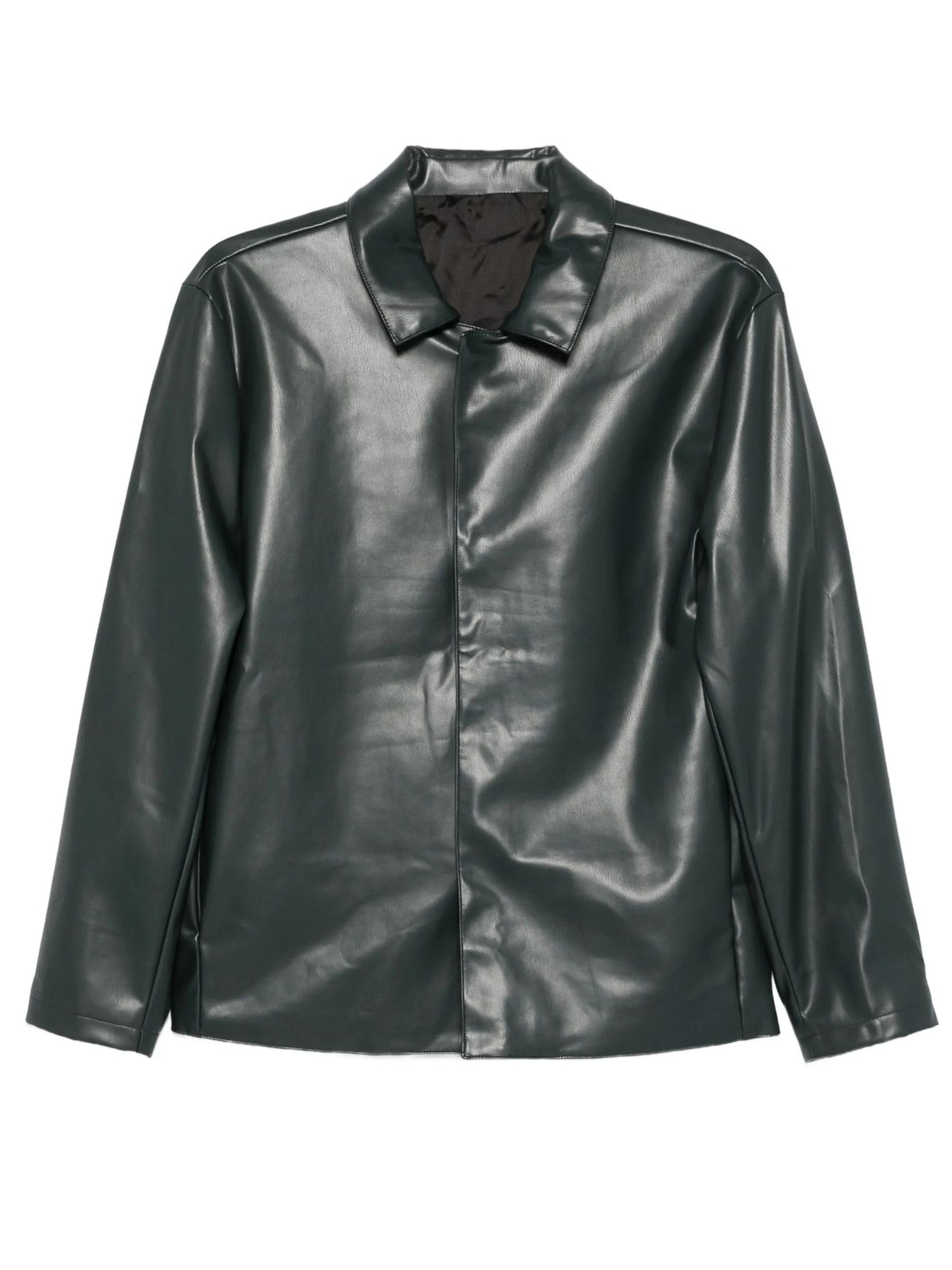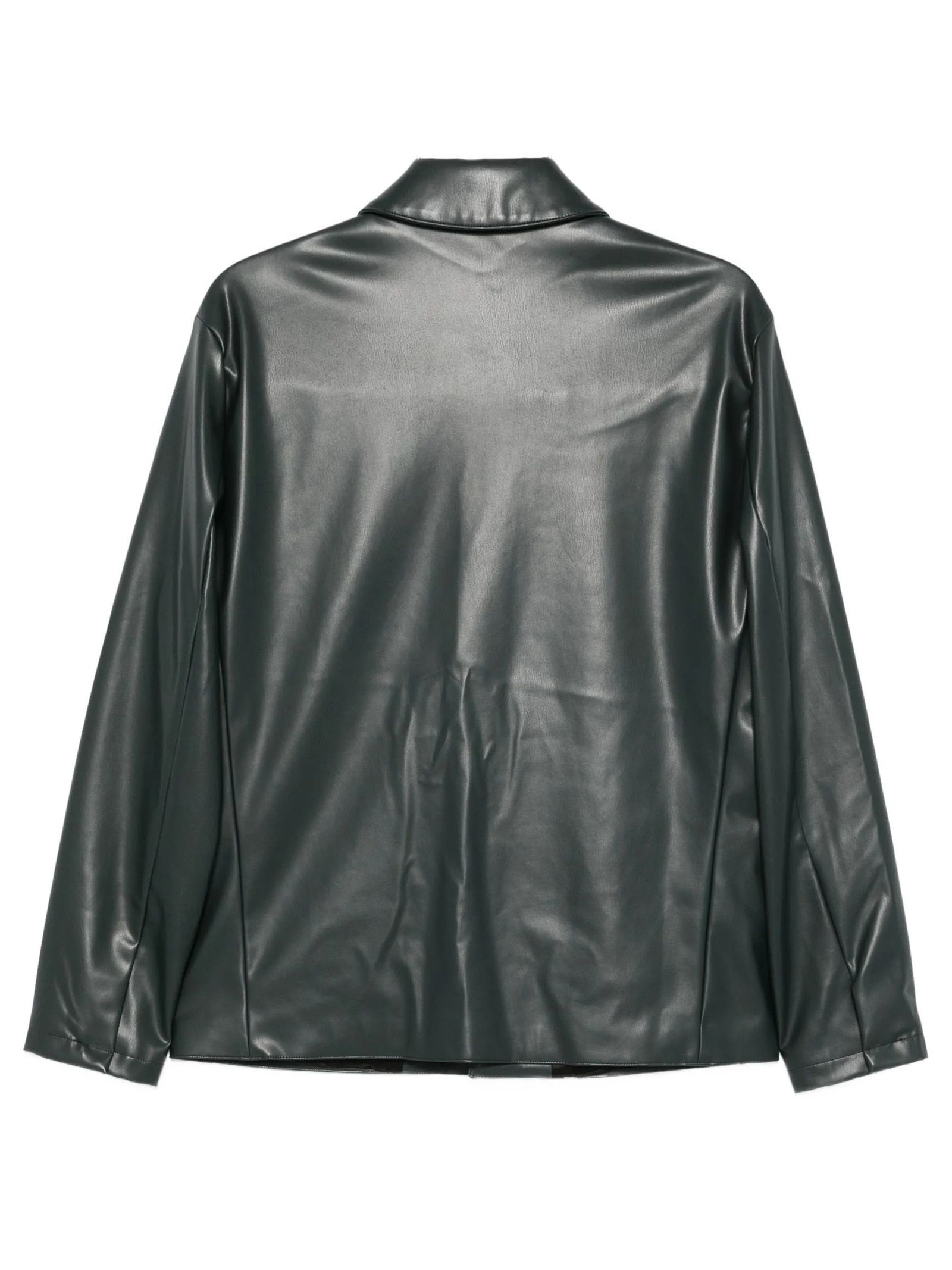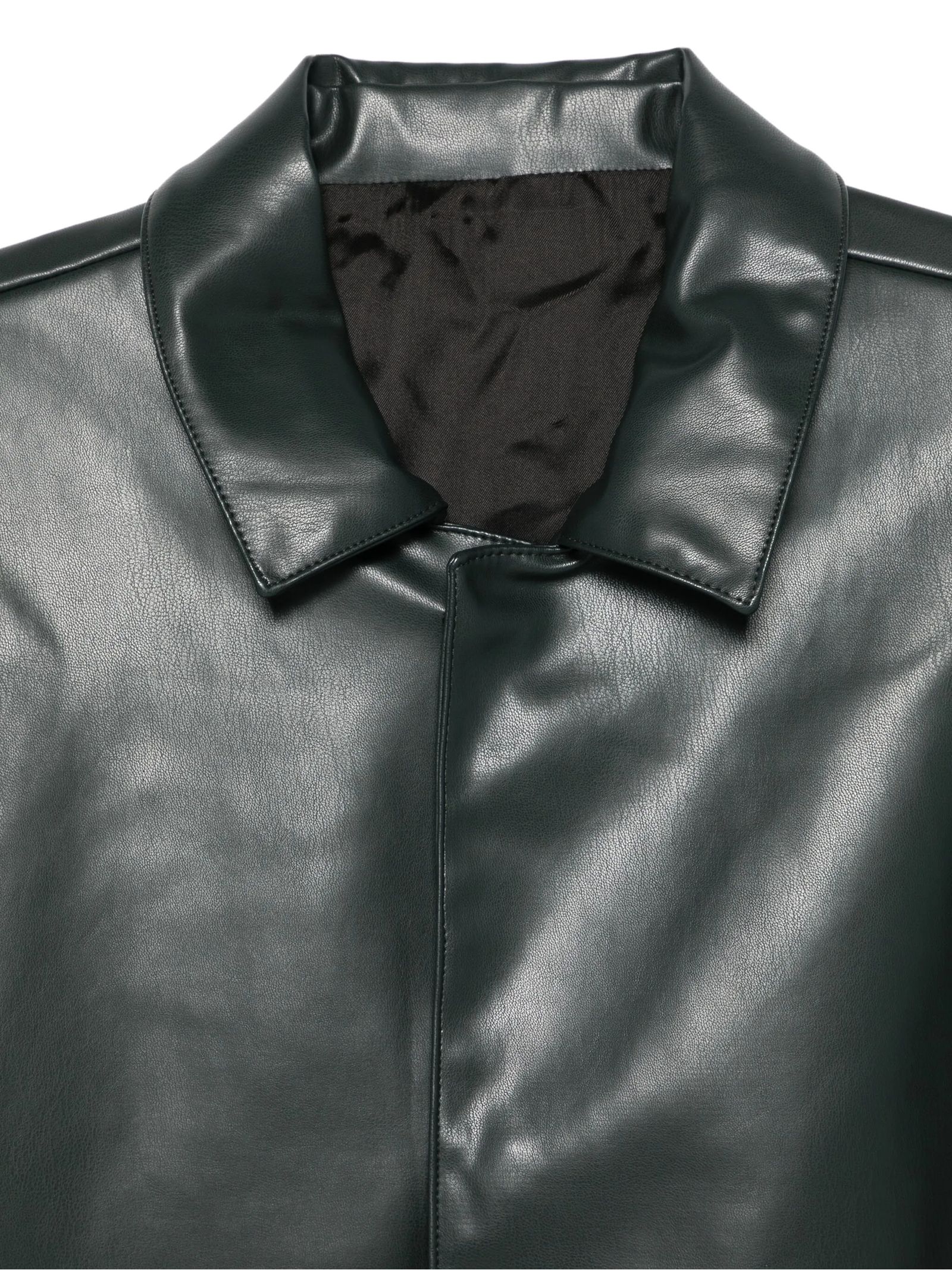 Dark green leather collar jacket, zip fastening, ribbed cuffs, ribbed hem, bomber silhouette, stand collar