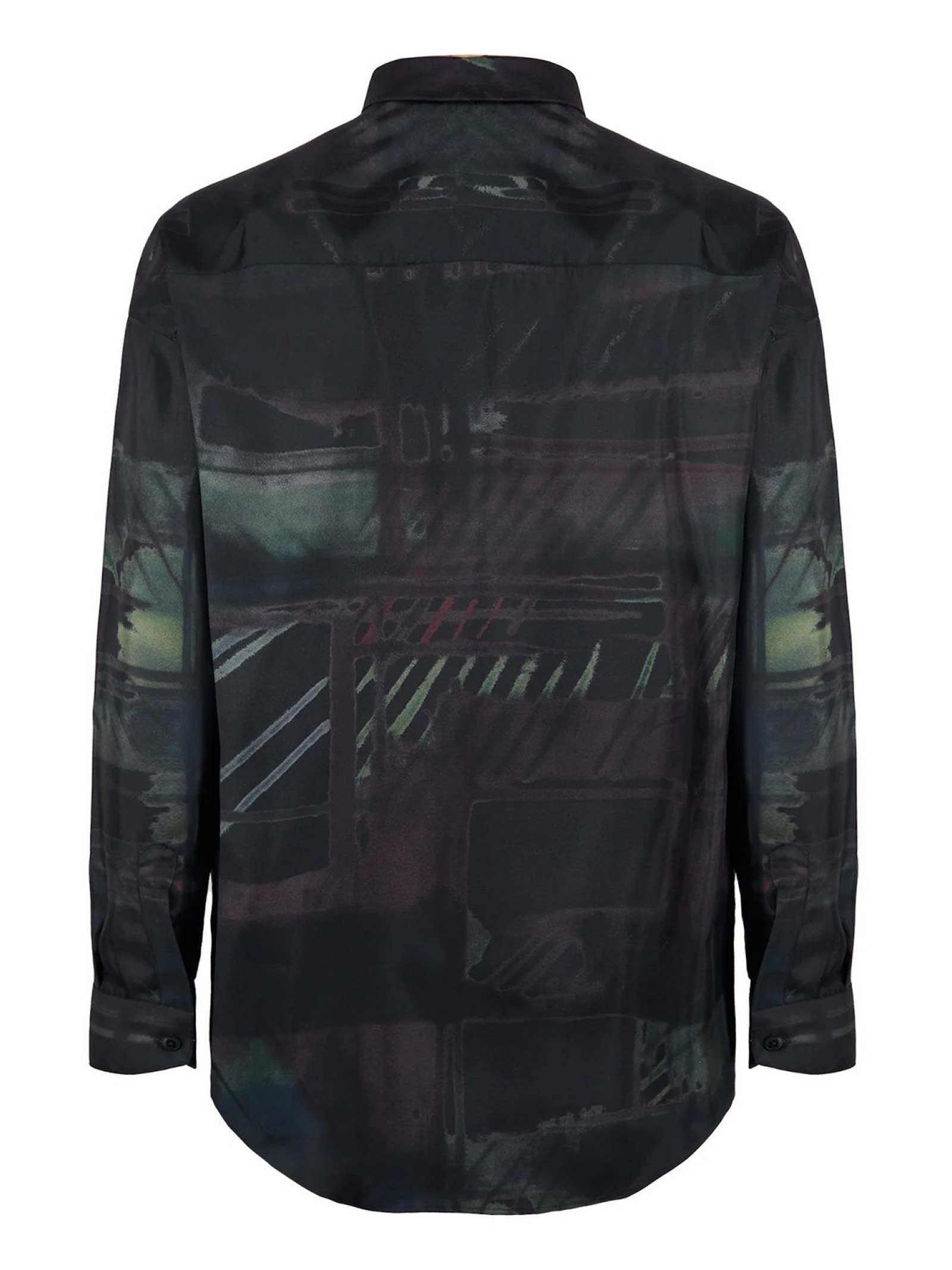 Valentino all-over printed silk shirt, abstract pattern on a midnight blue background, oversized fit, soft shoulders, Italian collar