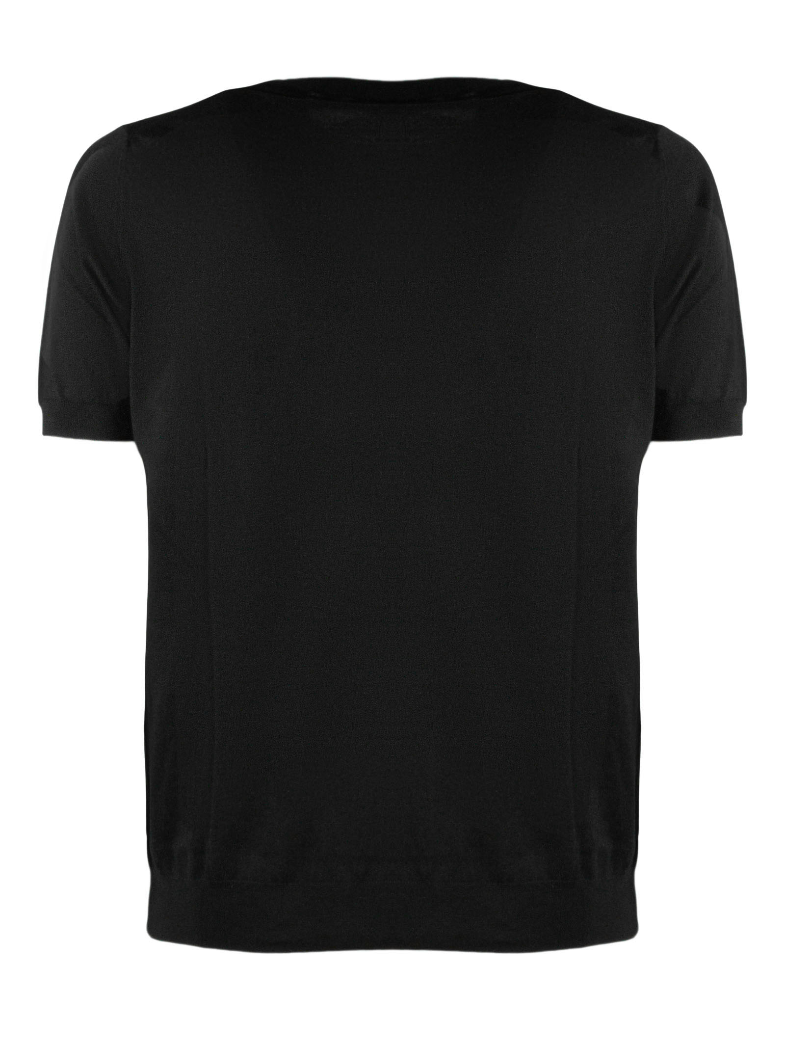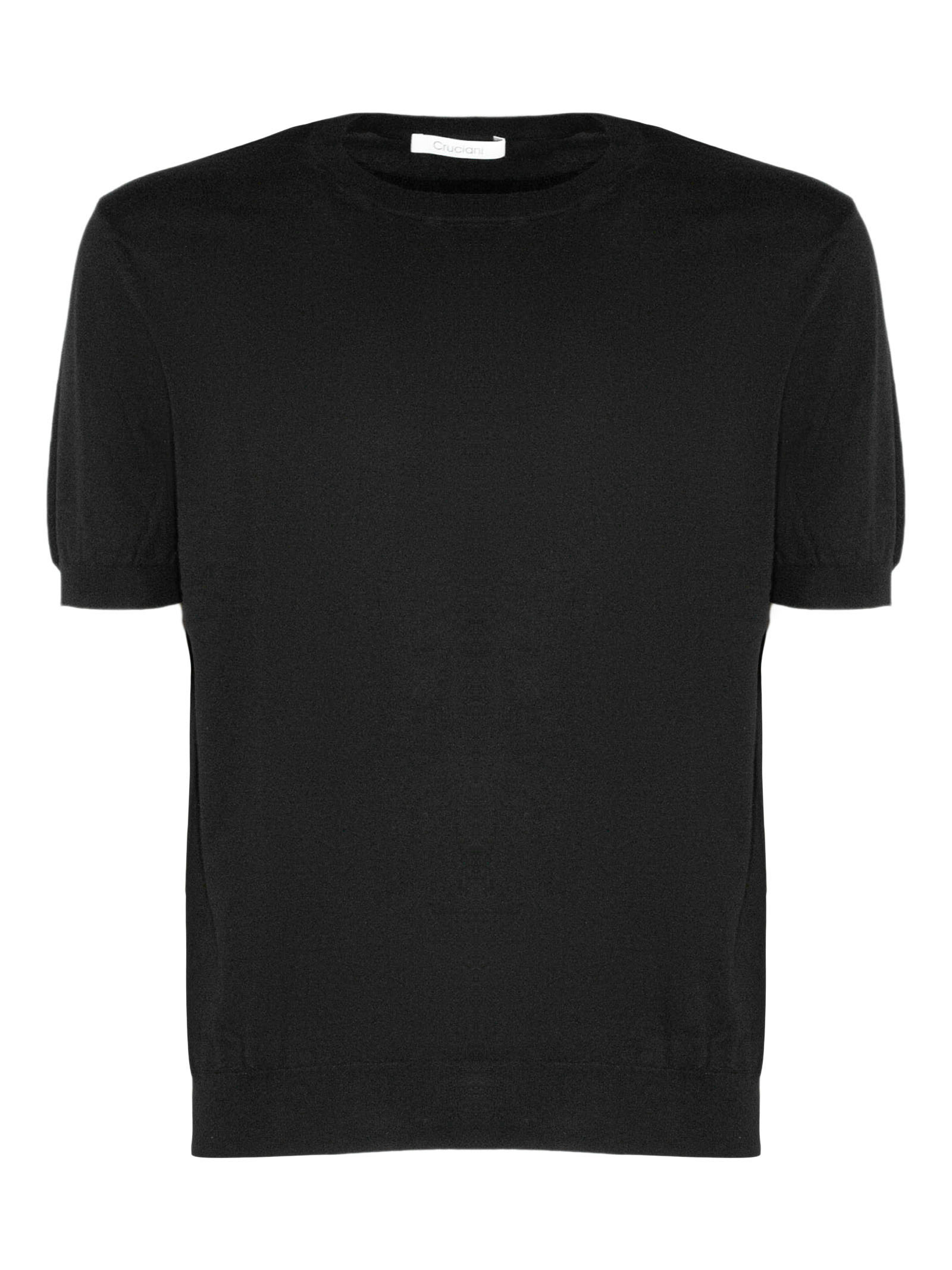 Black cotton knit T-shirt with short sleeves, crew neck, and elastic ribbed trim