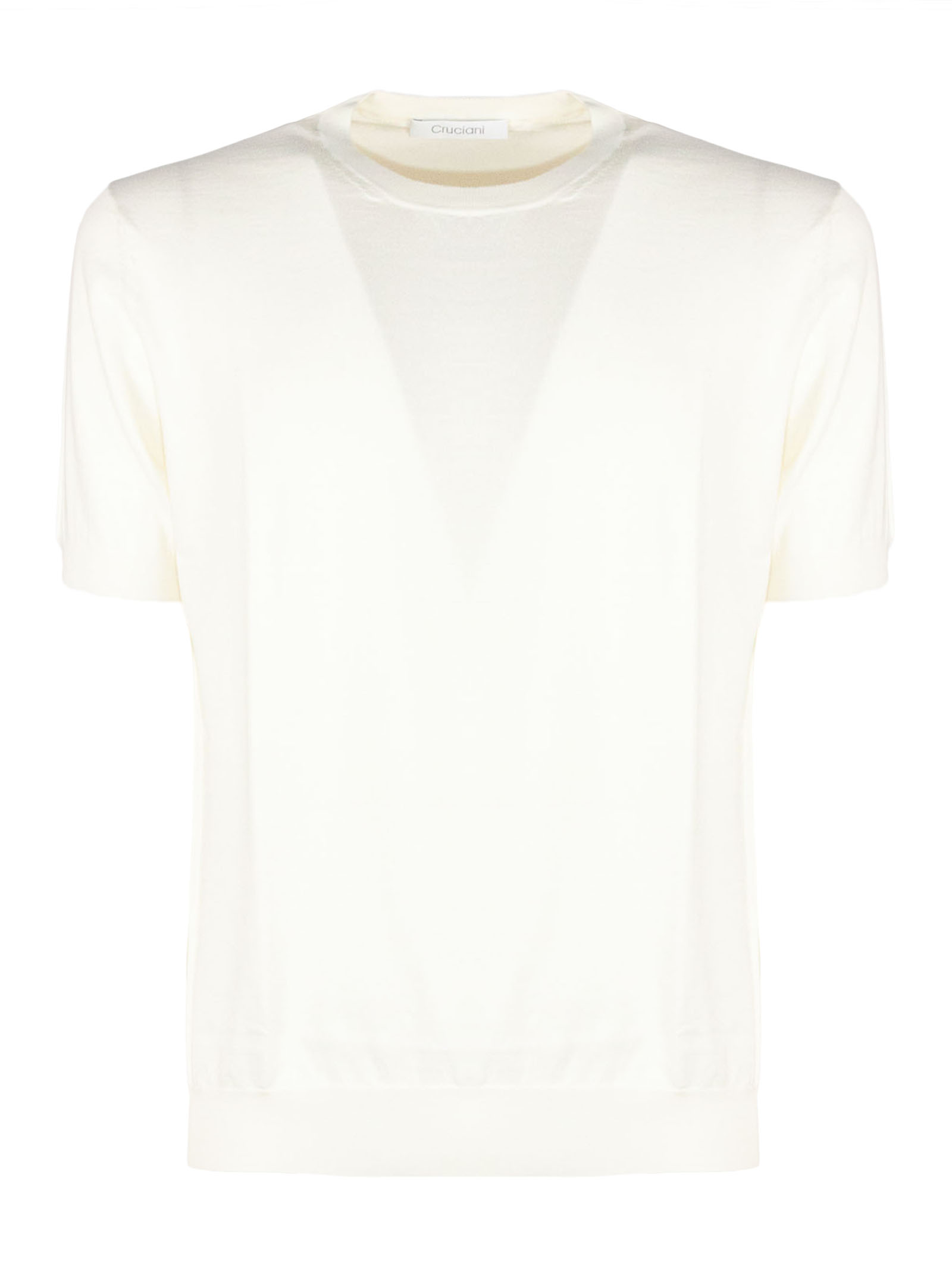 Cream white cotton knit T-shirt with short sleeves, crew neck, and elastic ribbed trim