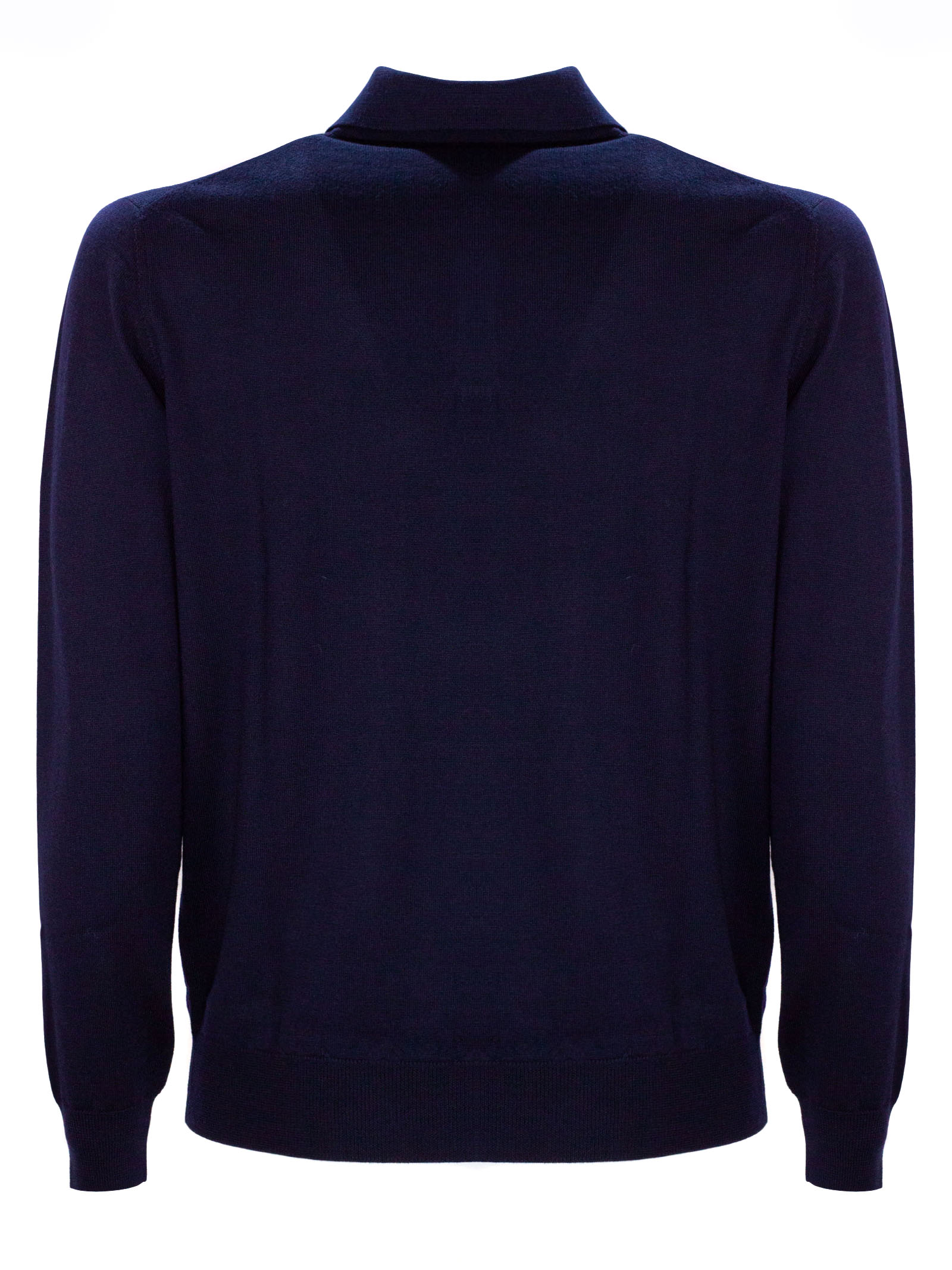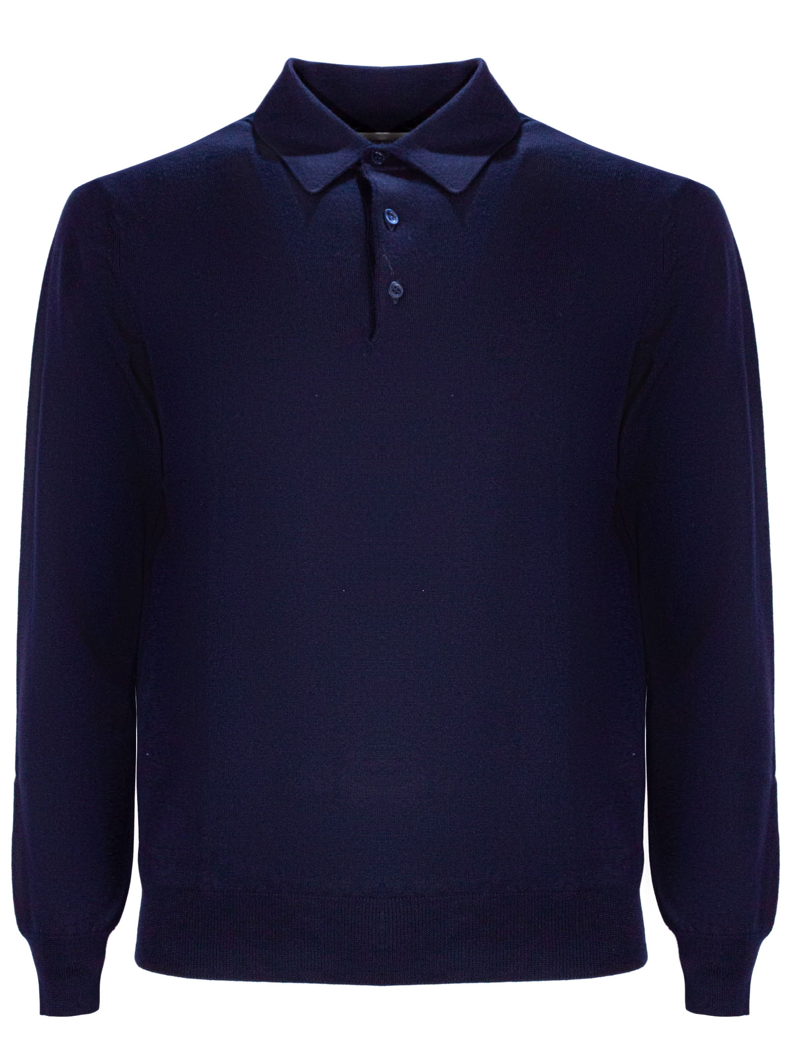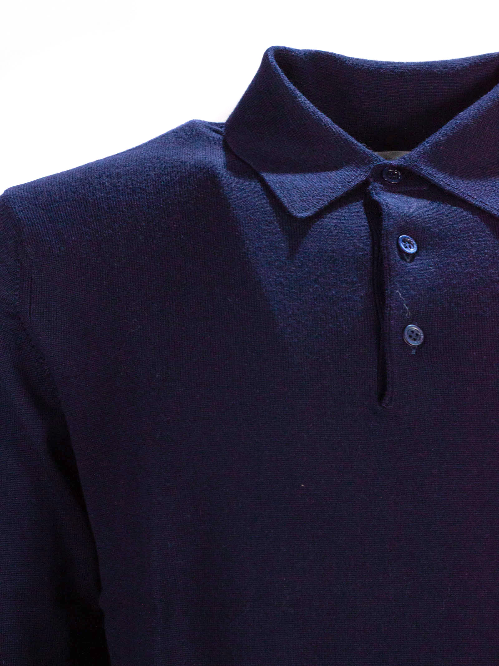 Long-sleeved blue wool polo shirt with polo collar and button fastening, ribbed trim