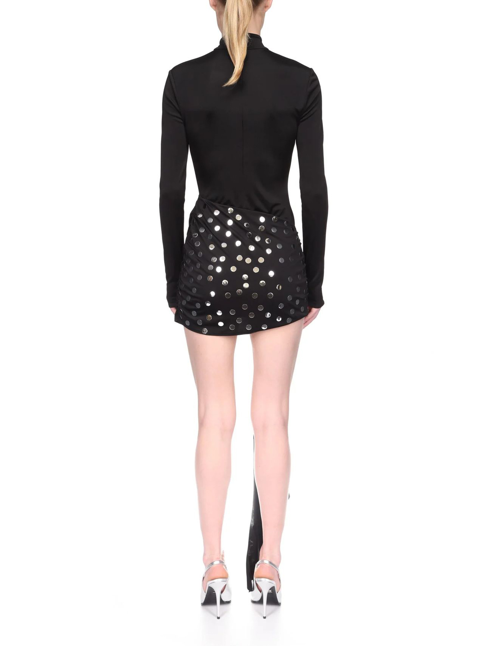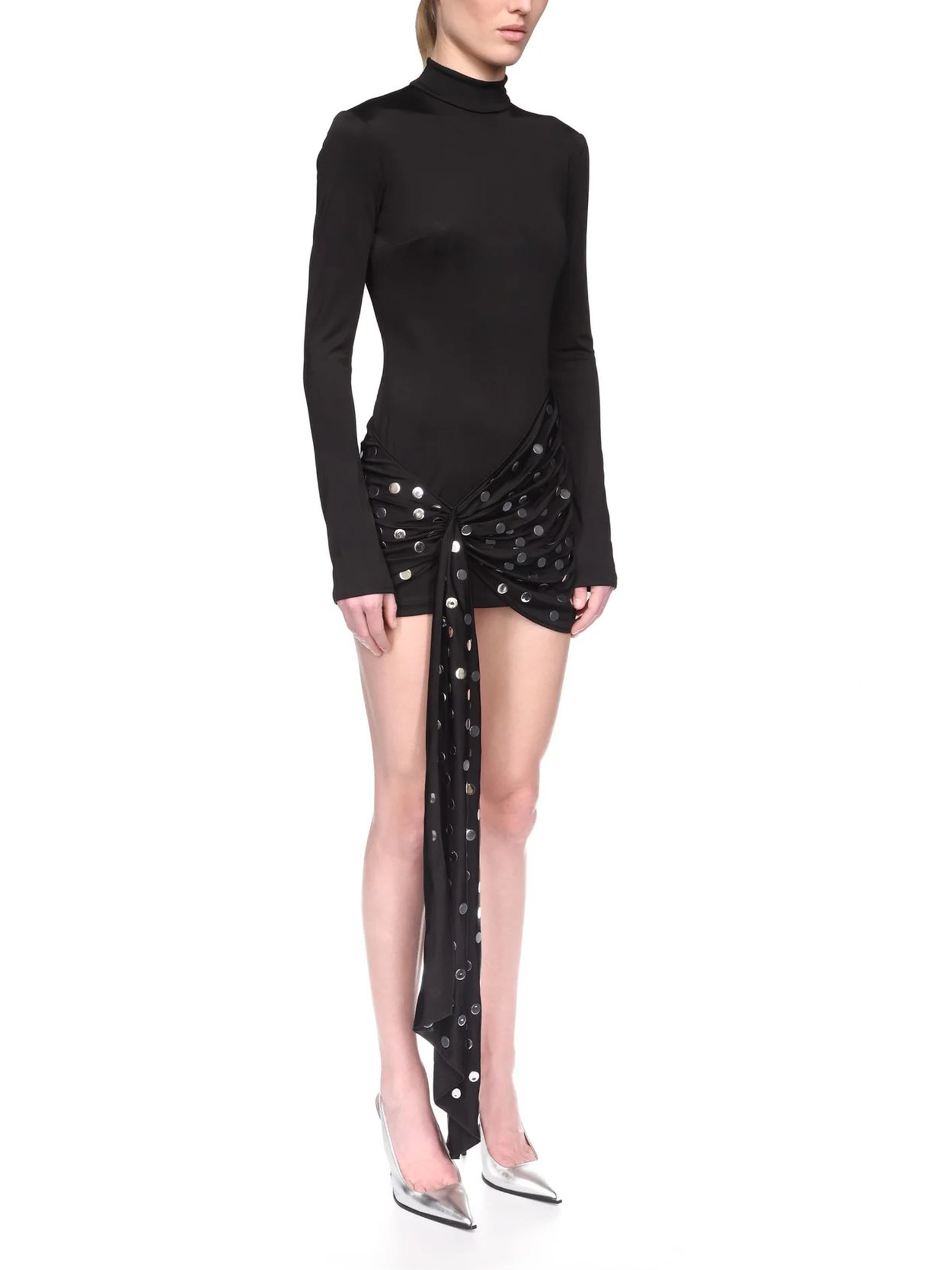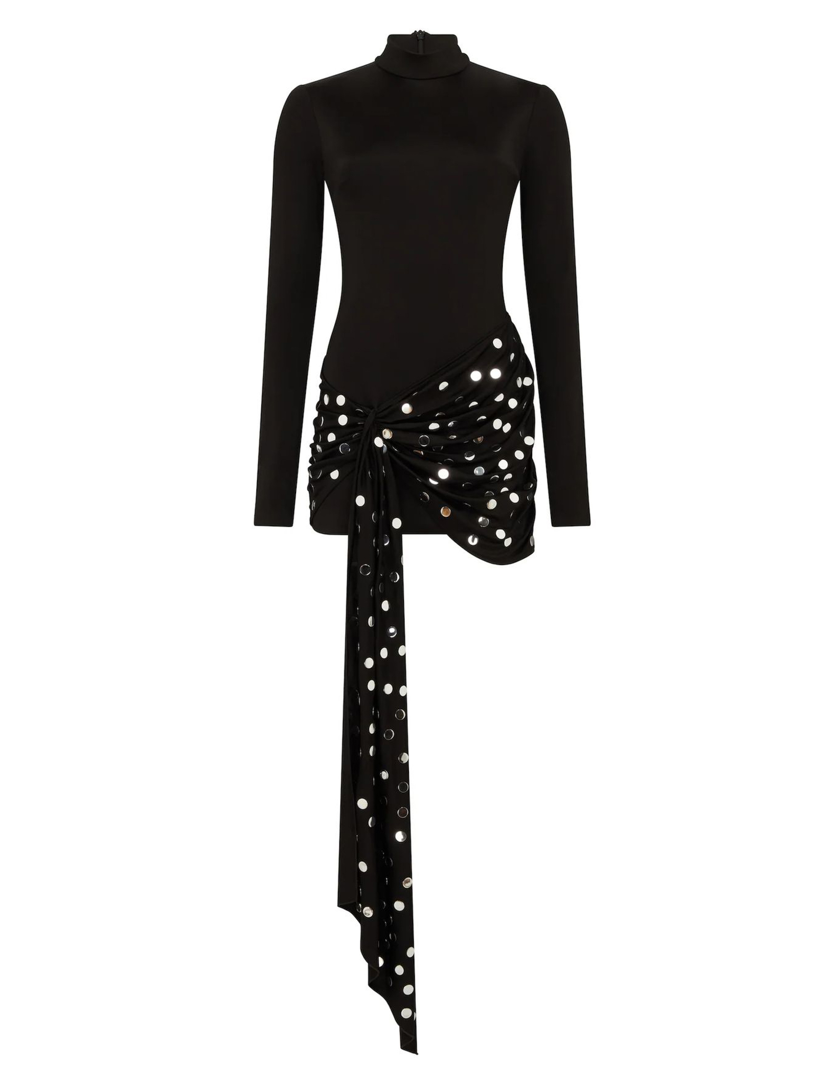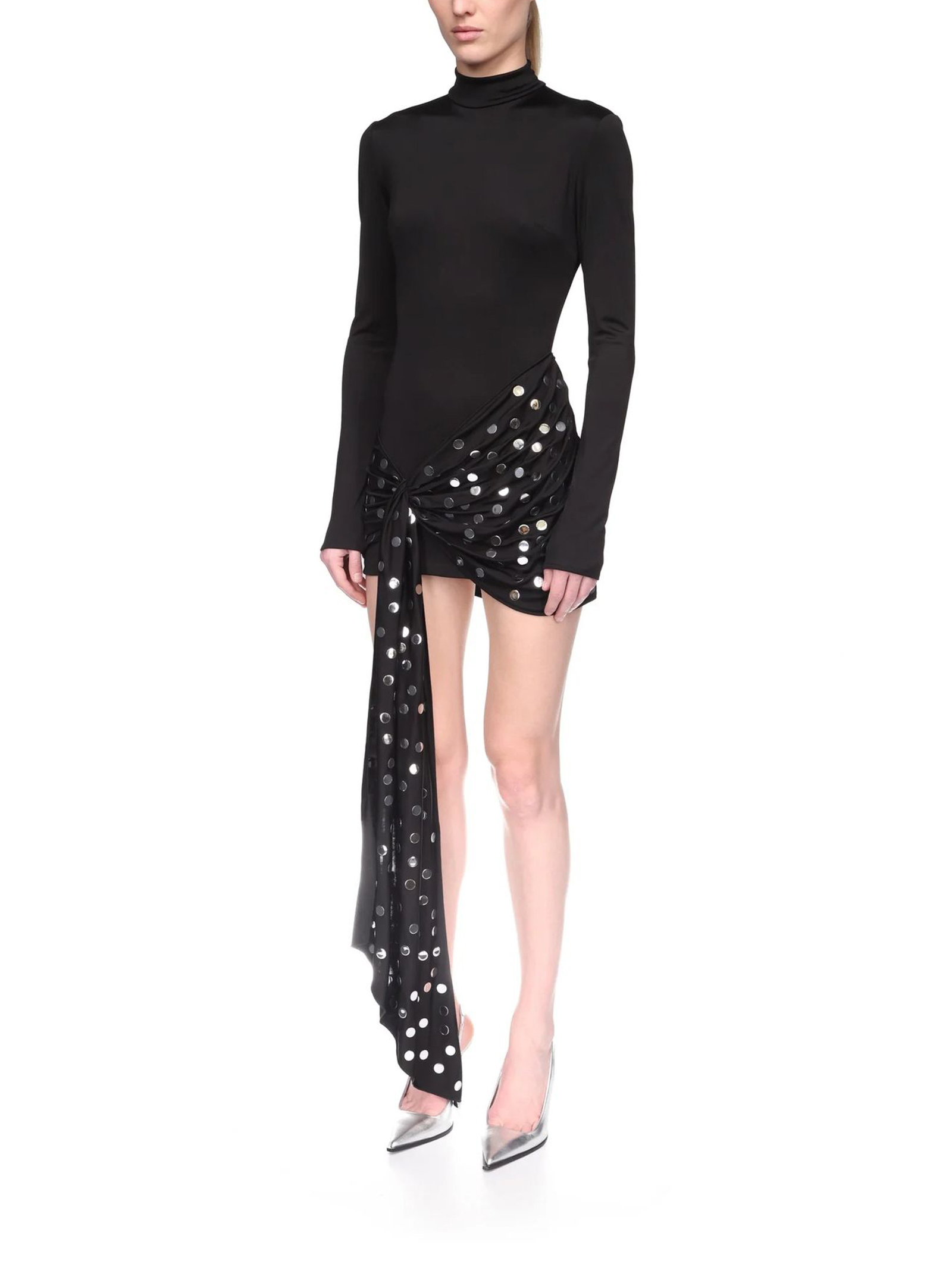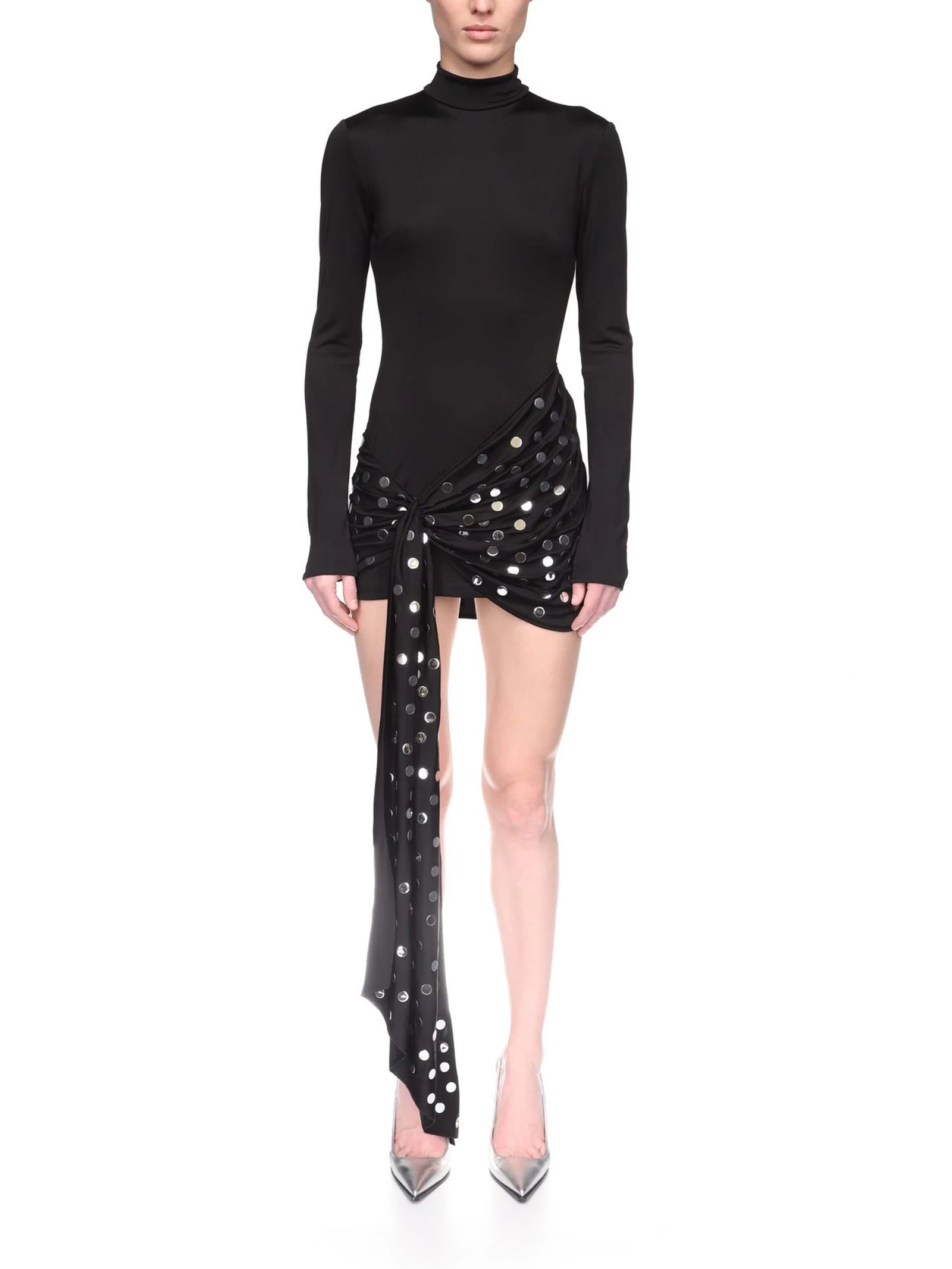 Silver Polka-Dots Overlay Mini Dress, black fluid jersey, this figure-hugging mini dress has a high neck and long sleeves. It features an asymmetric overlay detail at the hip with silver hotfix polka-dots. This dress fastens with a hidden zip closure at the back
