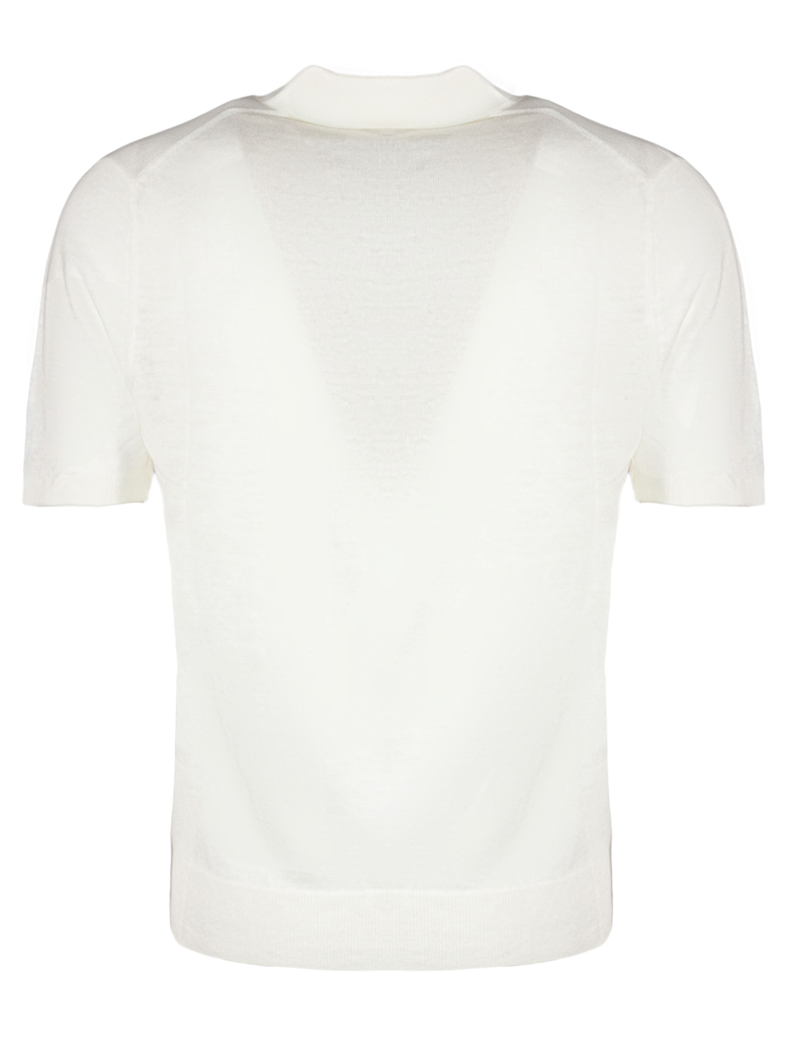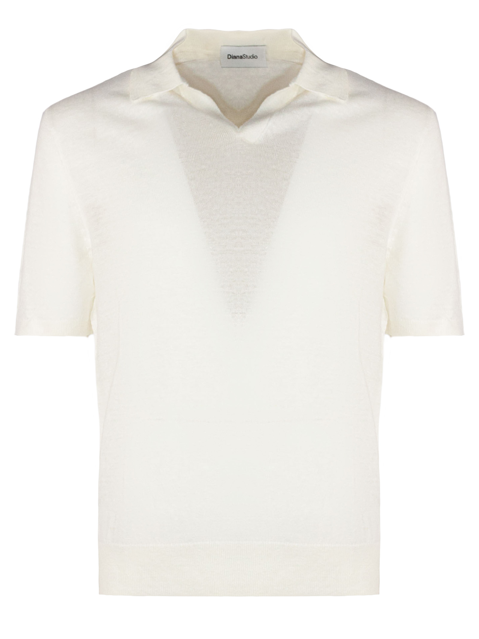 White linen blend polo shirt with classic soft collar, short sleeves, ribbed trim