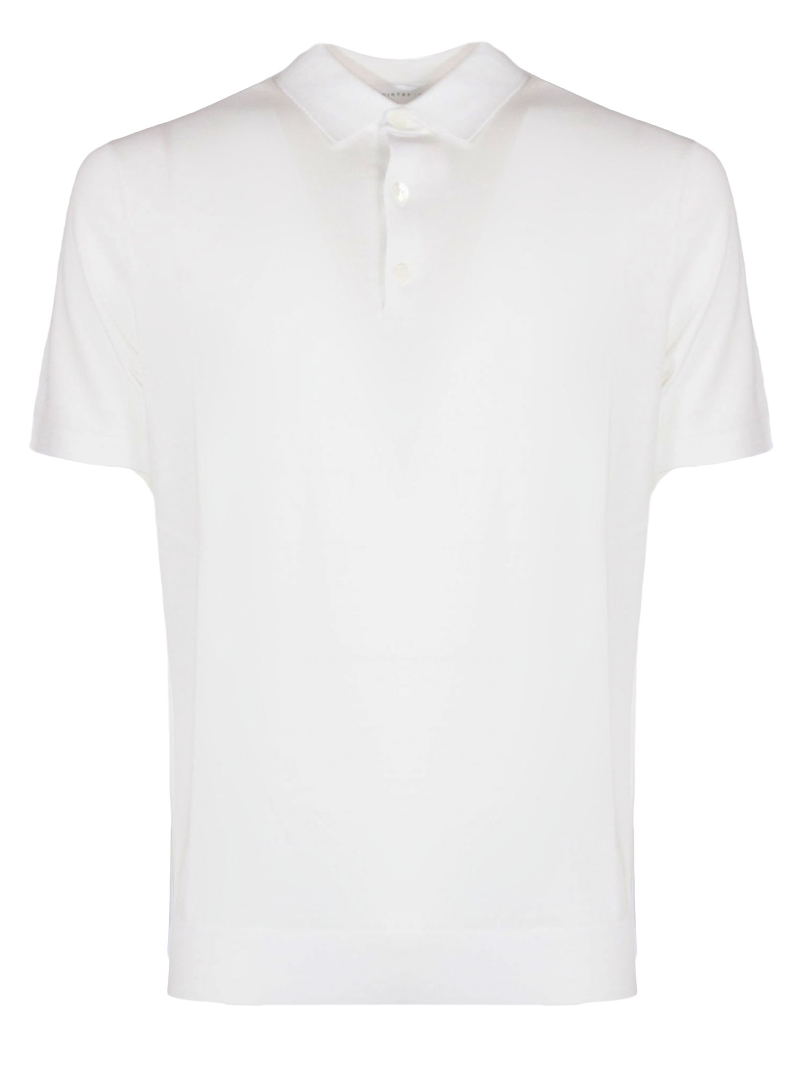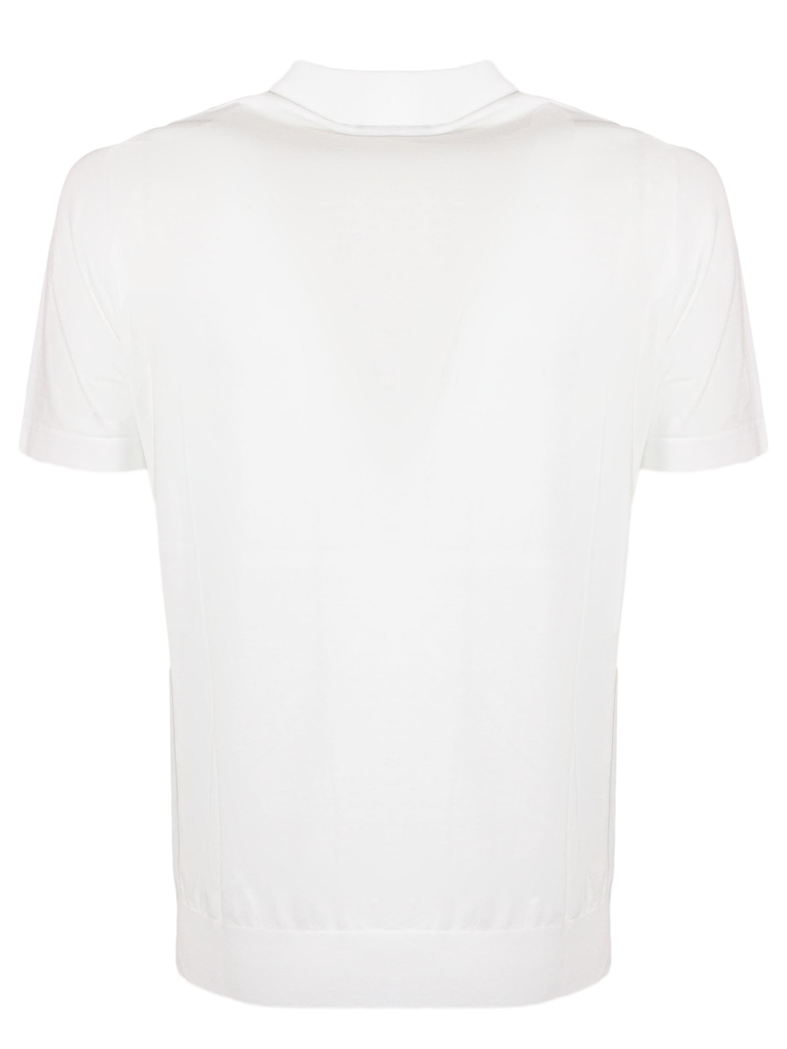 White cotton polo shirt with classic collar, short sleeves, button fastening, ribbed trim