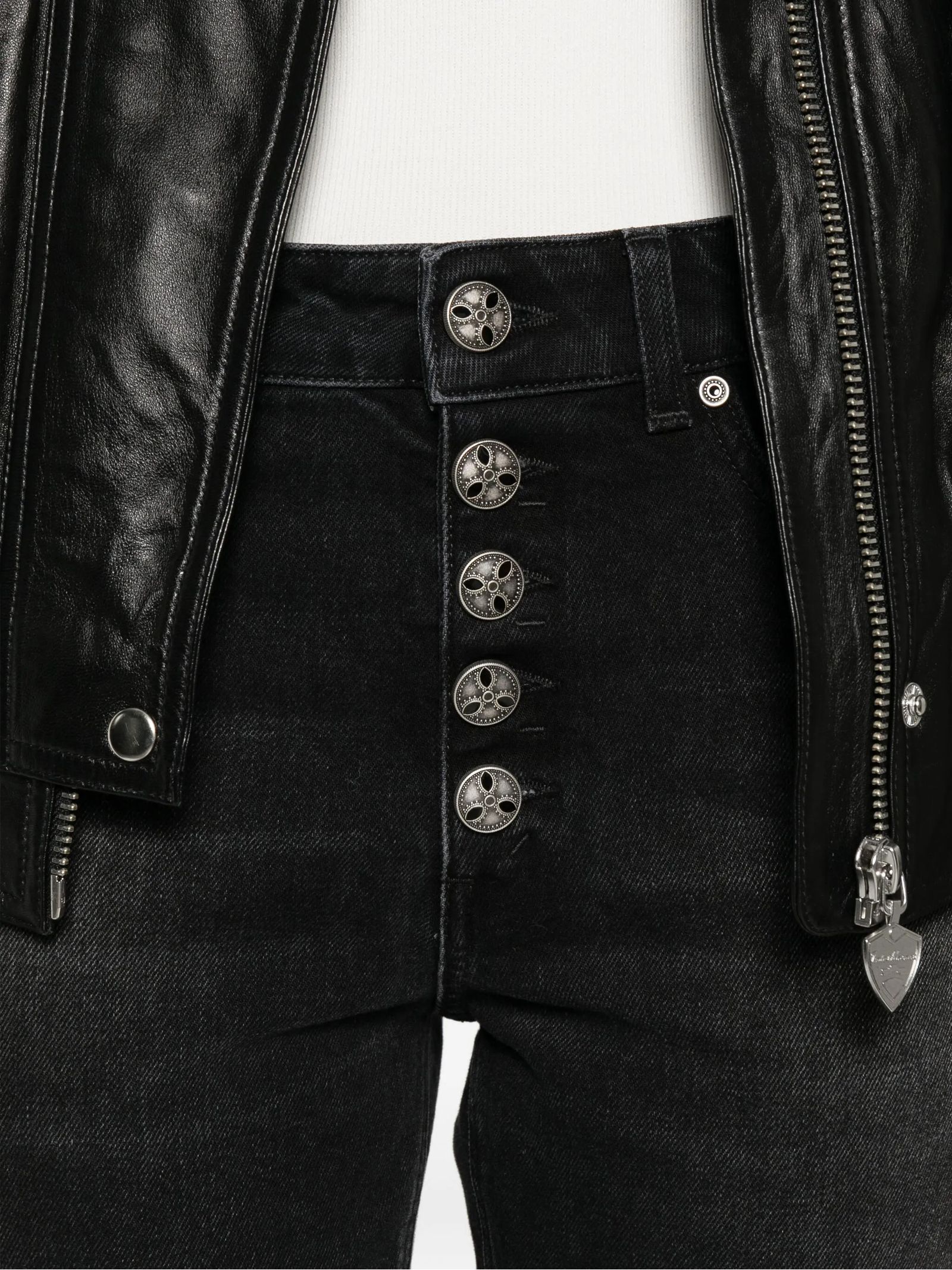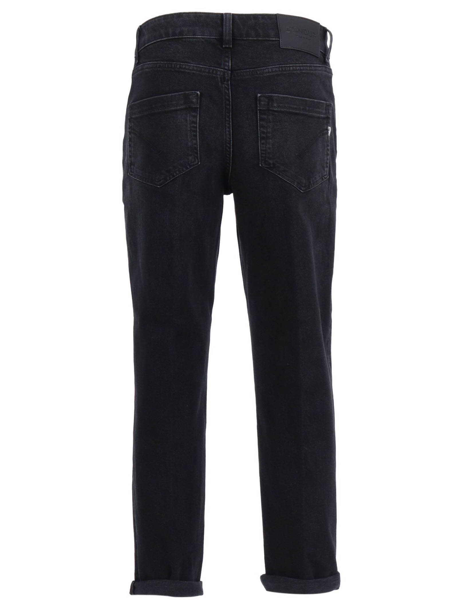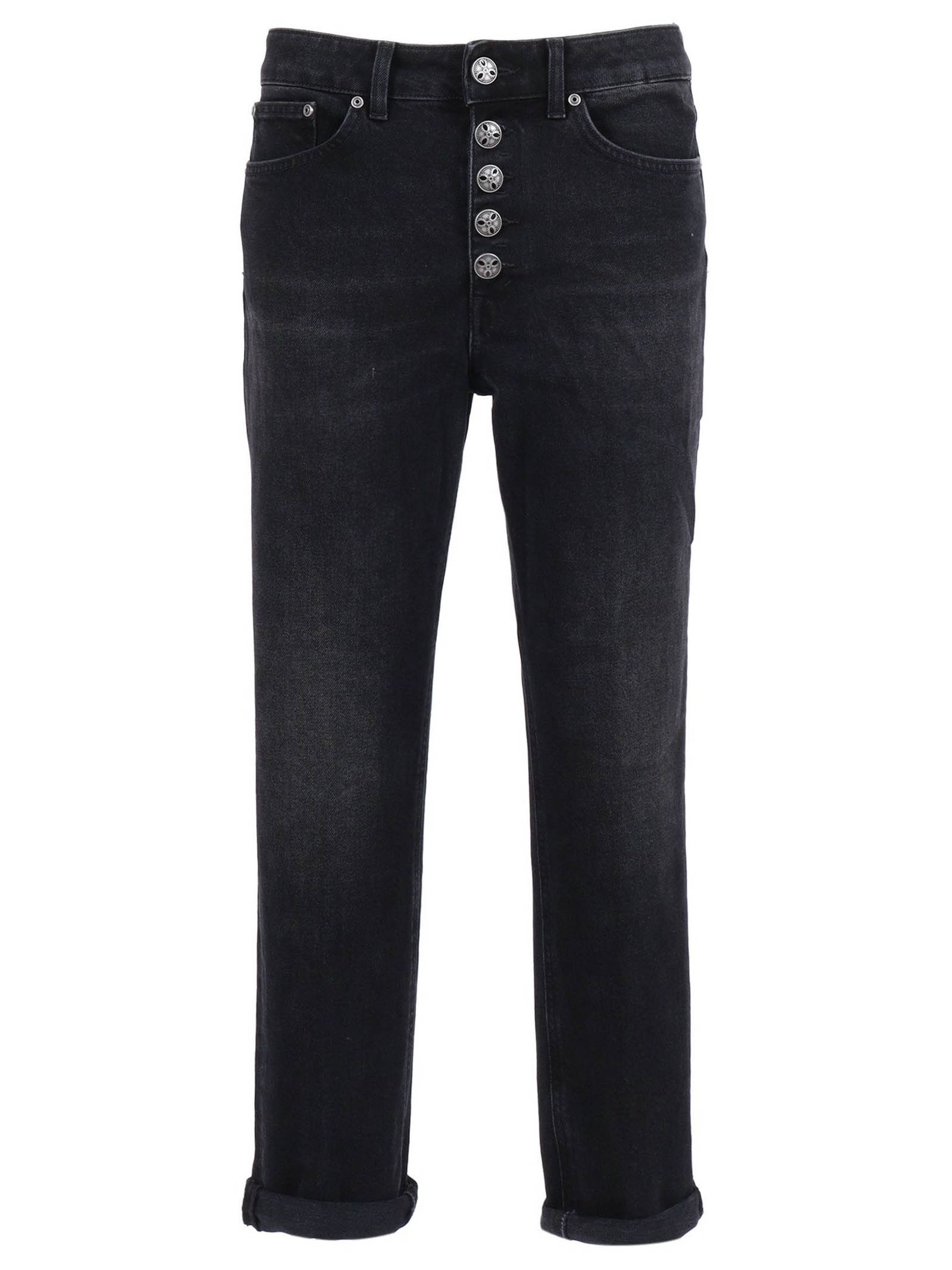 Black cotton cropped boyfriend jeans, classic five pockets, rolled cuffs, front button fastening, belt loops