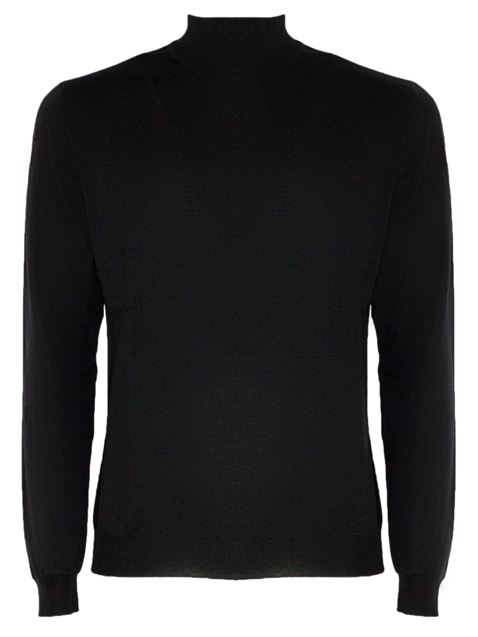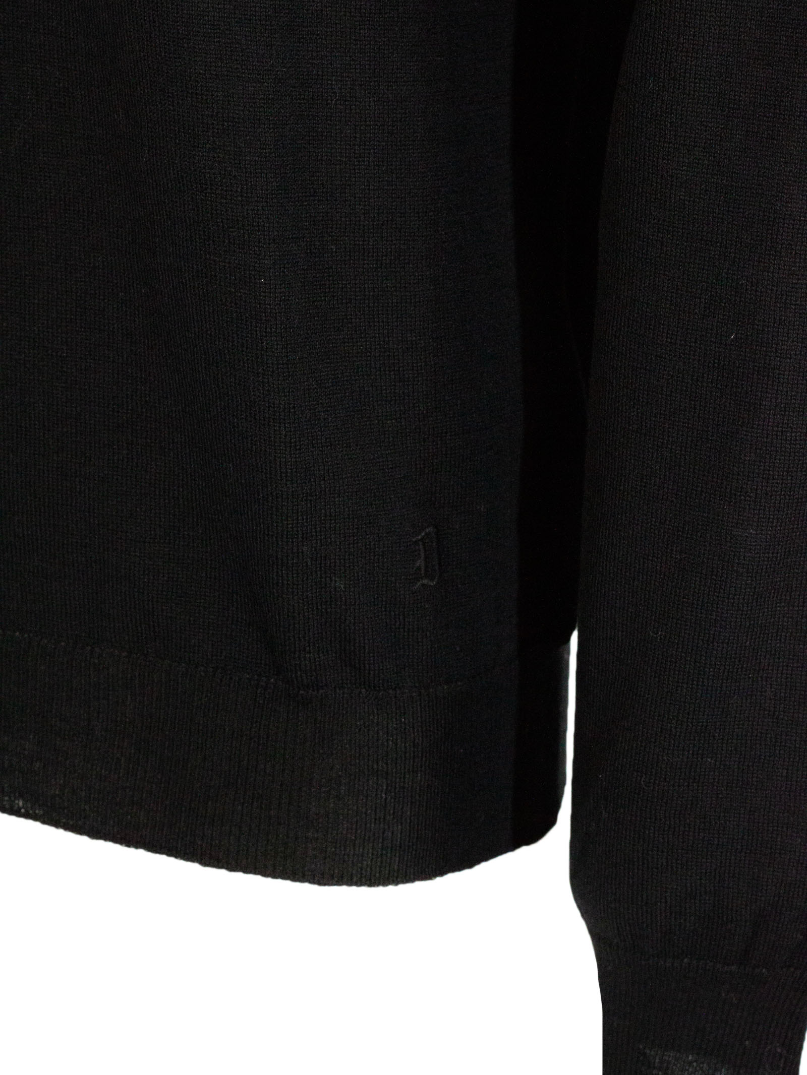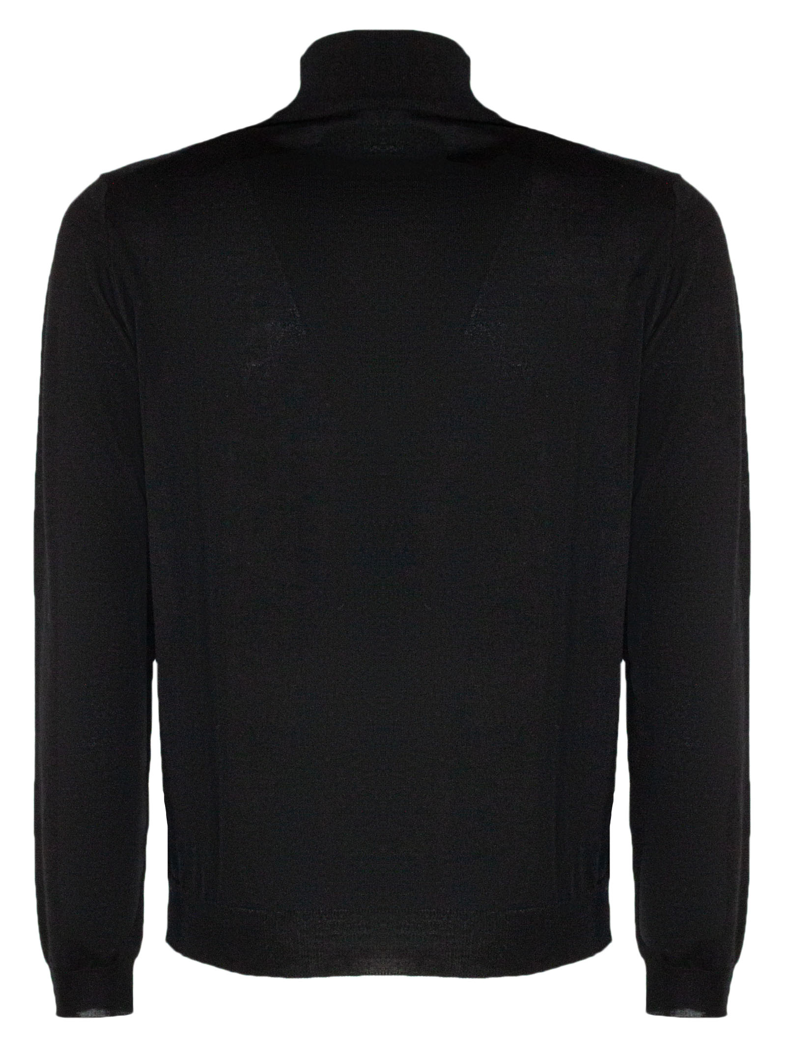 Black wool and cotton blend turtle neck jumper with long sleeves, ribbed trim and logo detail on the back