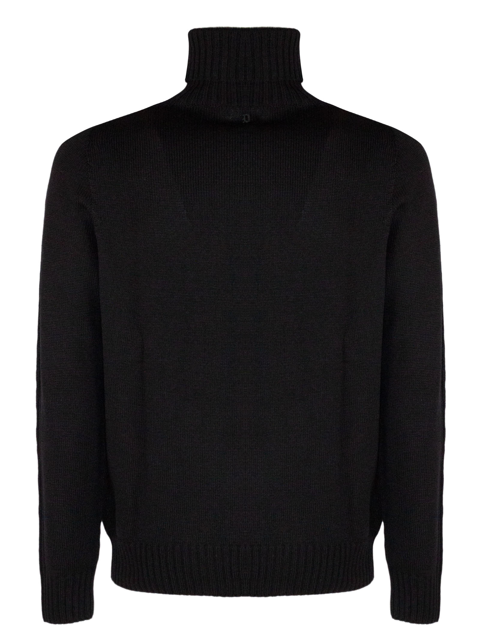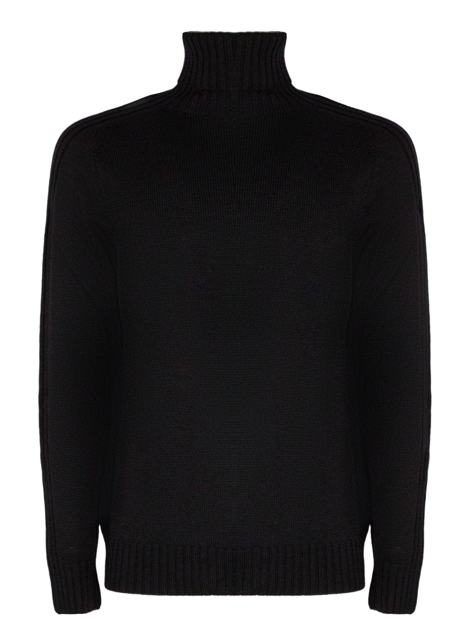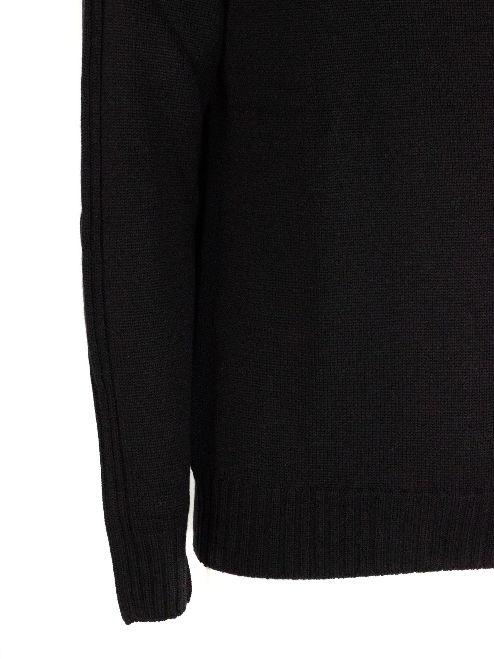 Black wool jumper with a high neck, long sleeves, ribbed trim and a metal logo detail on the back