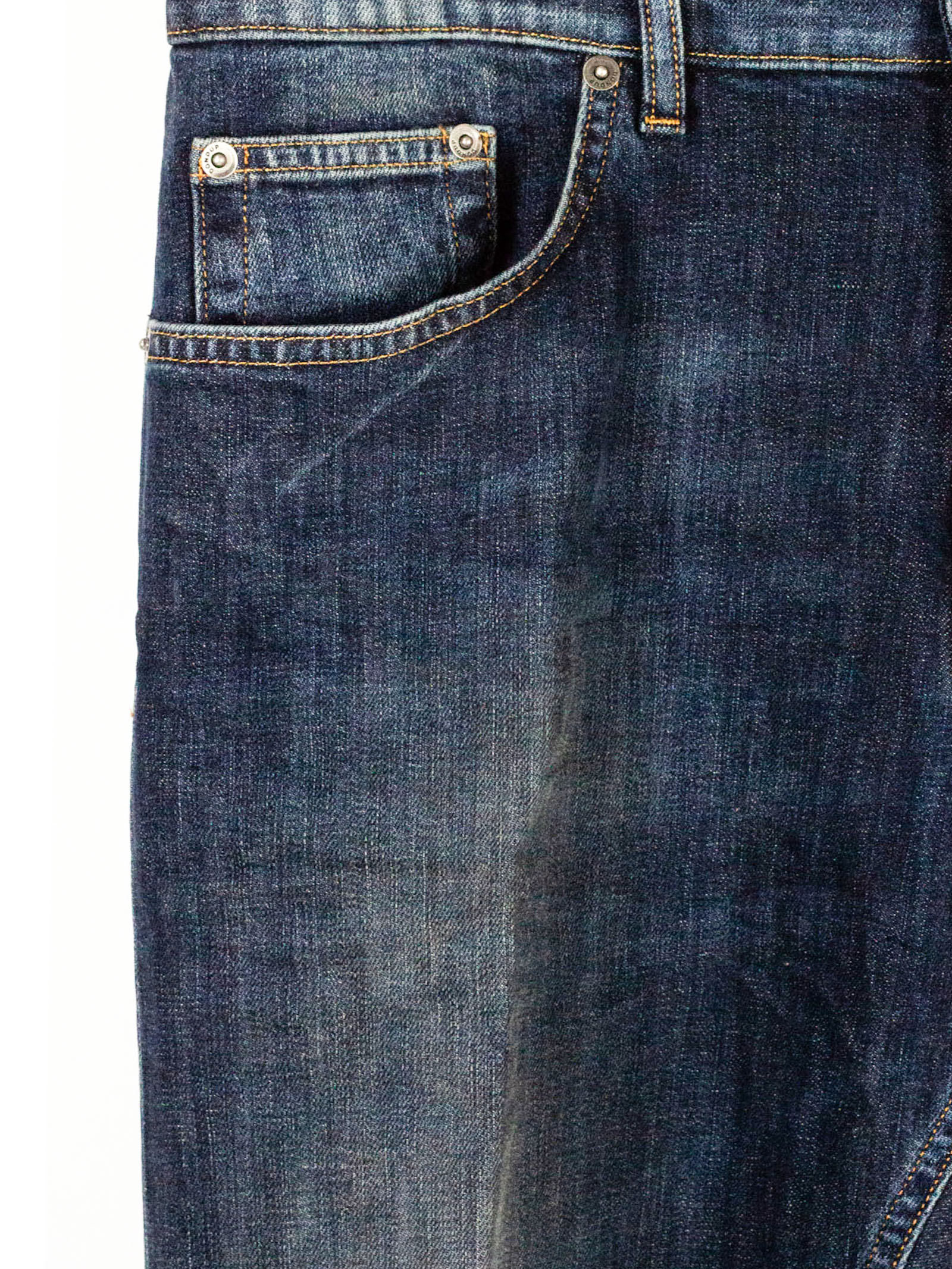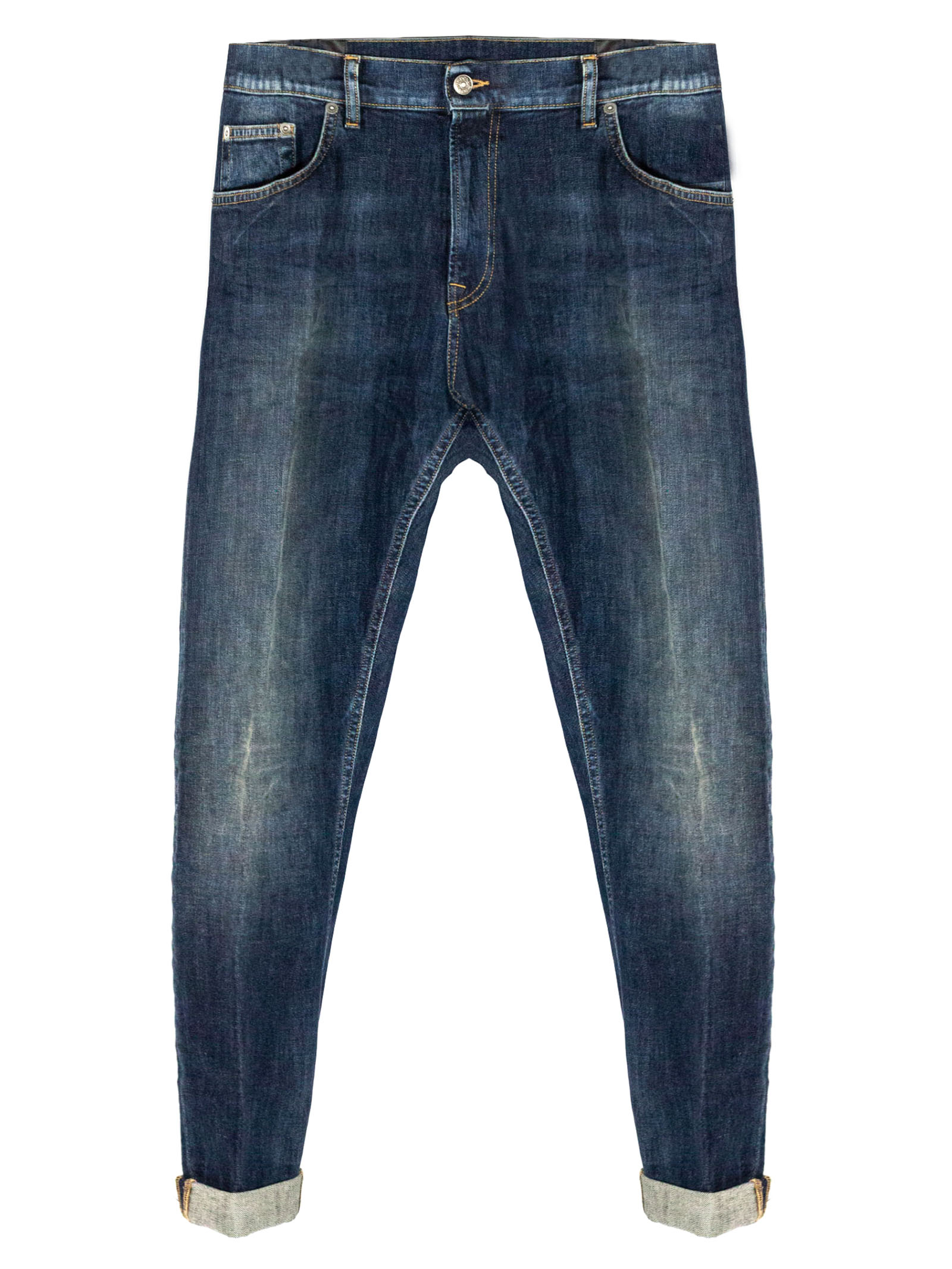 Blue denim jeans with a distressed effect and faded wash, featuring a low rise, tapered cut and turned-up hem, five pockets, contrasting stitching and button and zip fastening, regular fit, 98%cotton 2%Elastane