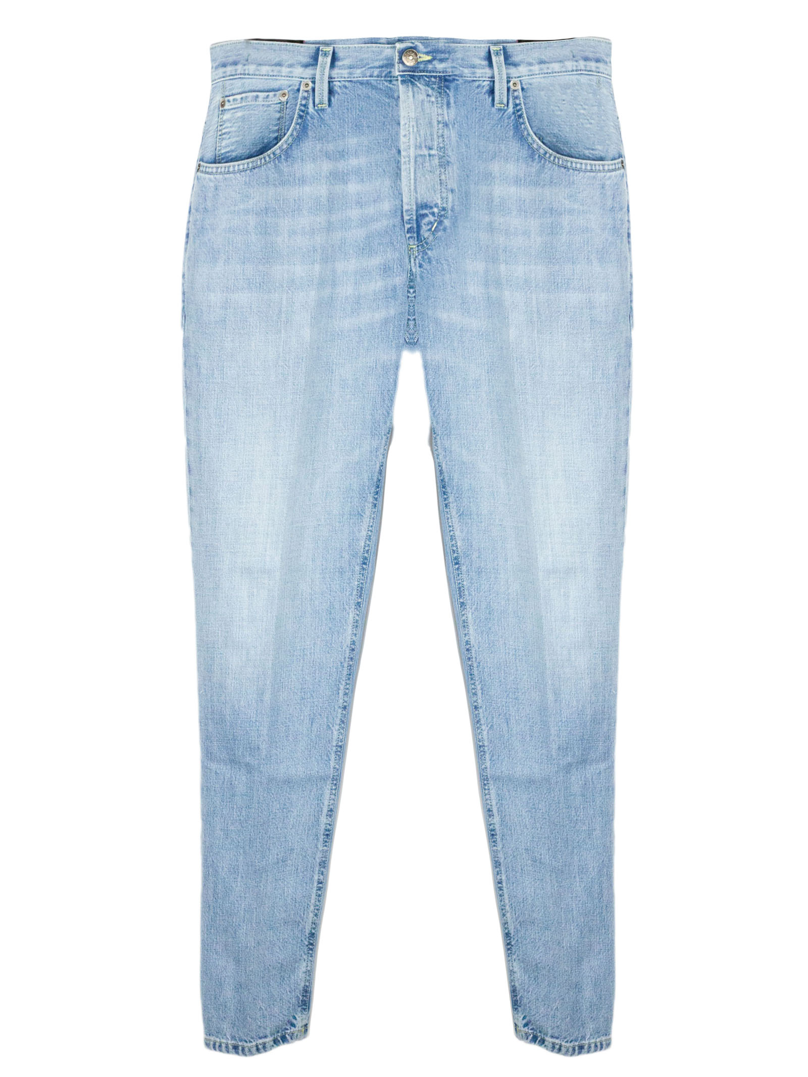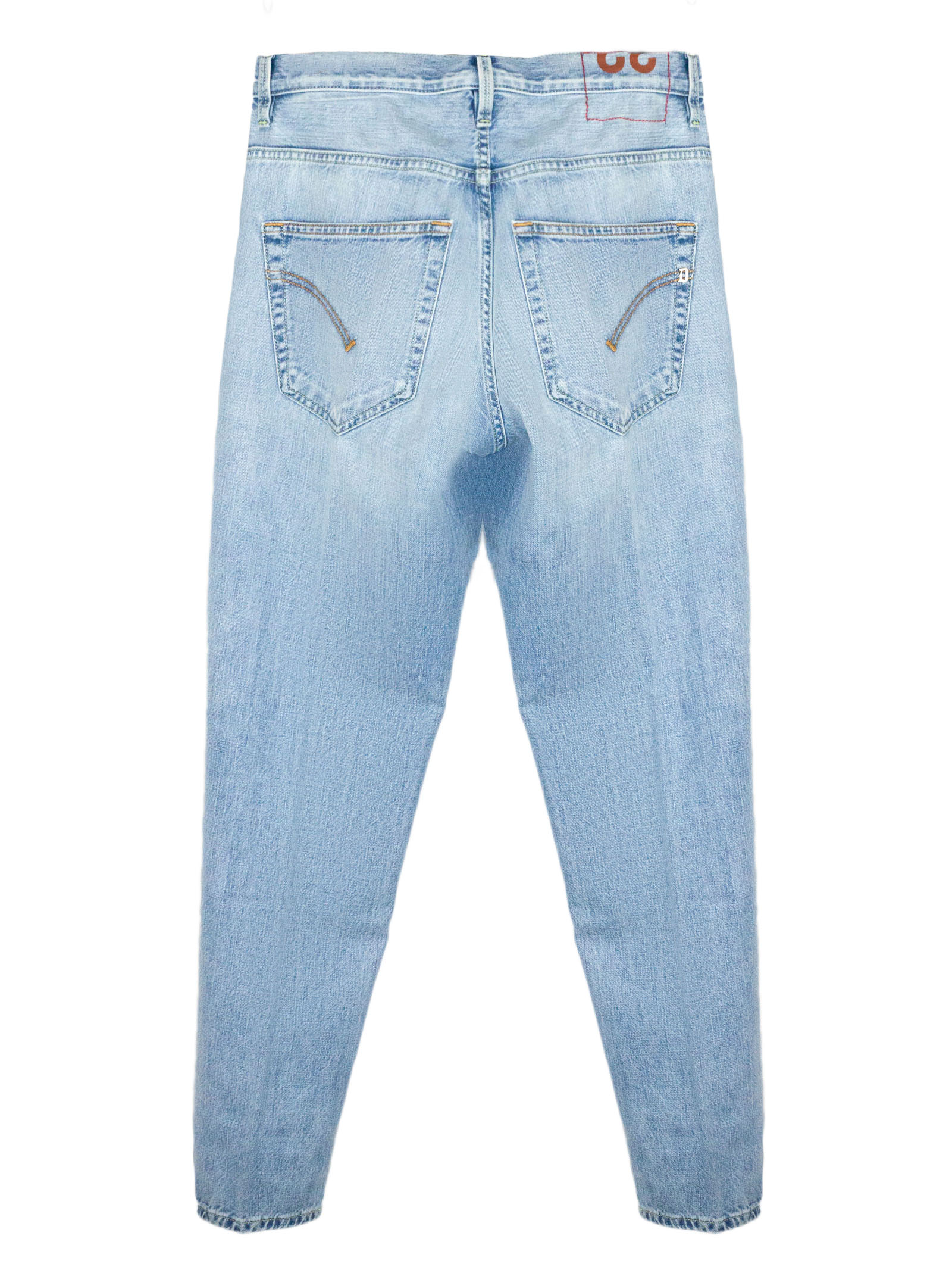 Carrot fit jeans in light blue cotton denim with belt loops, front button fastening, 5 pockets, metal logo detail on the back, 80%Cotton 20%Rycicled cotton