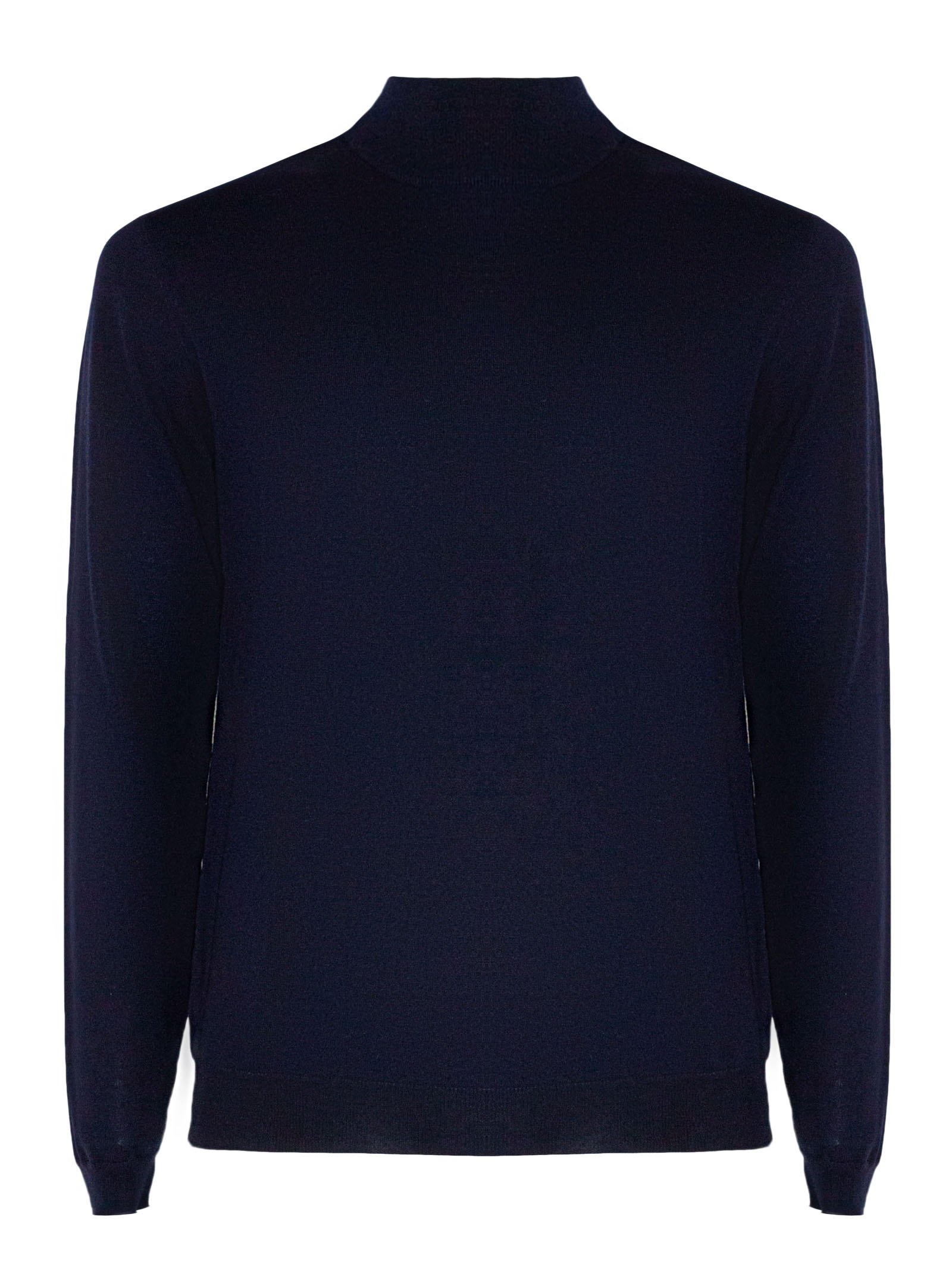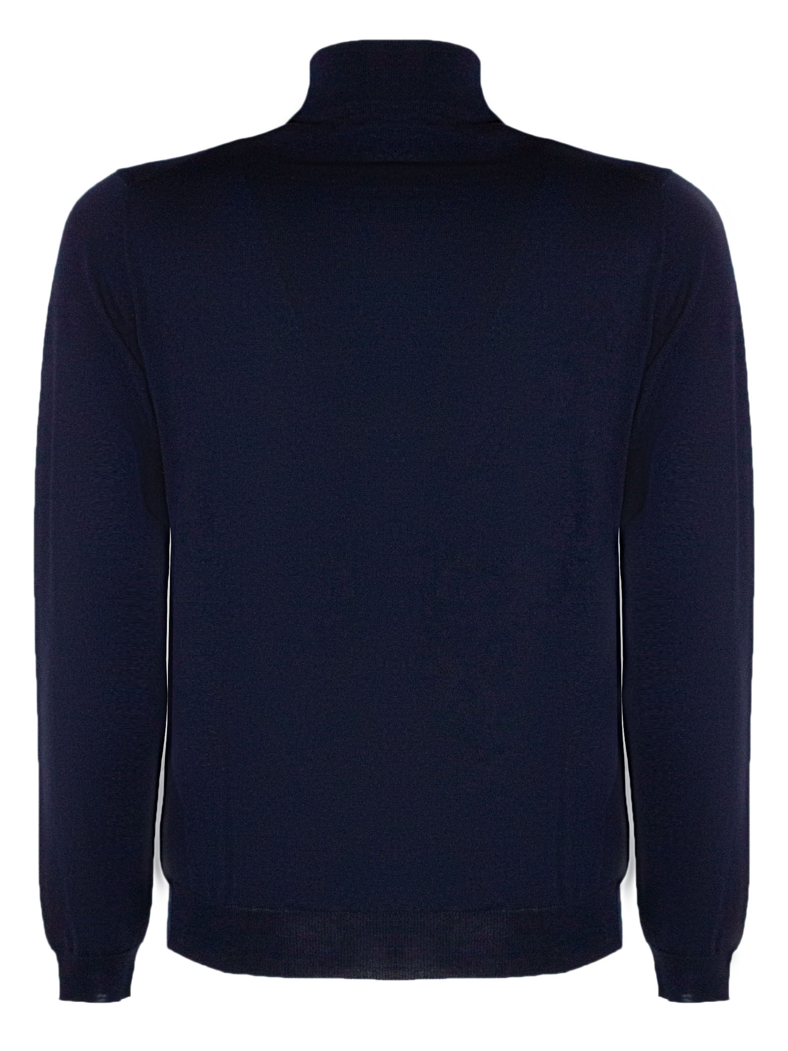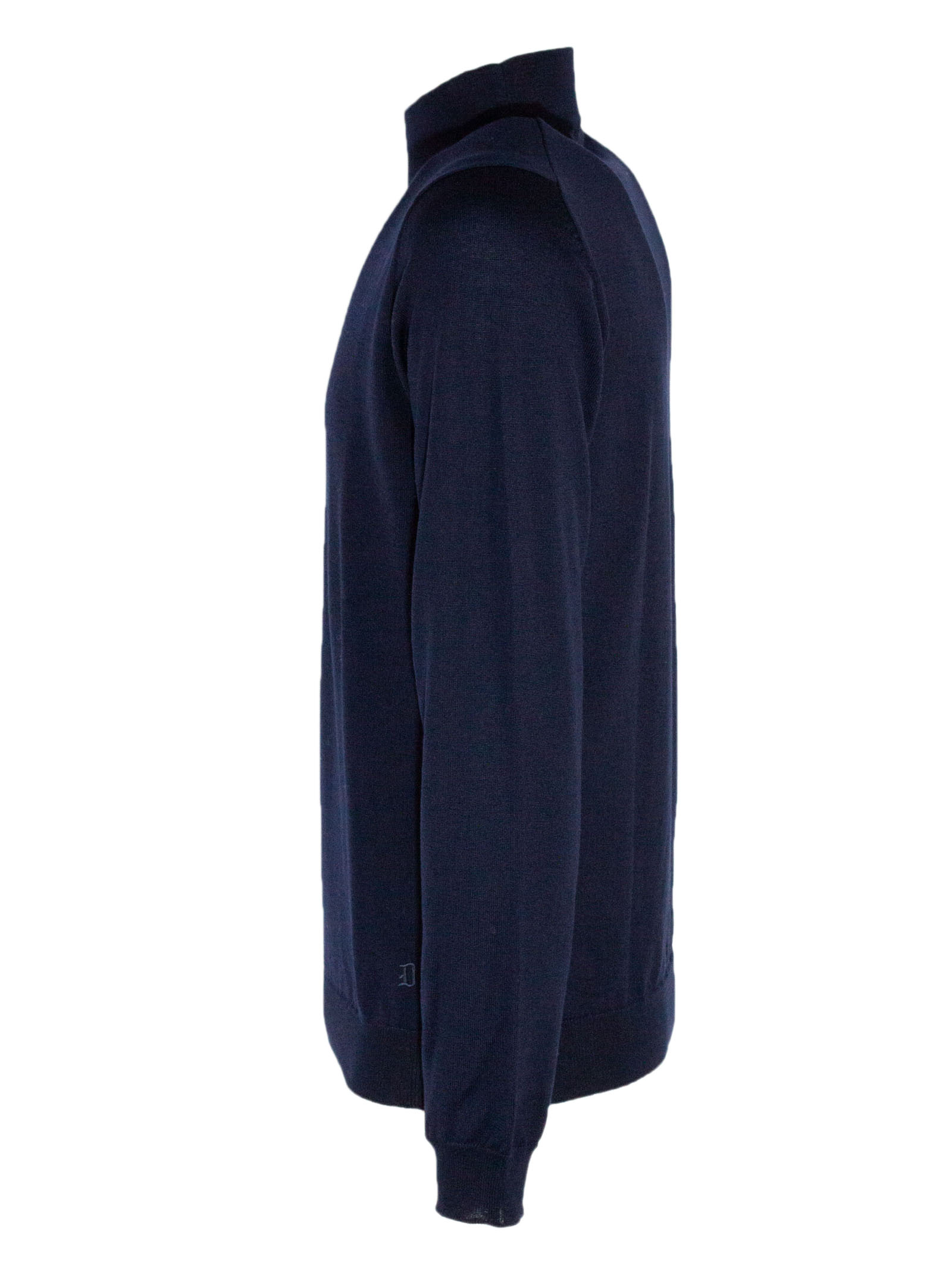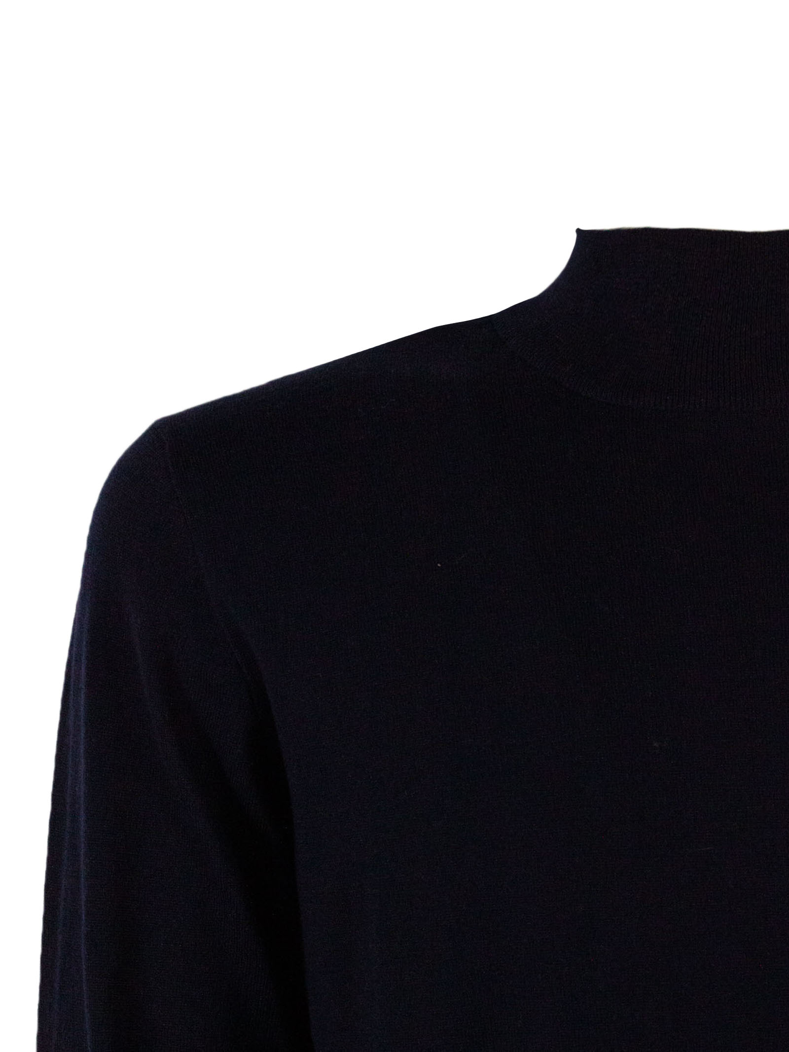 Dark blue wool and cotton blend turtle neck jumper with long sleeves, ribbed trim and logo detail on the back