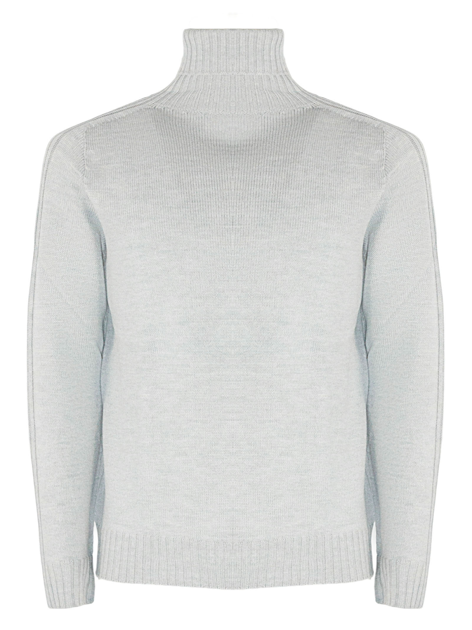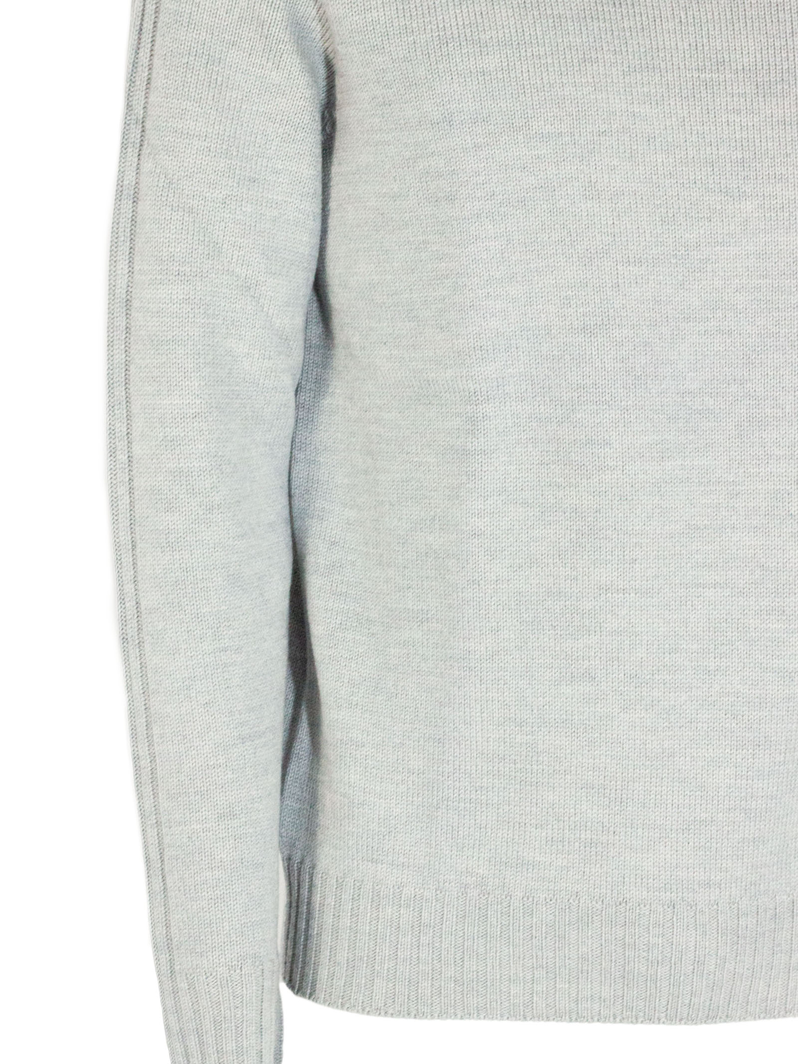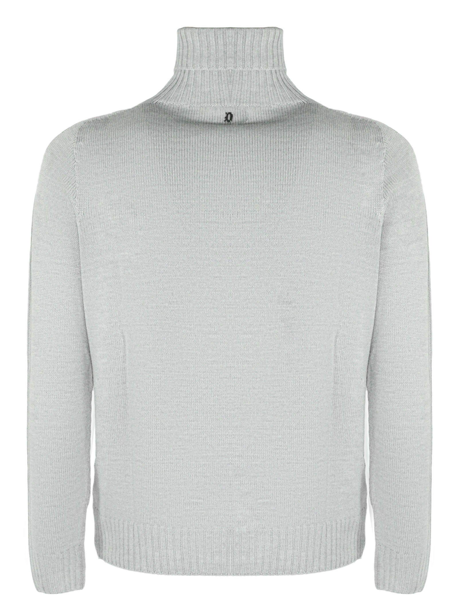 Grey wool jumper with a high neck, long sleeves, ribbed trim and a metal logo detail on the back