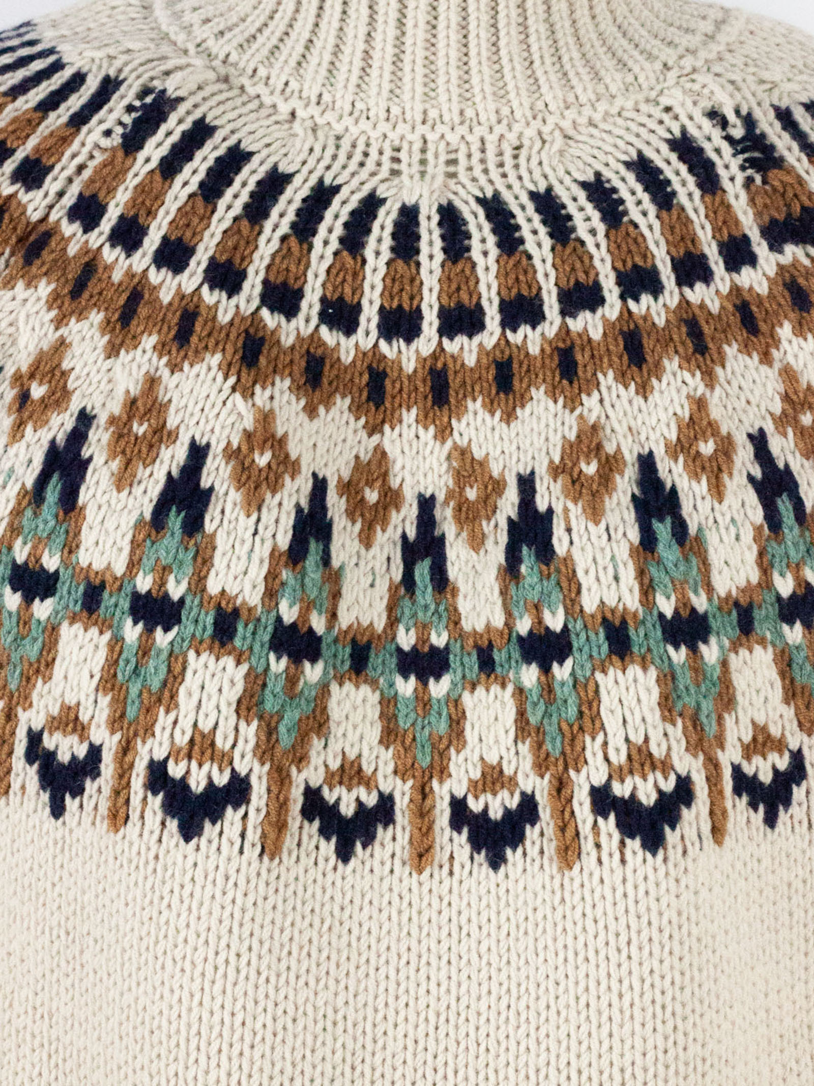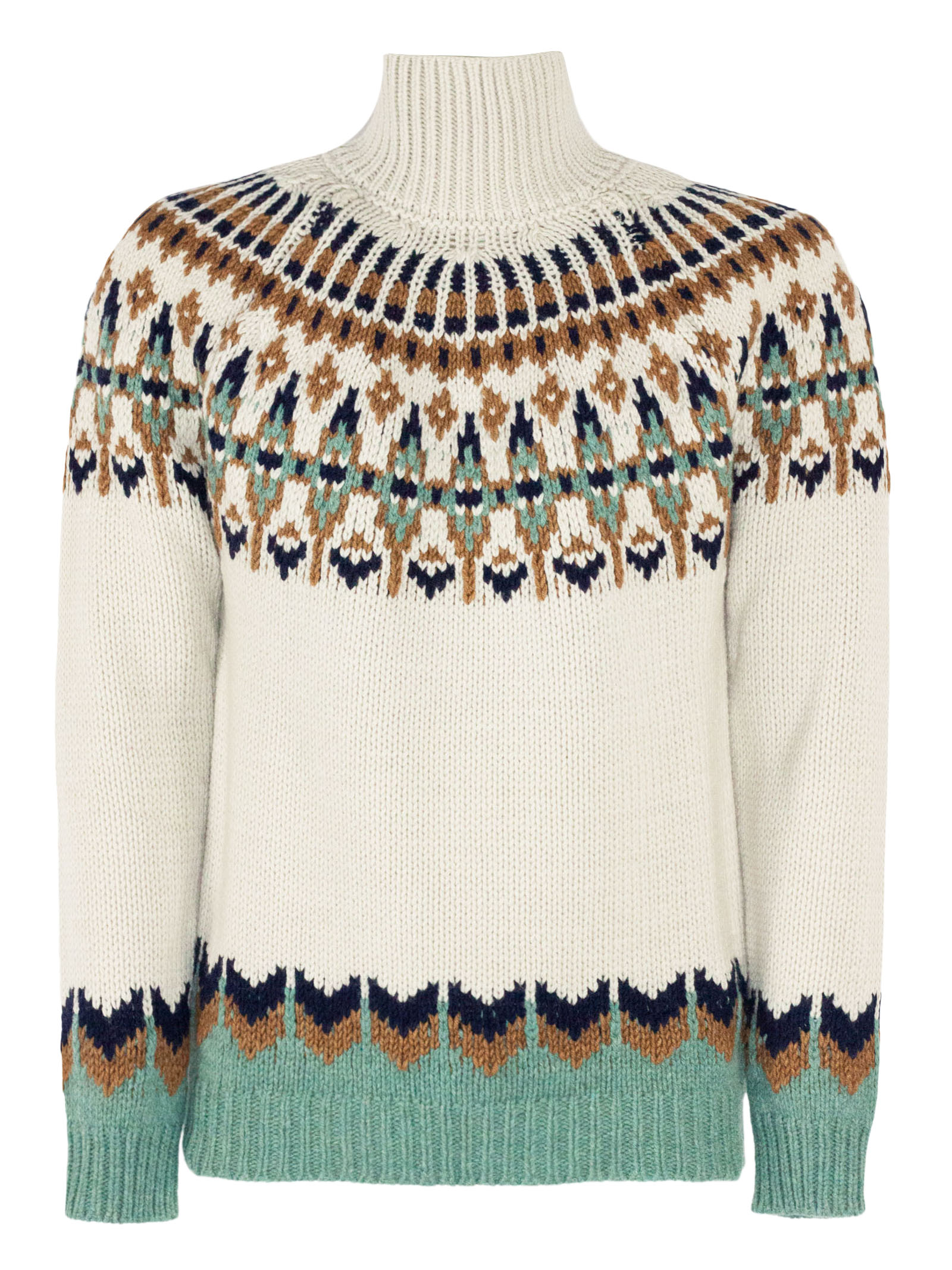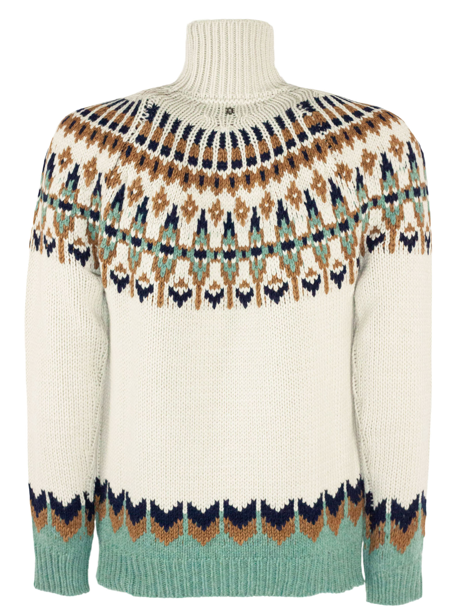 White and green wool blend turtleneck jumper with all-over embroidery detail, long sleeves, ribbed trim, logo detail on the back