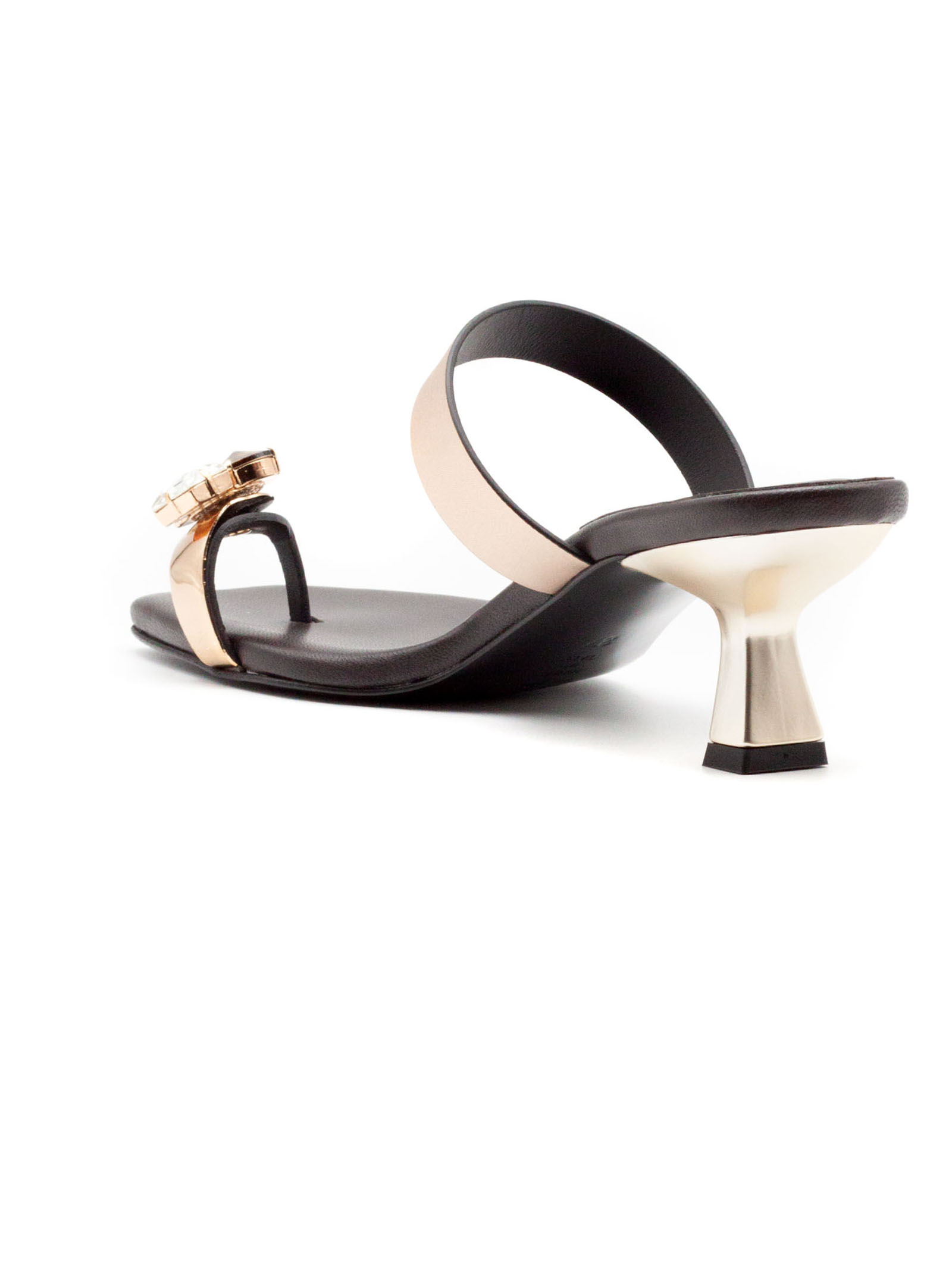Brown leather mule sandals with medium gold shaped heel, beige satin front strap, black thong with gold jewel detail, black padded insole and square toe, heel height 4 cm