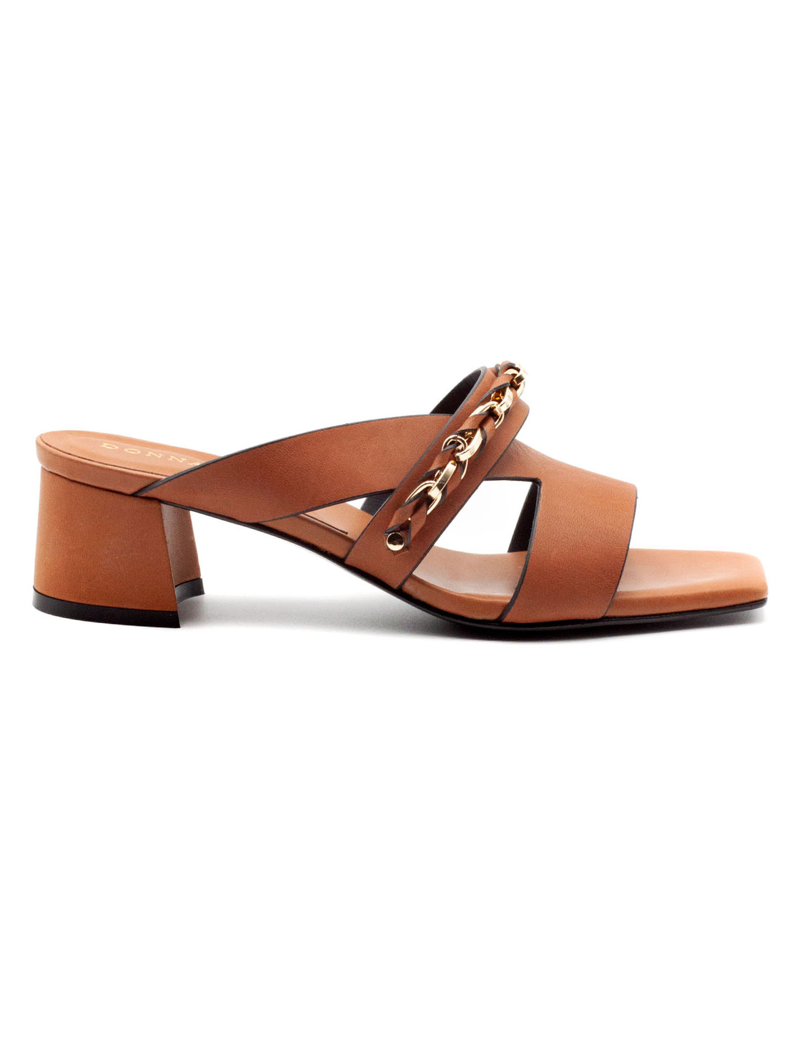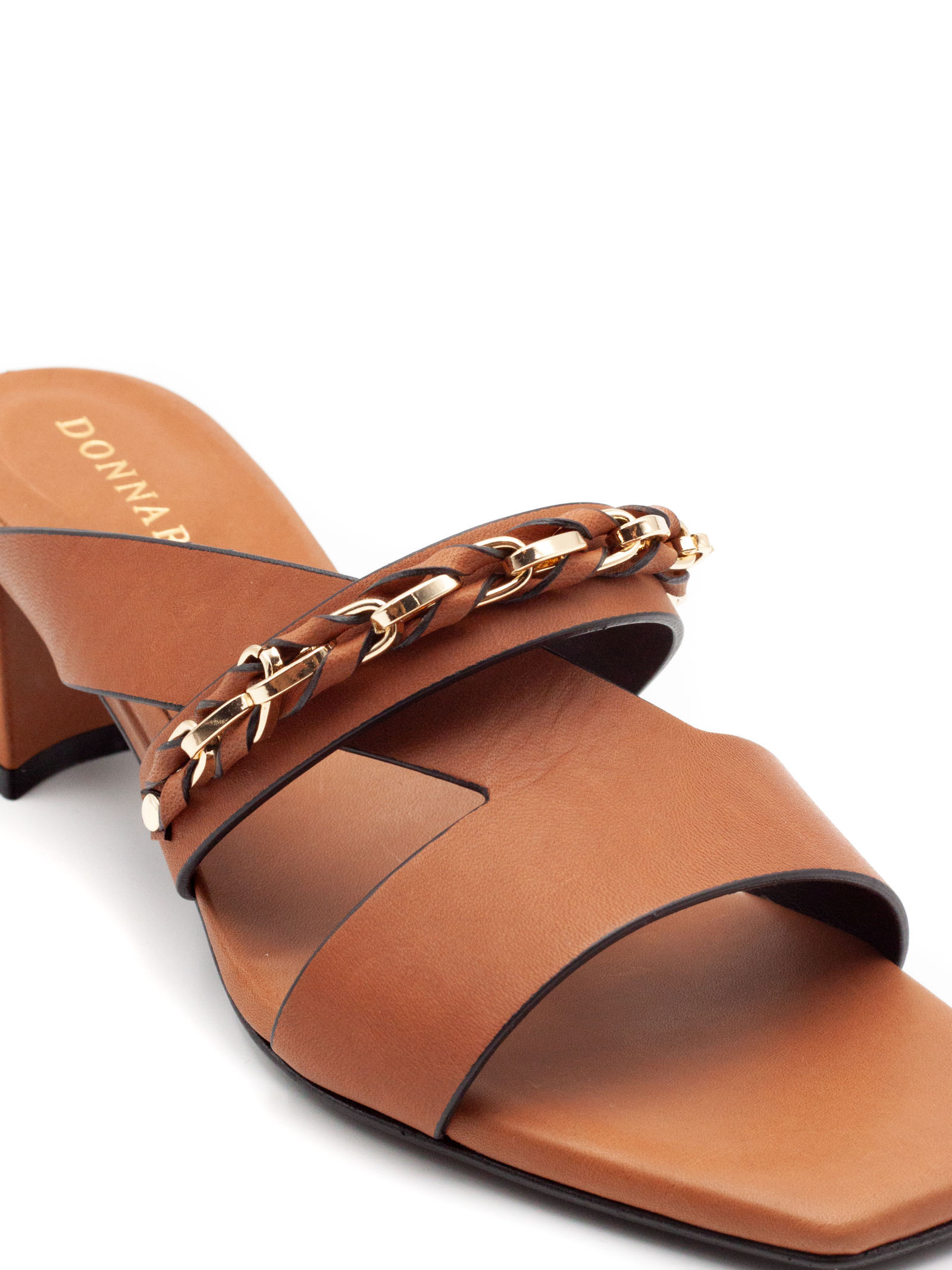 Leather mule sandals with double crossed straps, gold metal chain detail on the side, square toe, medium-width covered heel and black rubber sole, heel height 4 cm