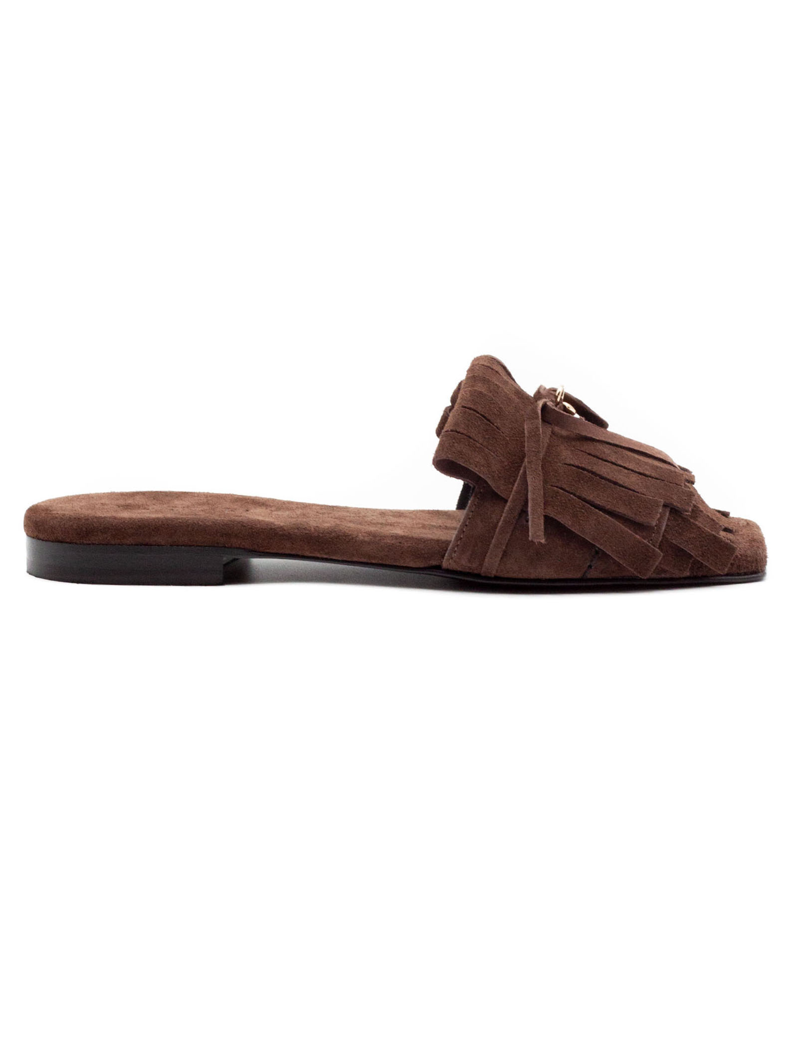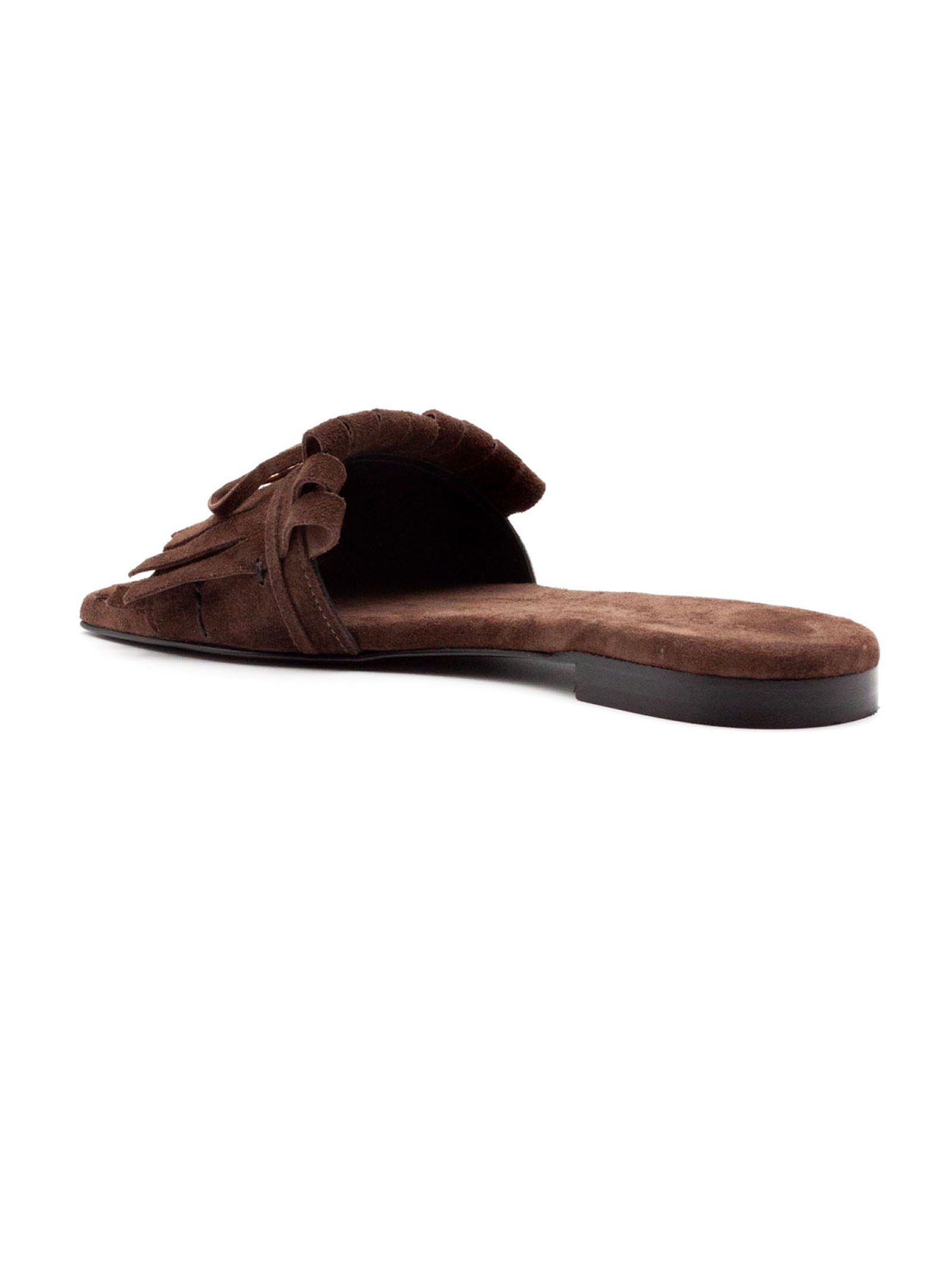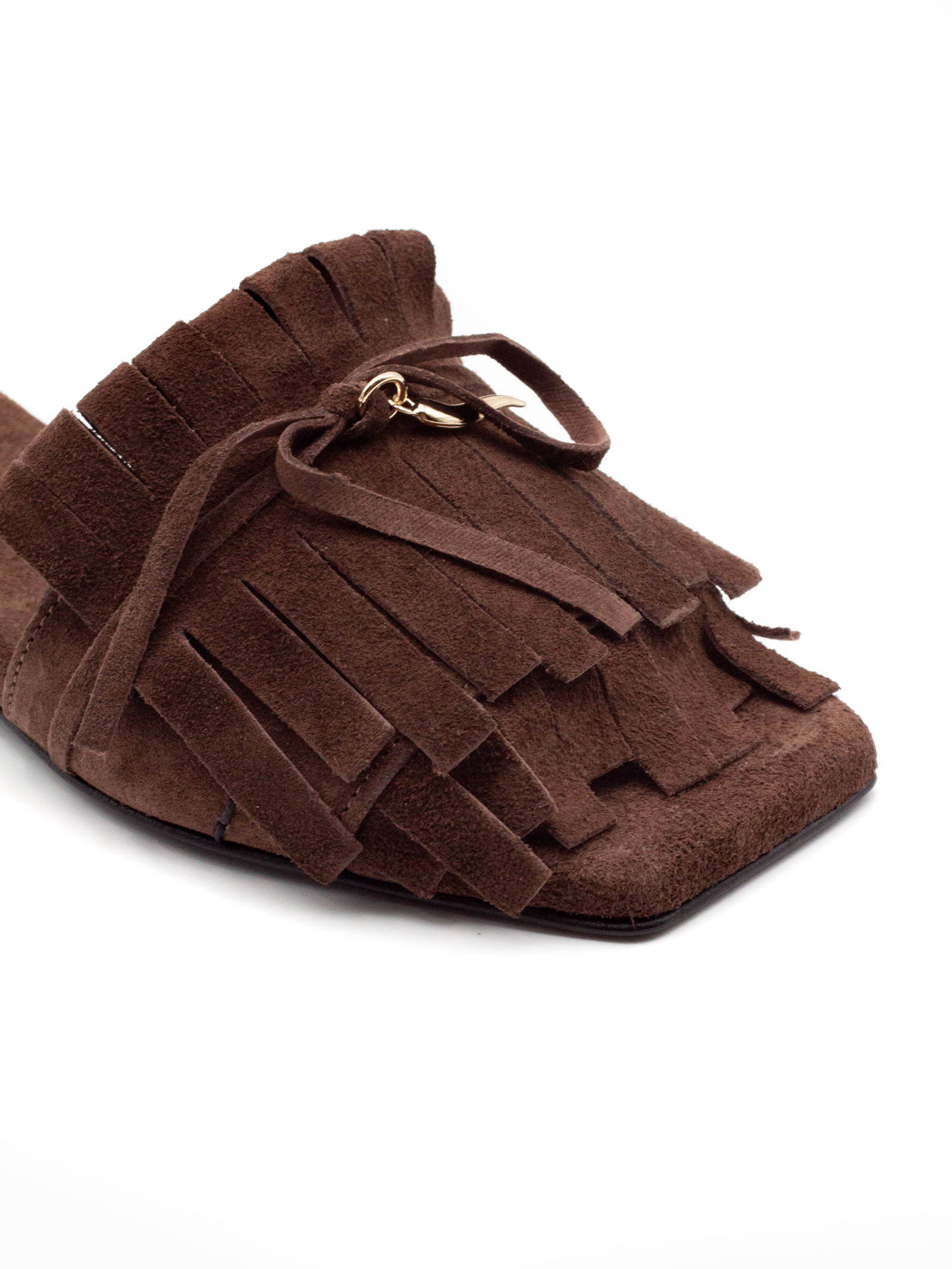 Low brown suede sabot sandals, square toe, strap with decorative fringes and gold metal buckle detail, leather sole
