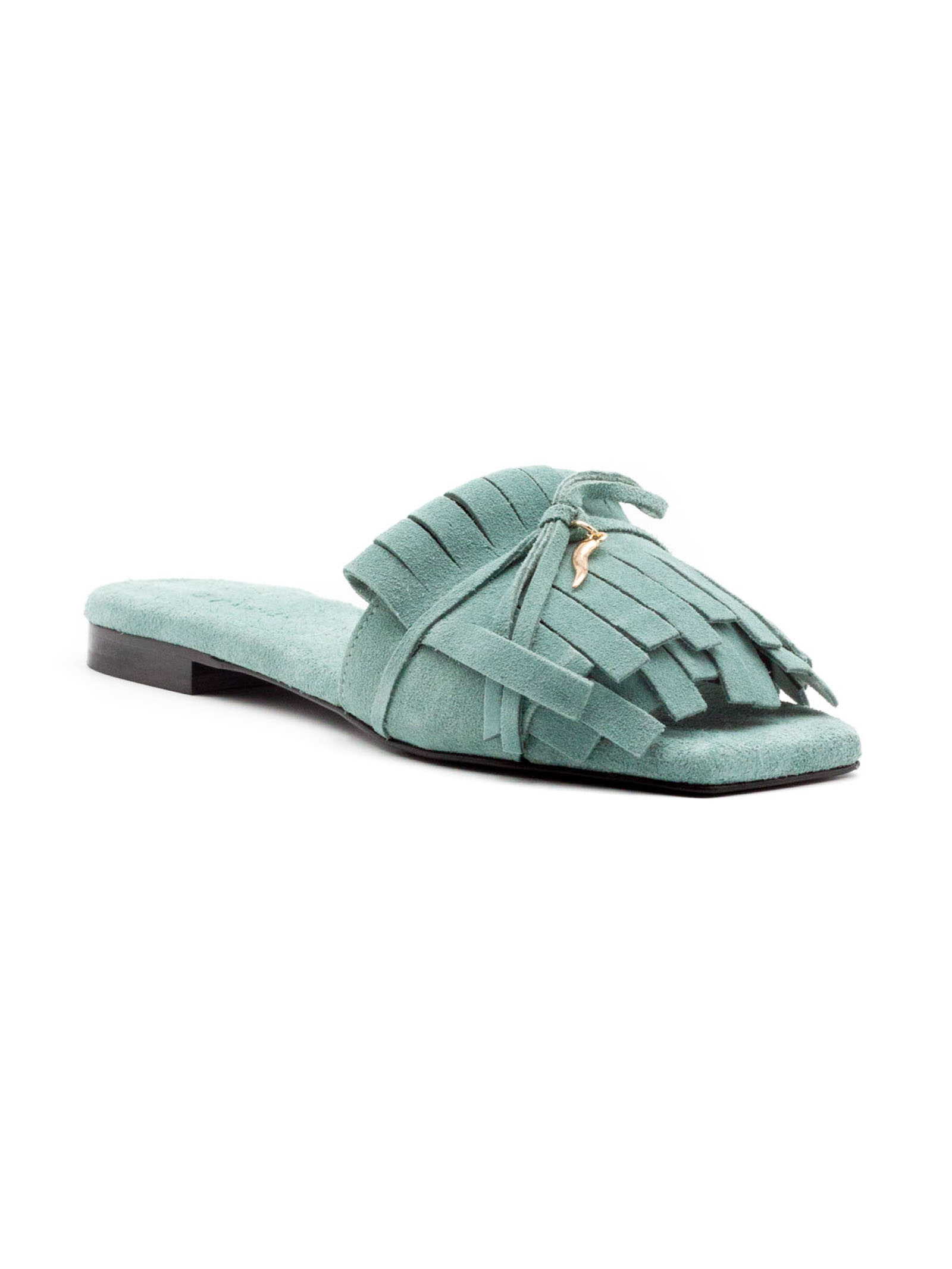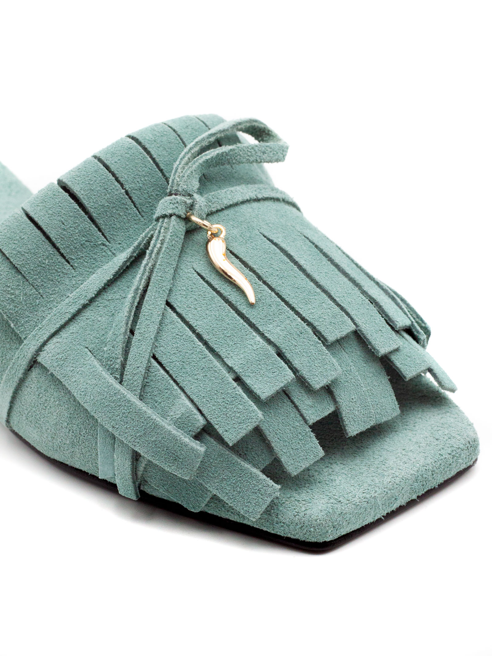 Low light green suede sabot sandals, square toe, strap with decorative fringes and gold metal buckle detail, leather sole