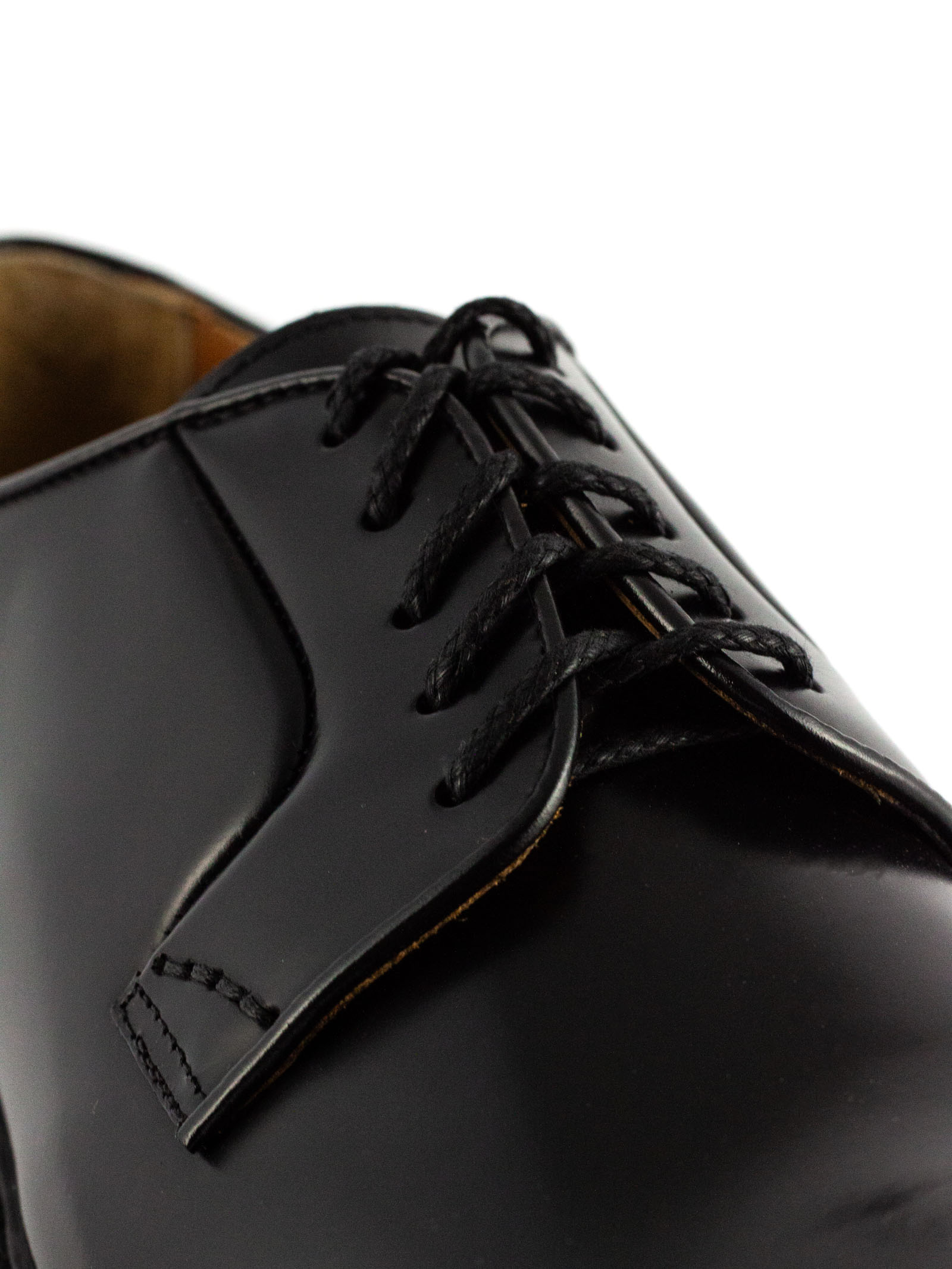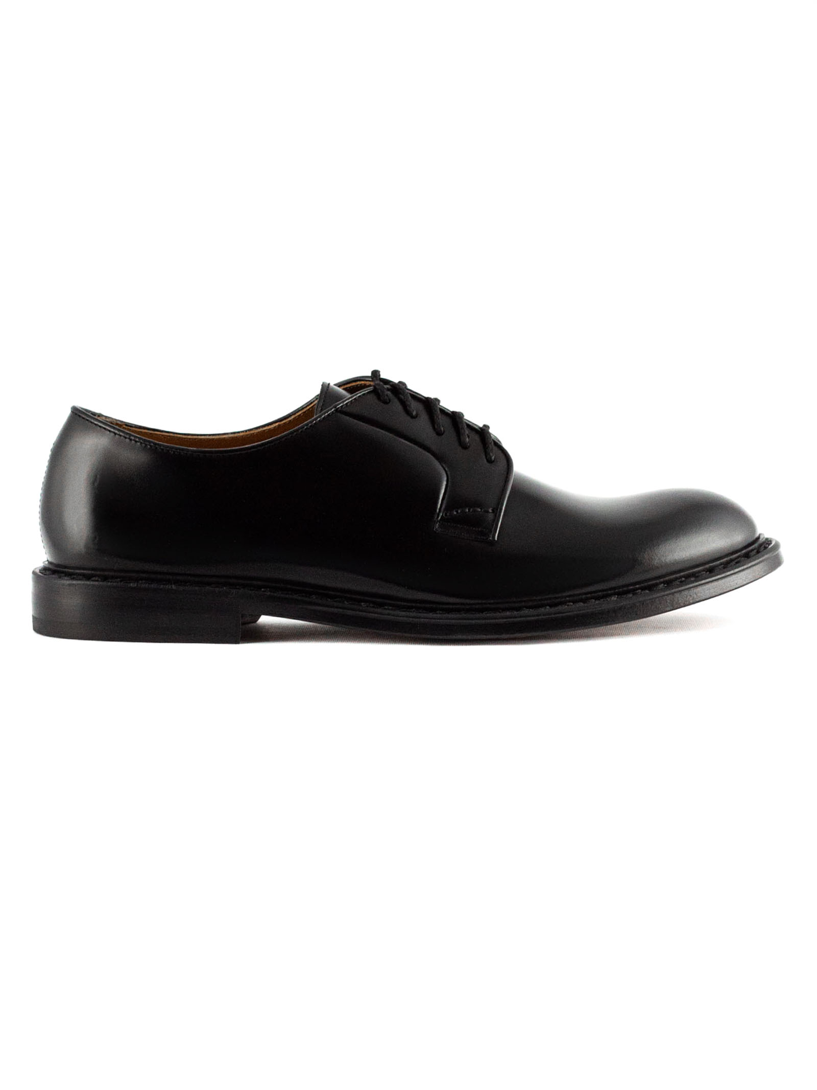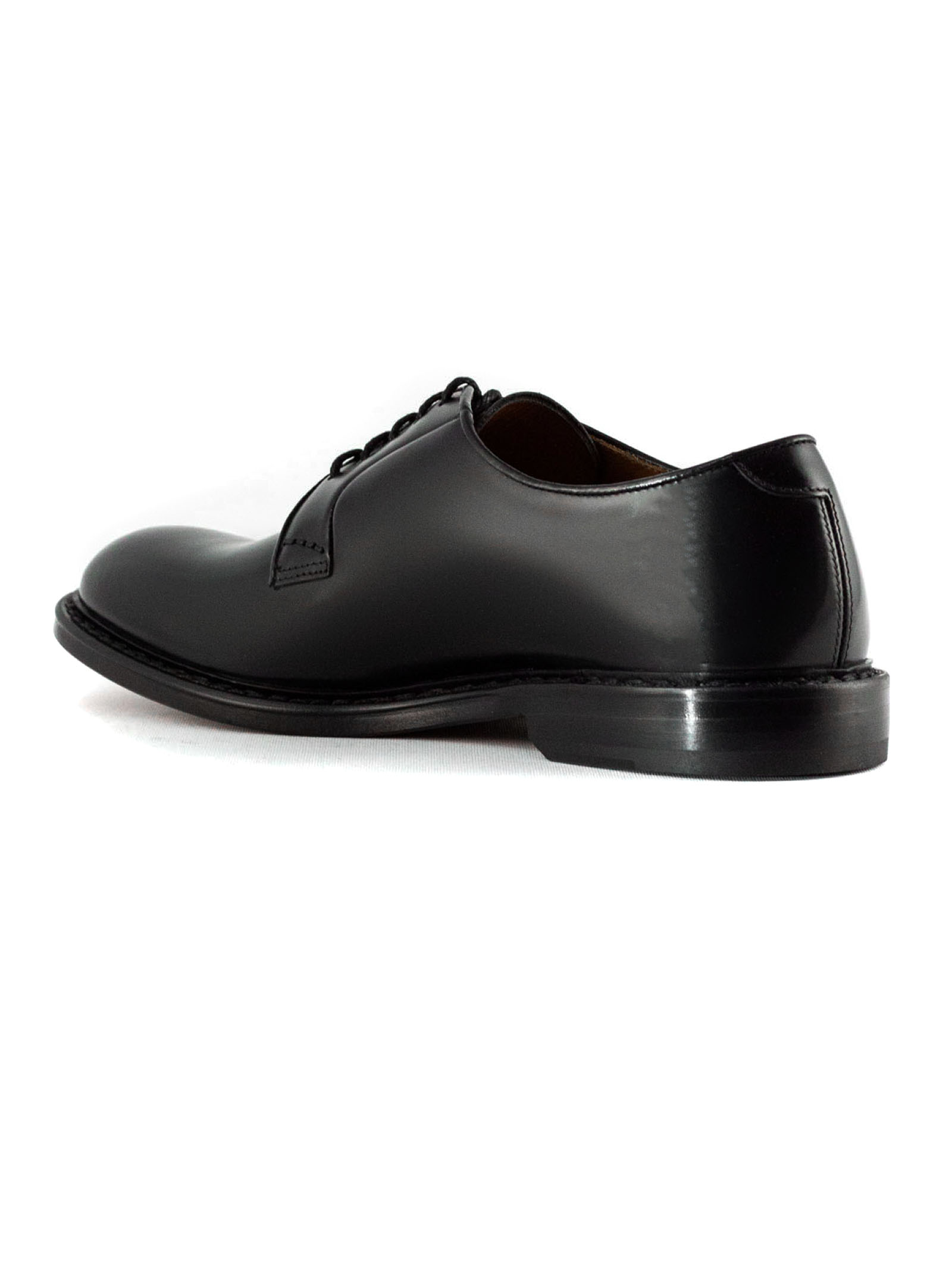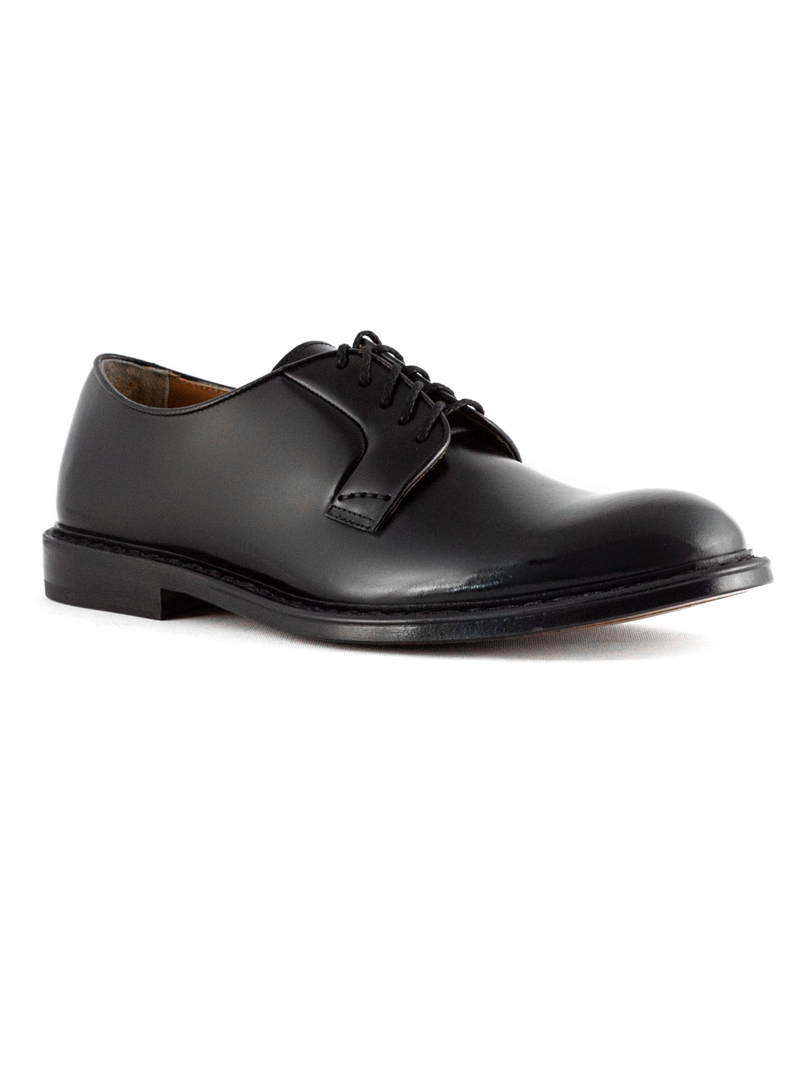 Black brushed leather lace-ups, five eyelets, Derby style, smooth upper and rounded shape, lace-up fastening, leather sole, Blake construction, 2 cm heel
