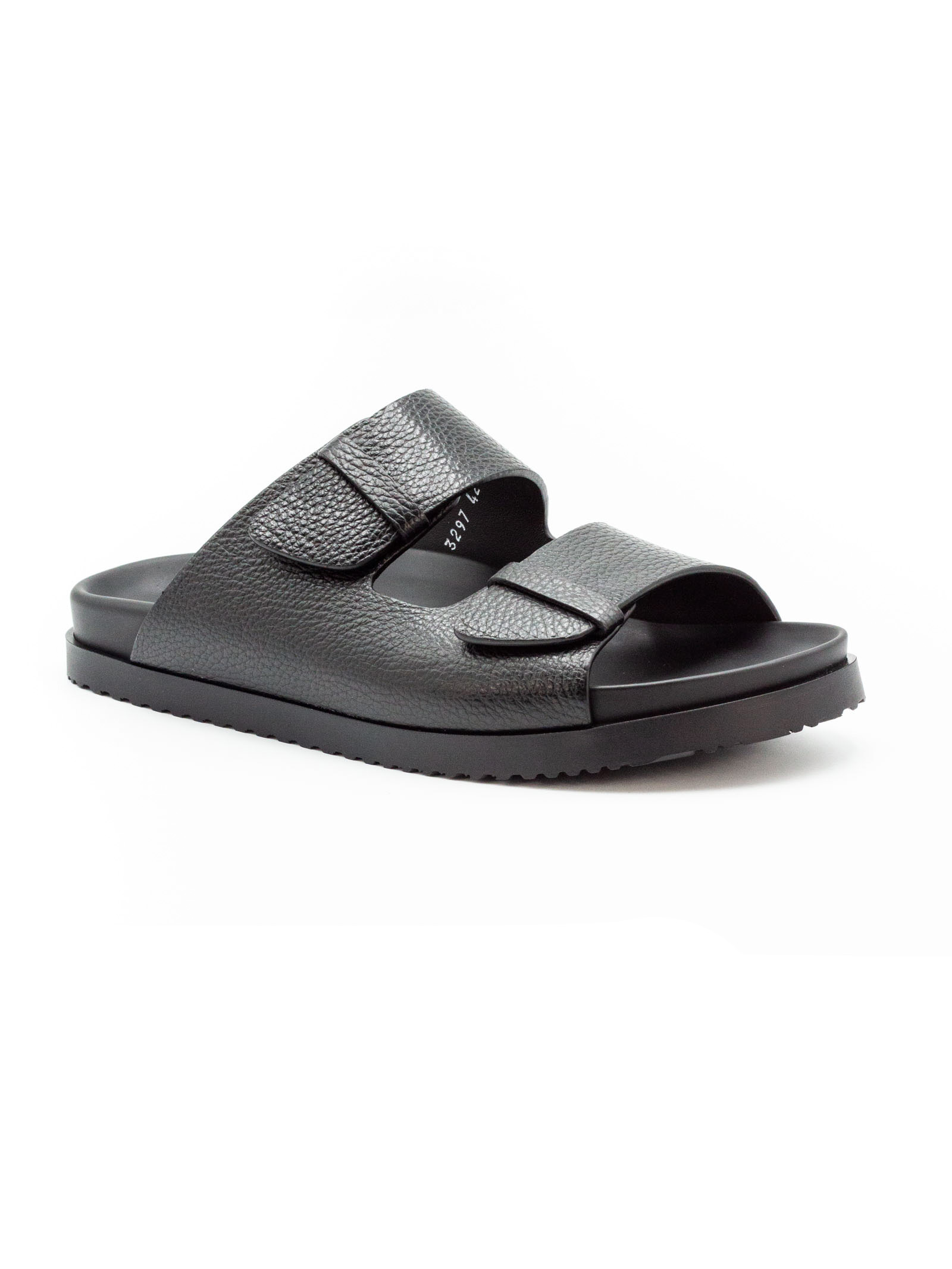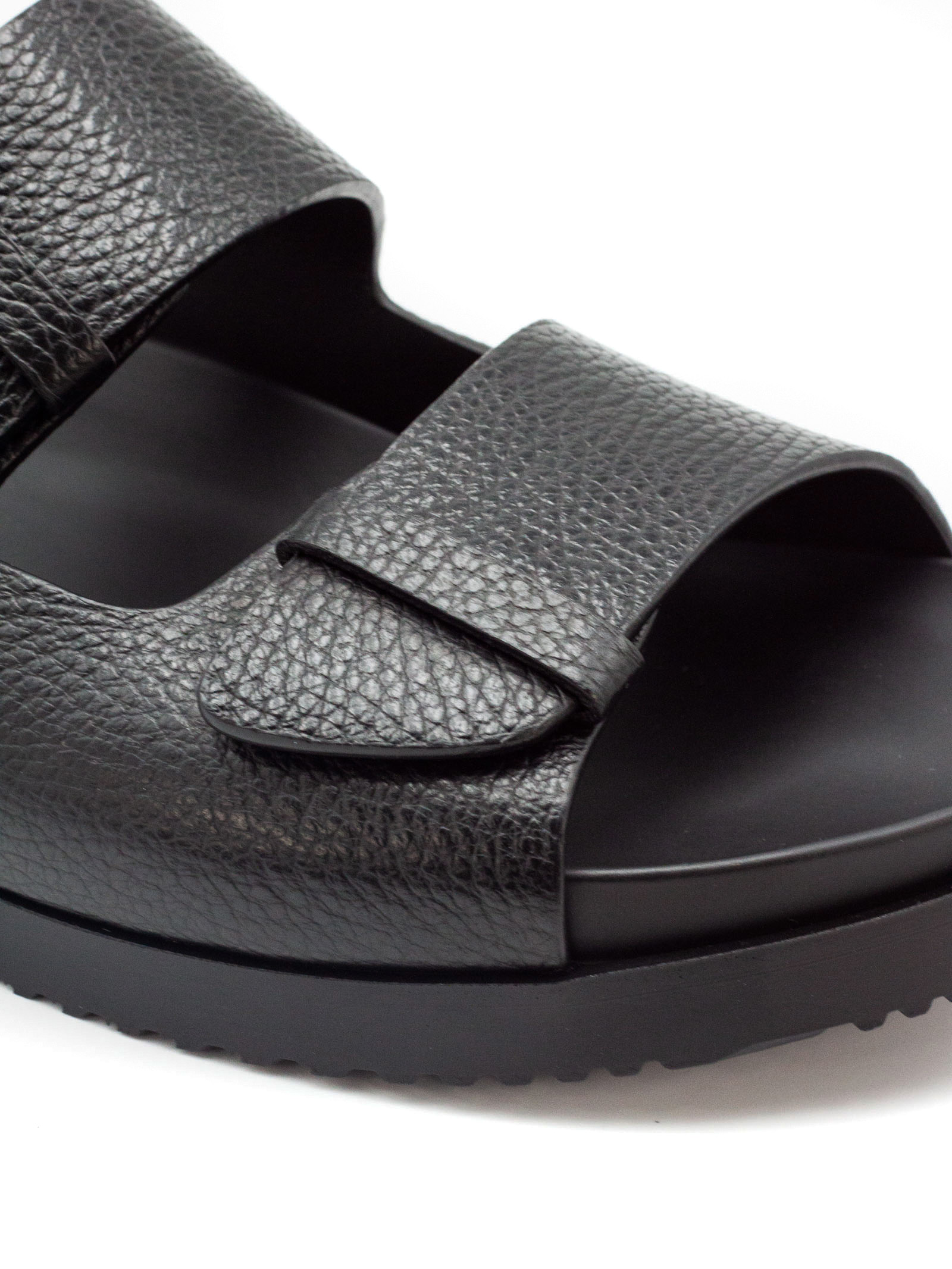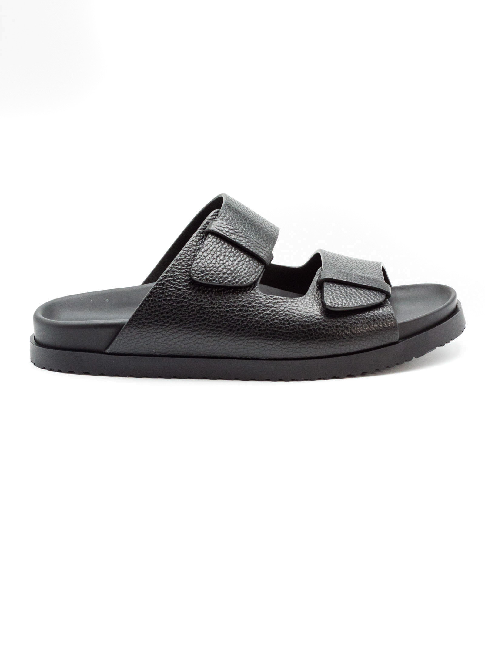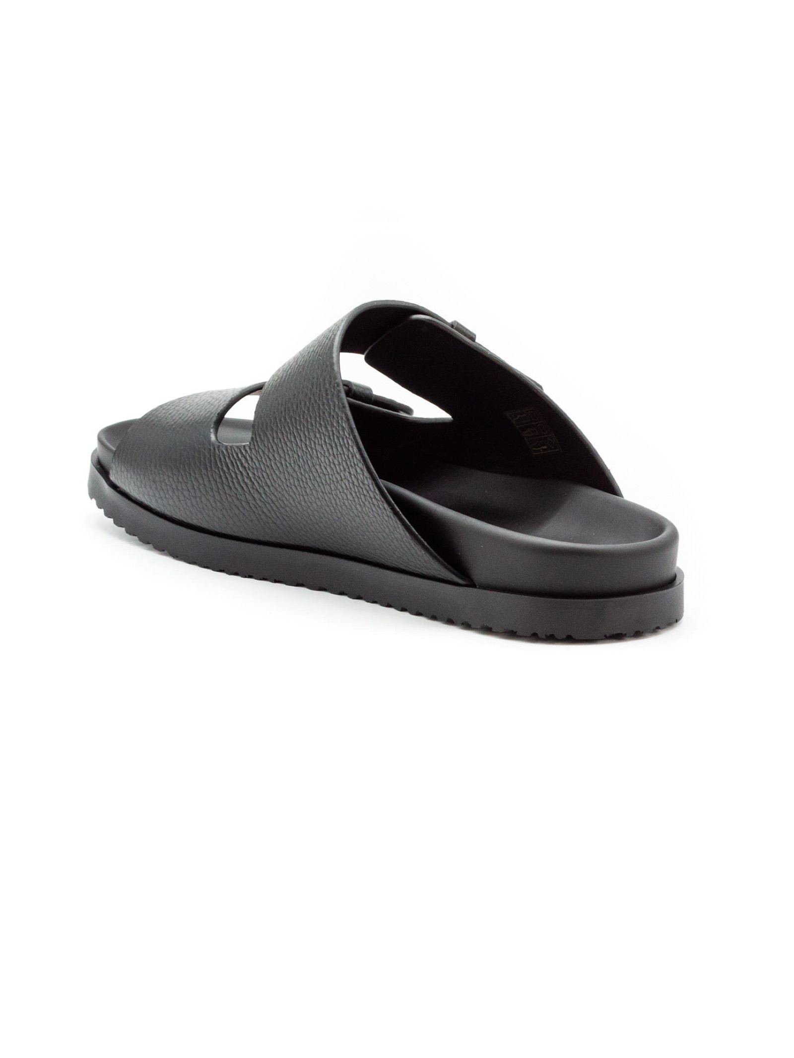 Black calf leather slides, grained texture, round open toe, double-strap design, open back, branded leather footbed, flat rubber sole, slip-on style