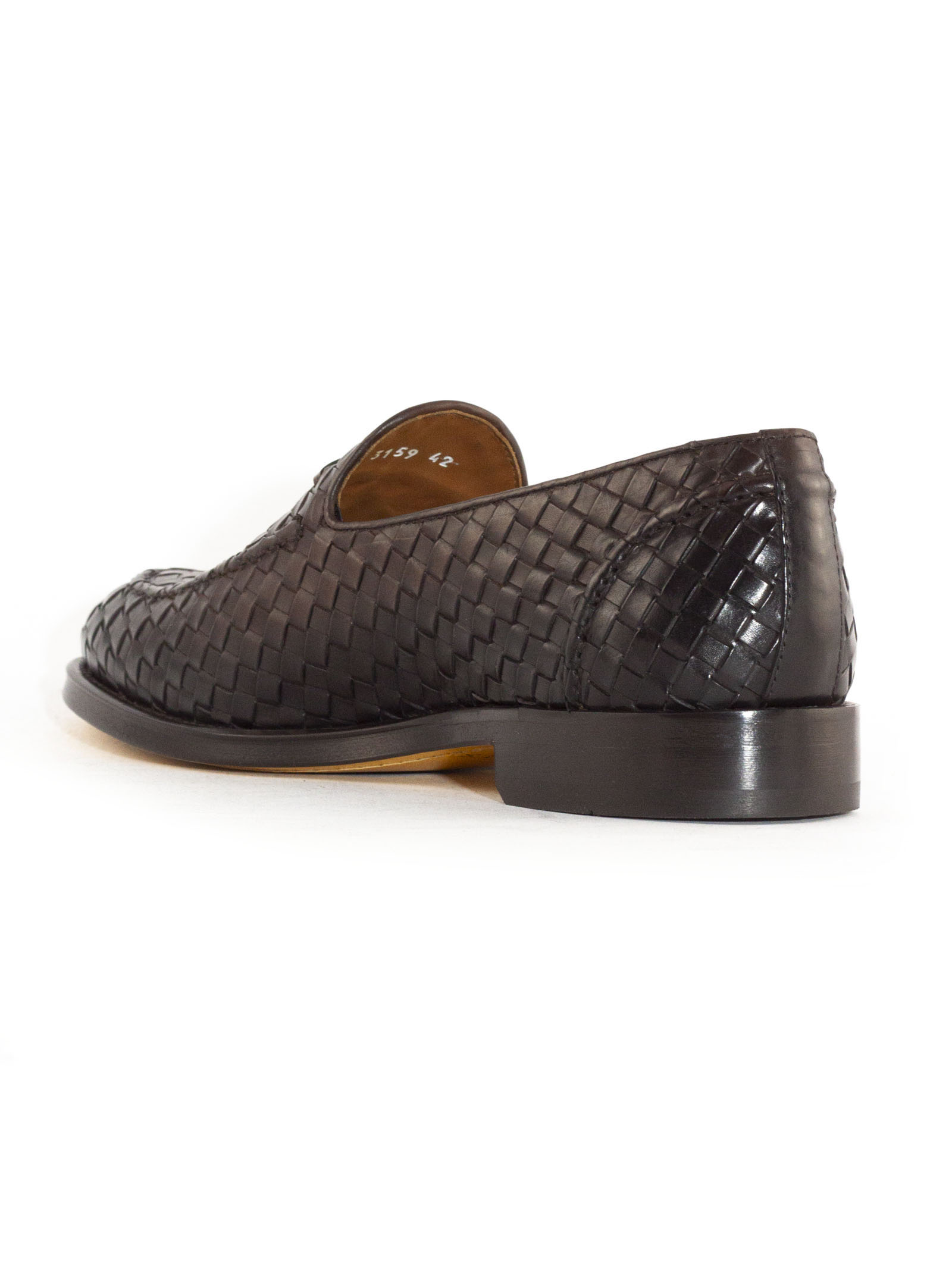 Brown interwoven leather loafers, ombré effect, almond toe, tassel detail, branded leather insole, partial lining, low stacked heel, leather outsole, slip-on style