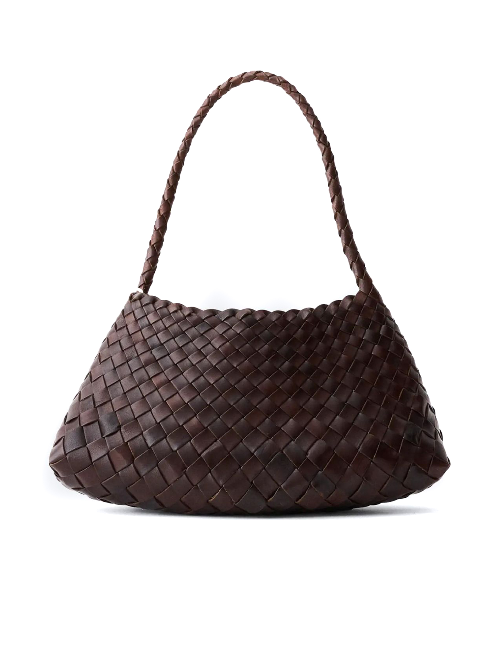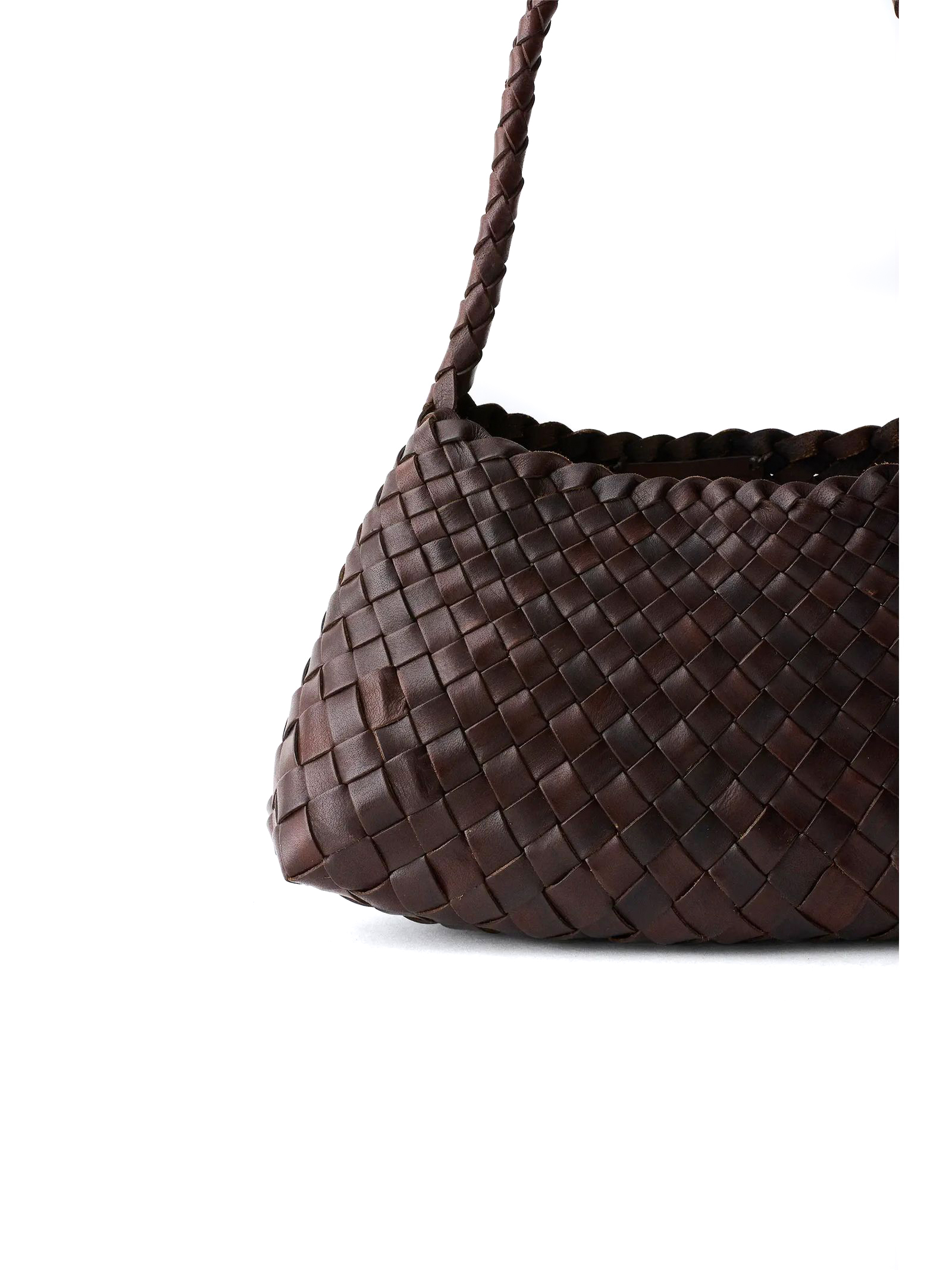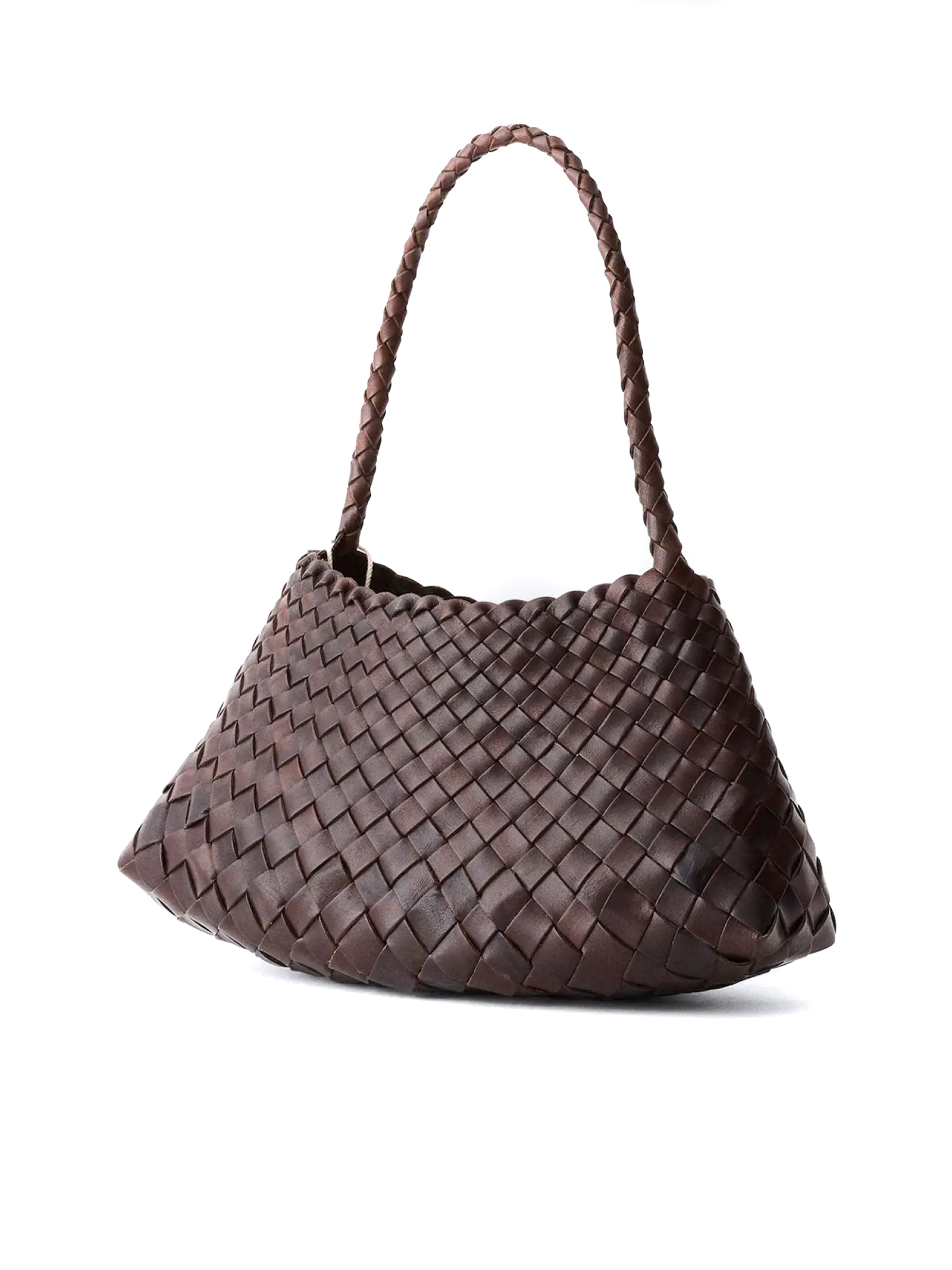 Dark brown Rosanna woven leather bag, St. Christopher medal charm, Handwoven Basket, Buffalo Leather, No lining, irregular leather weaving straps, 32X17X10 CM
