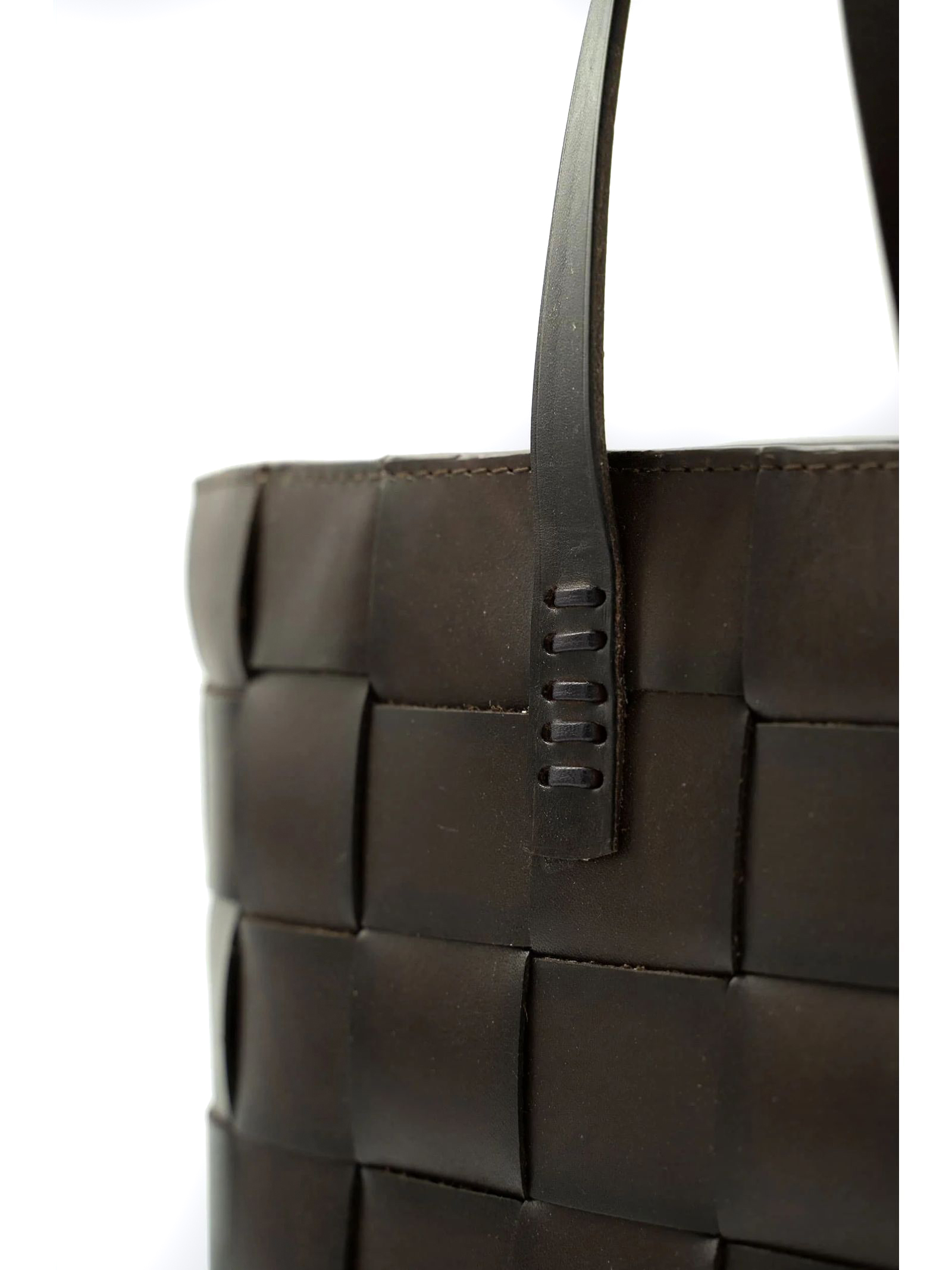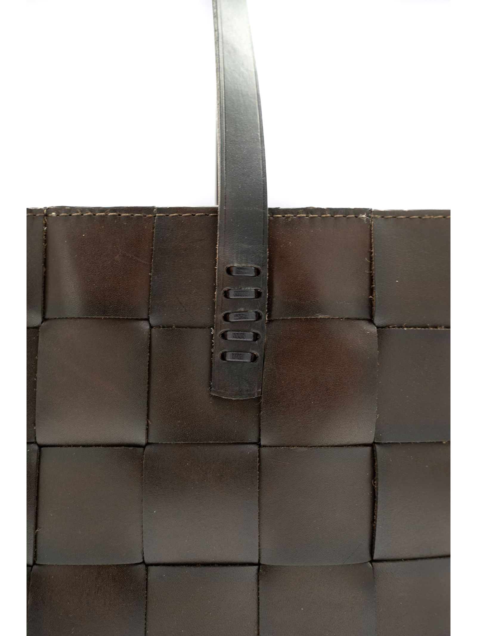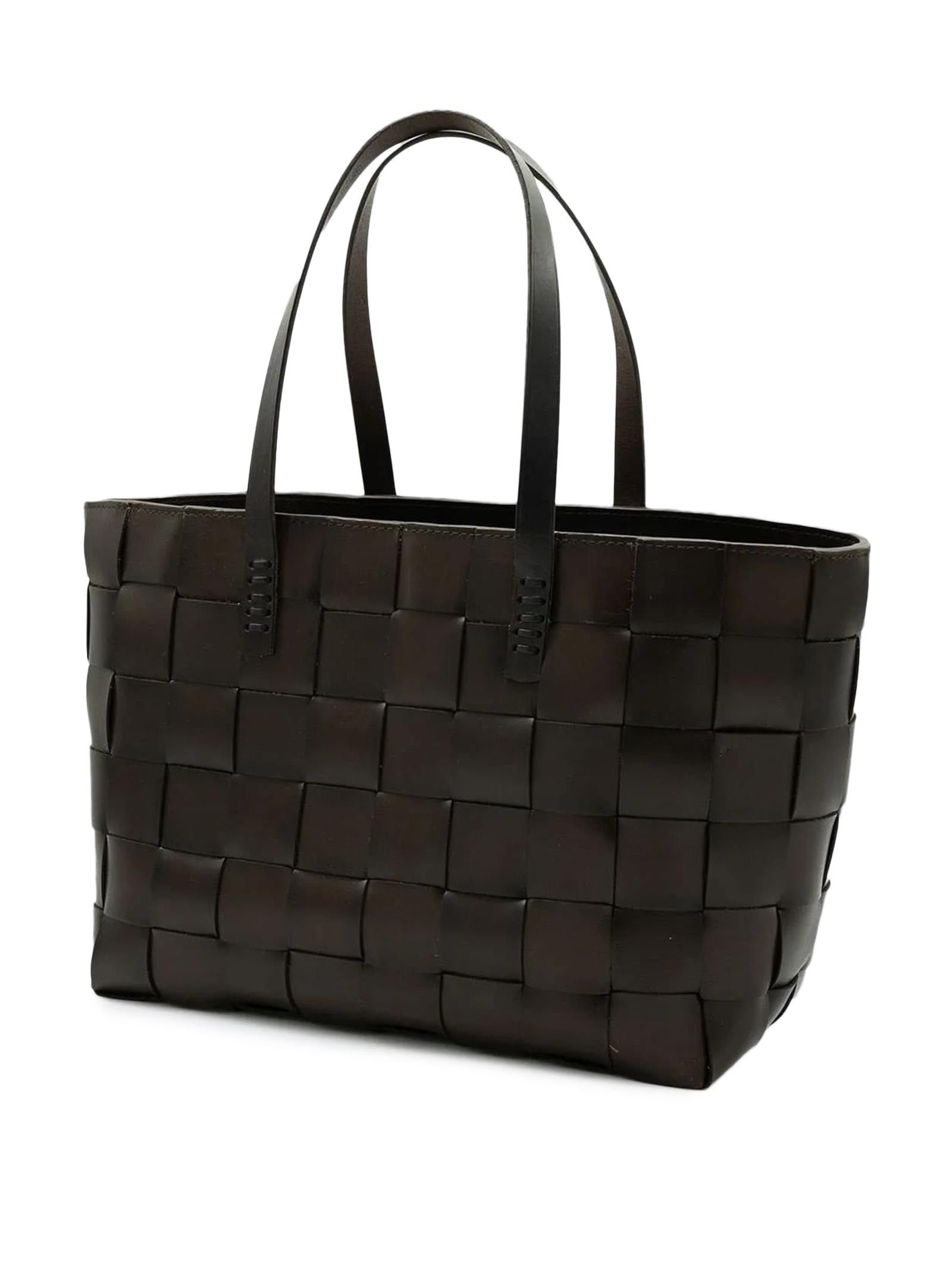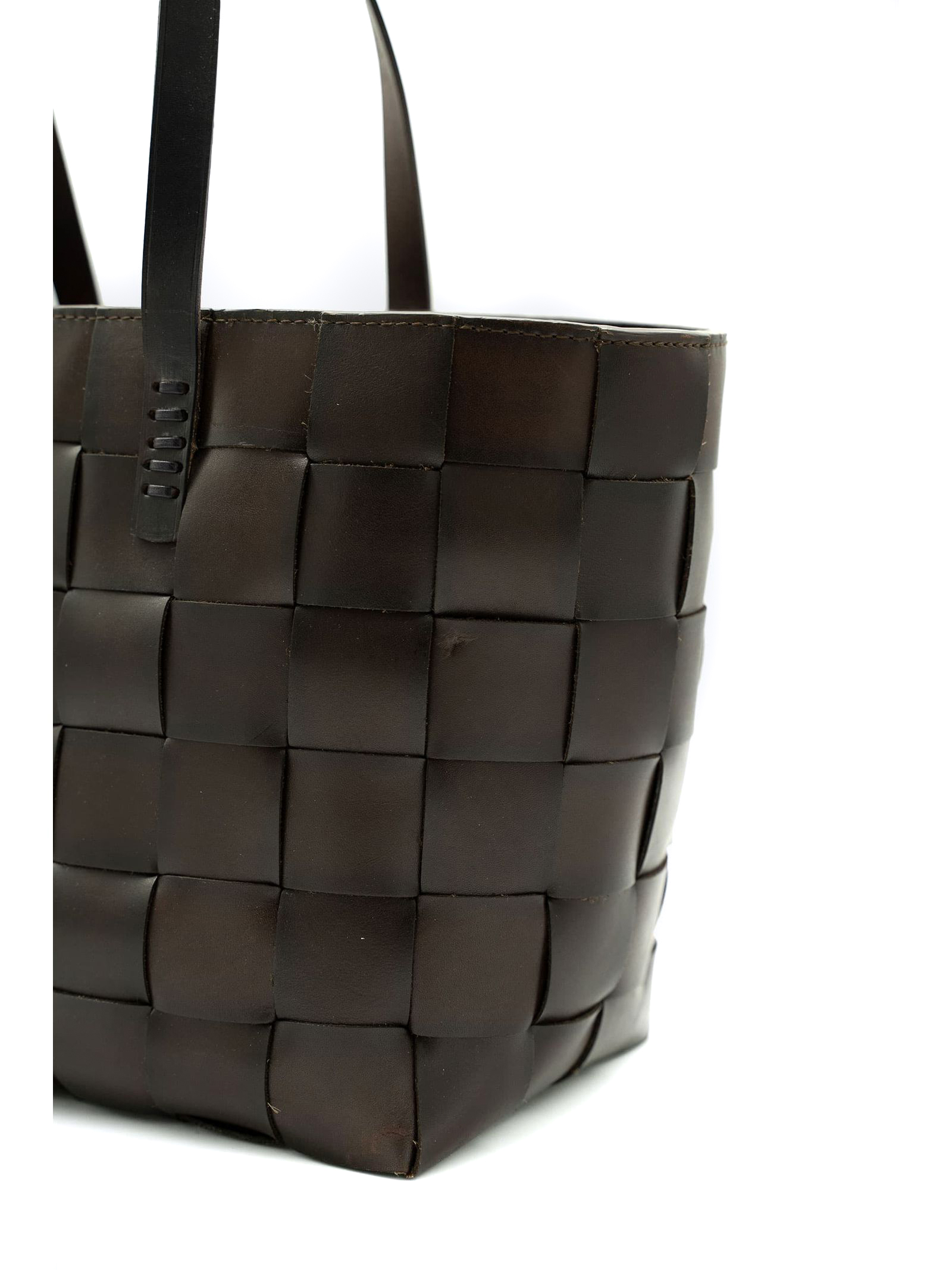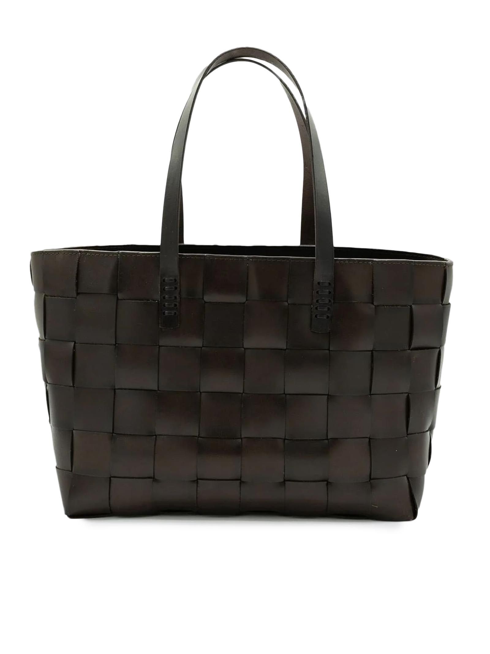 Japan Tote Dark Brown, cow leather, smooth grain, interwoven design, internal logo patch, internal logo charm, open top, two flat top handles, main compartment, internal patch pockets, internal zip-fastening pocket, full lining, Width 33 cm, Depth 17 cm,