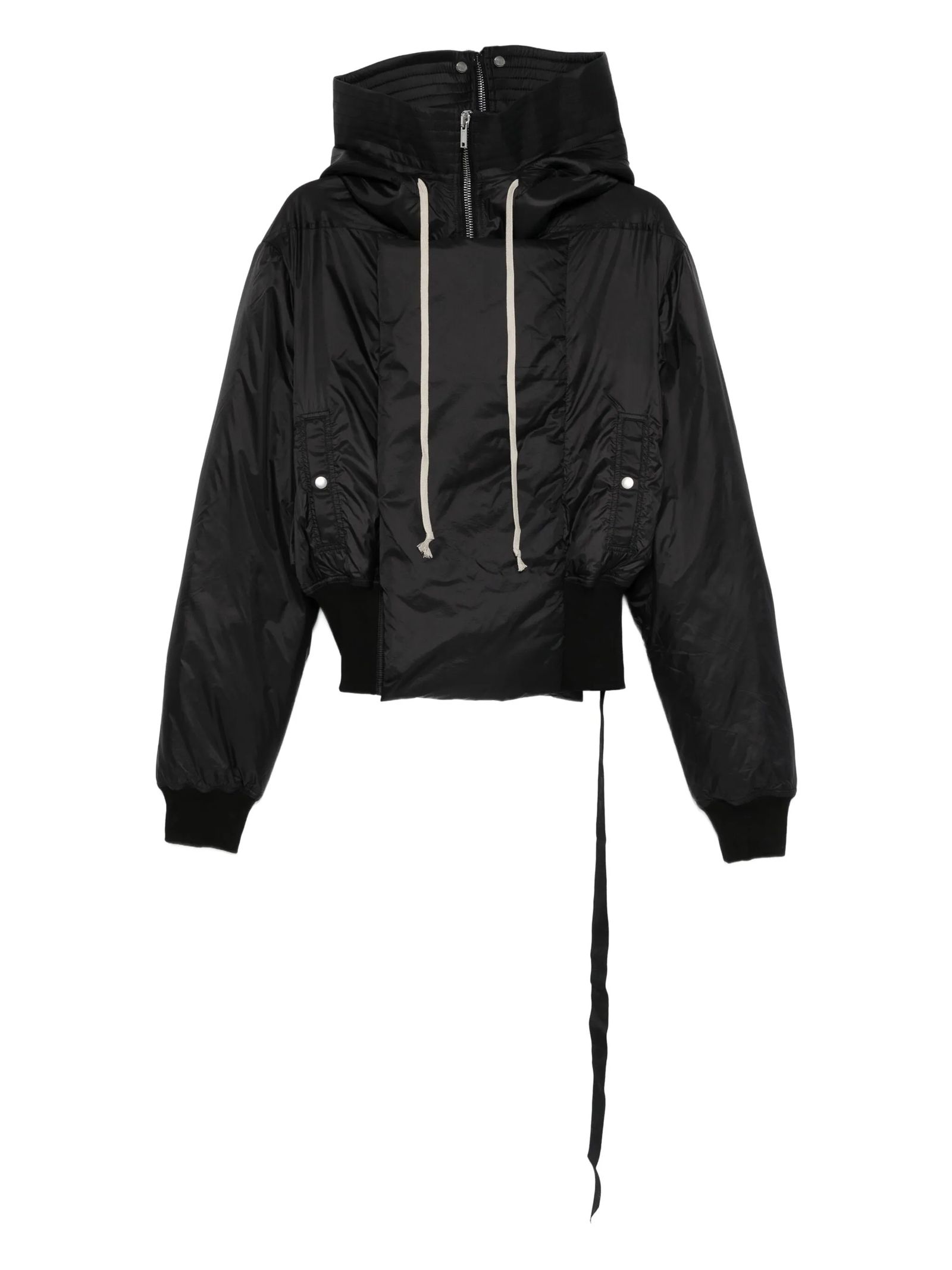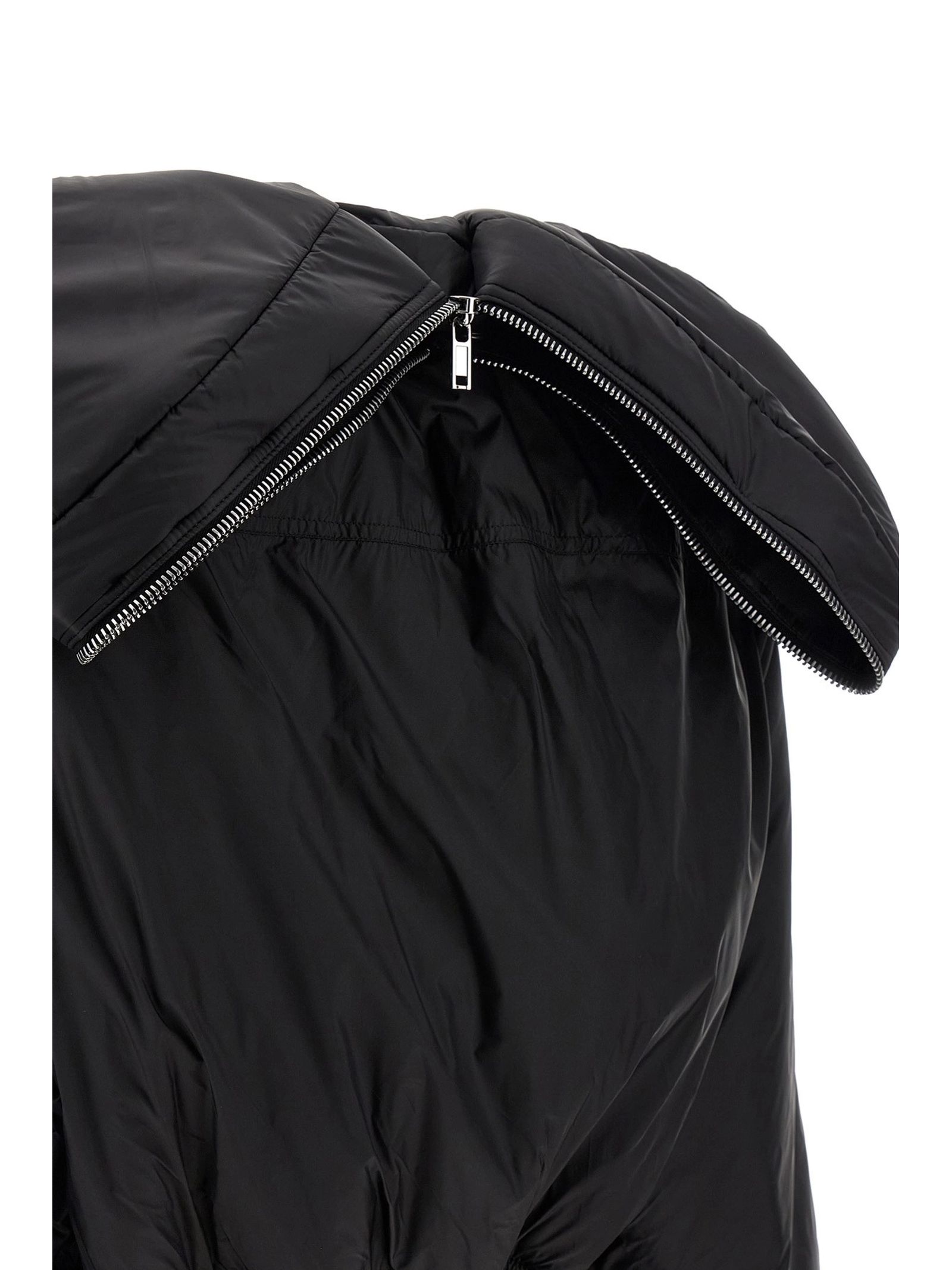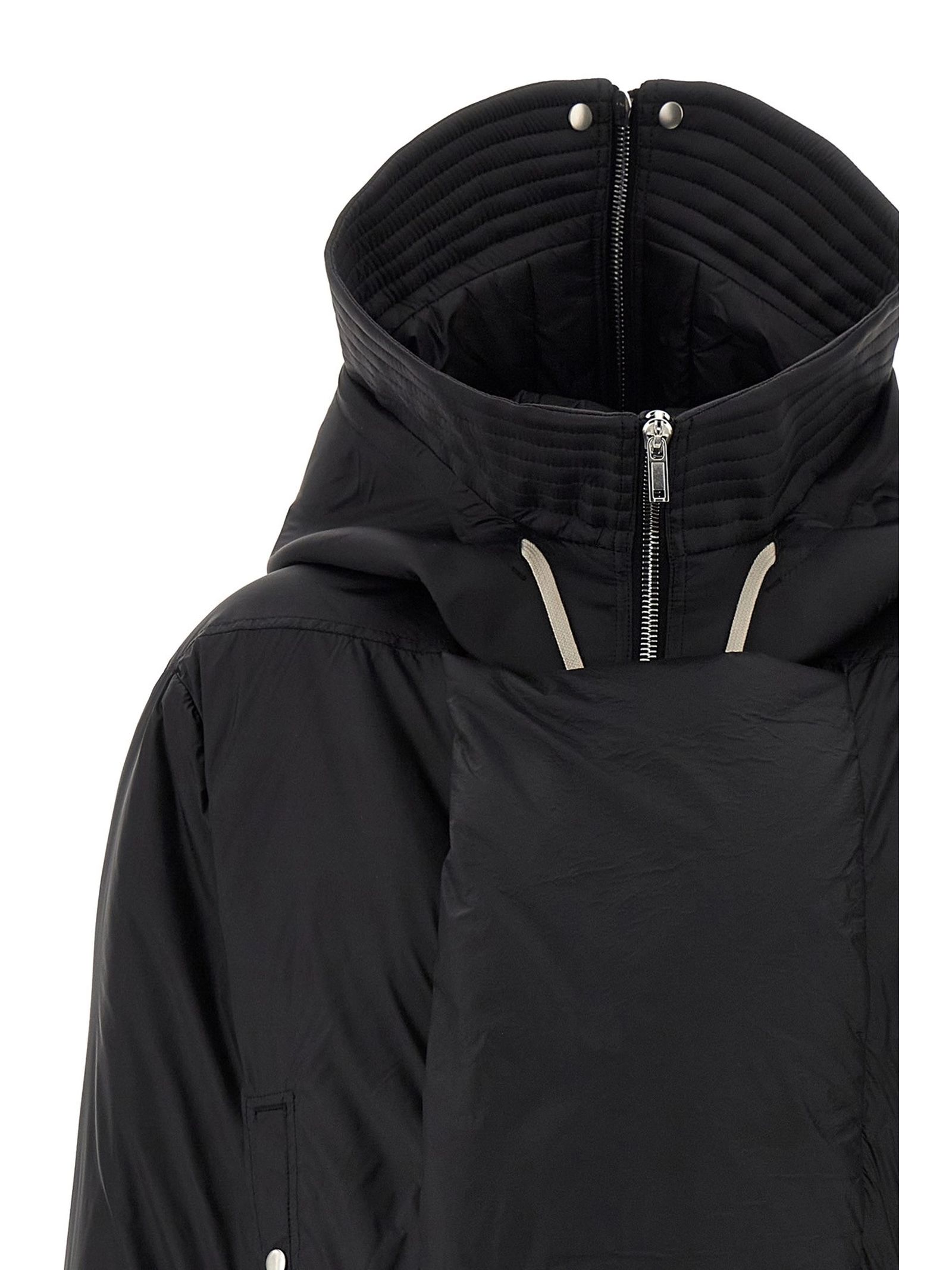 Alice parka in slightly padded airy nylon, large hood with zip that can be opened to create a wide collar on the shoulders, crop model, high neck, zip closure with asymmetric flap with overlapping snap button closure on the front, pockets, long sleeves with stretch knit cuffs, stretch knit hem