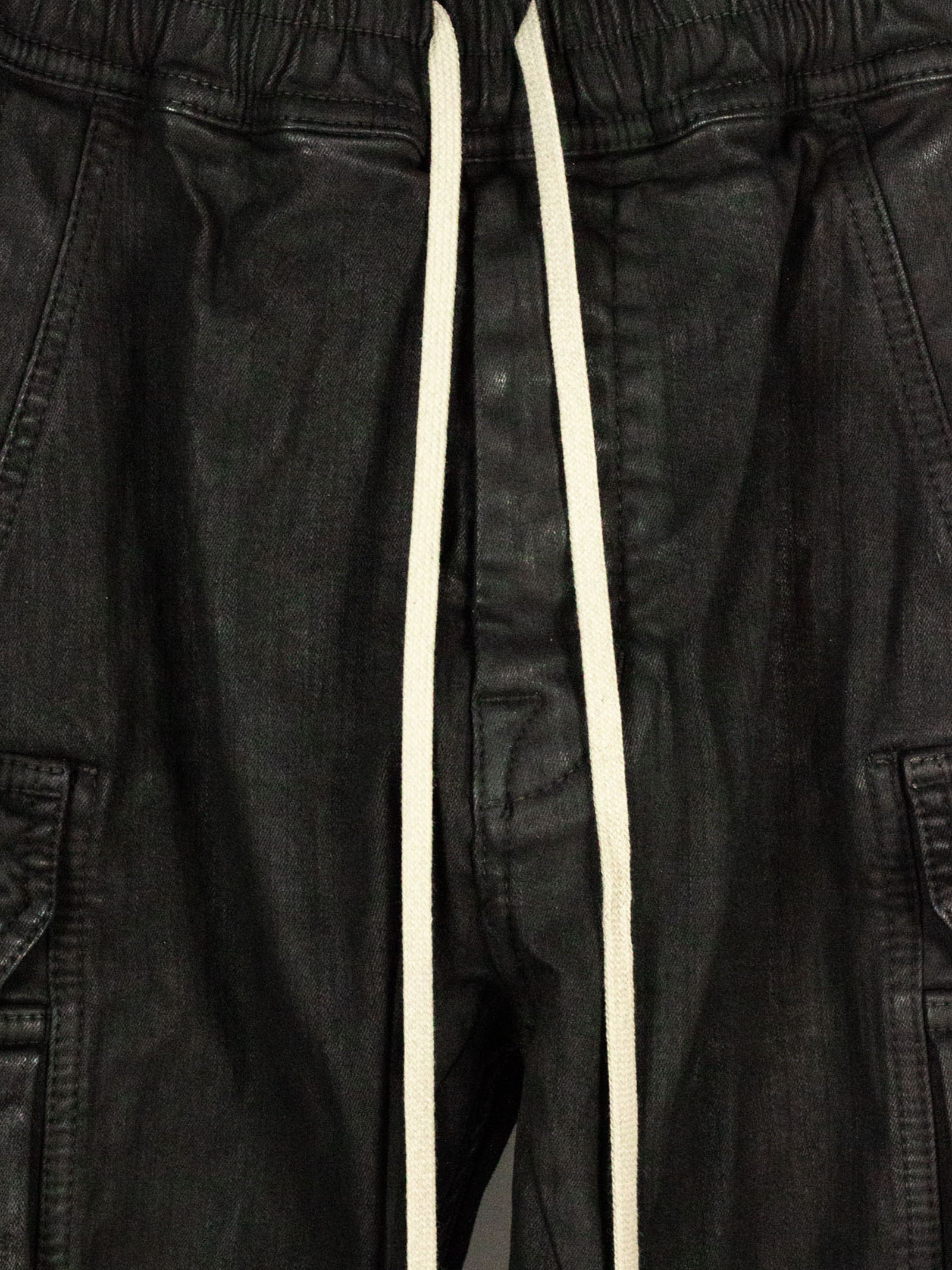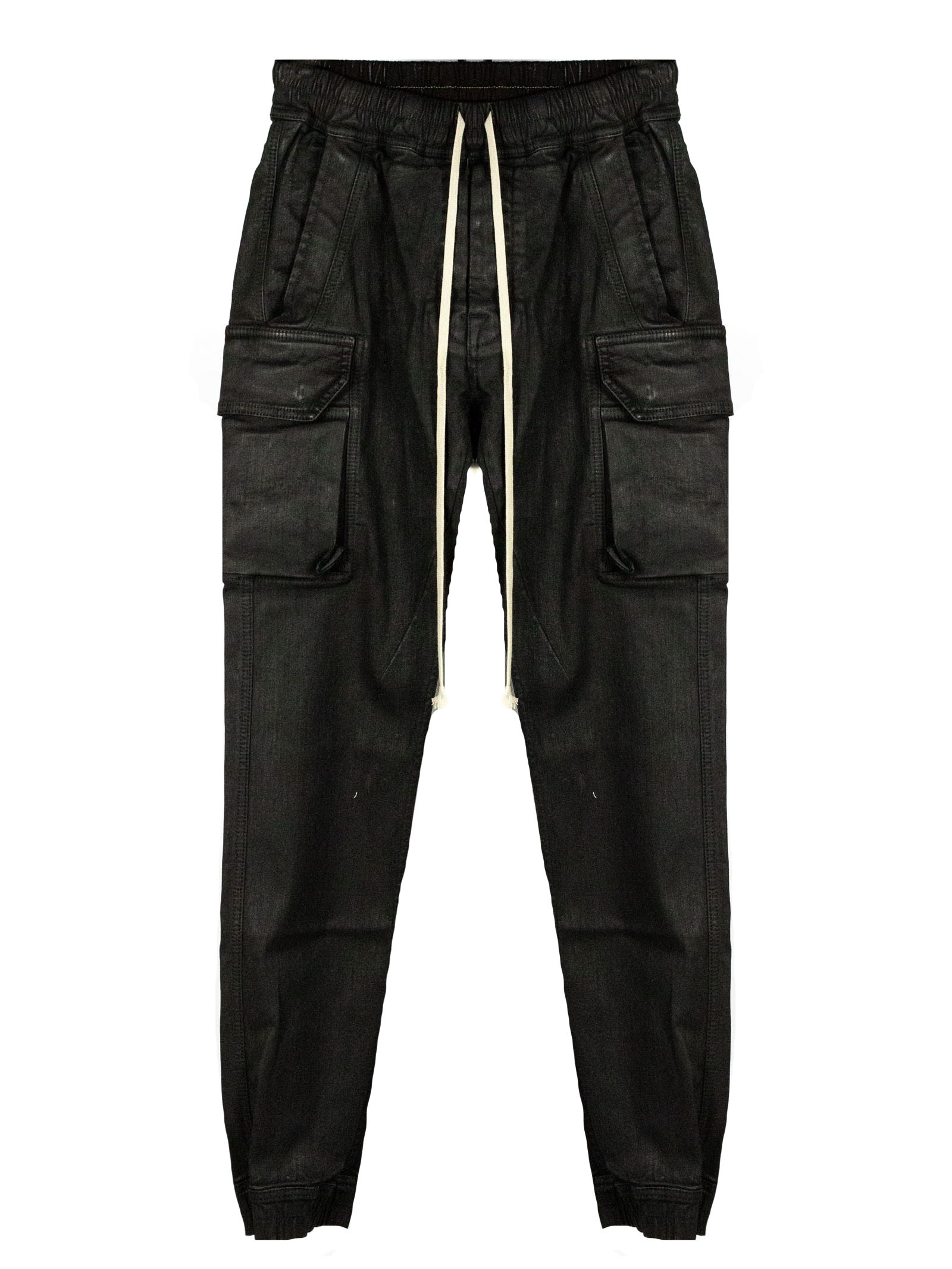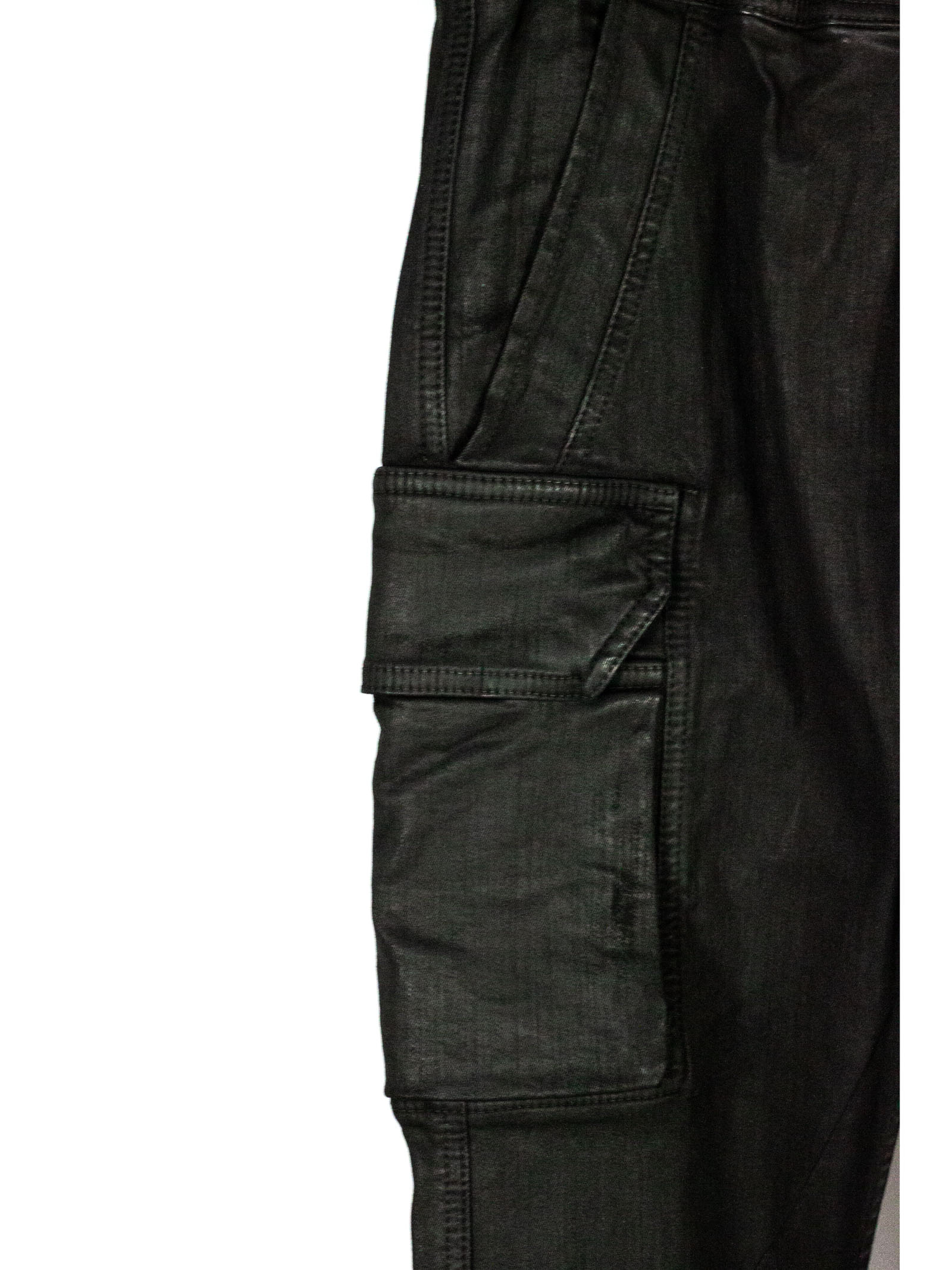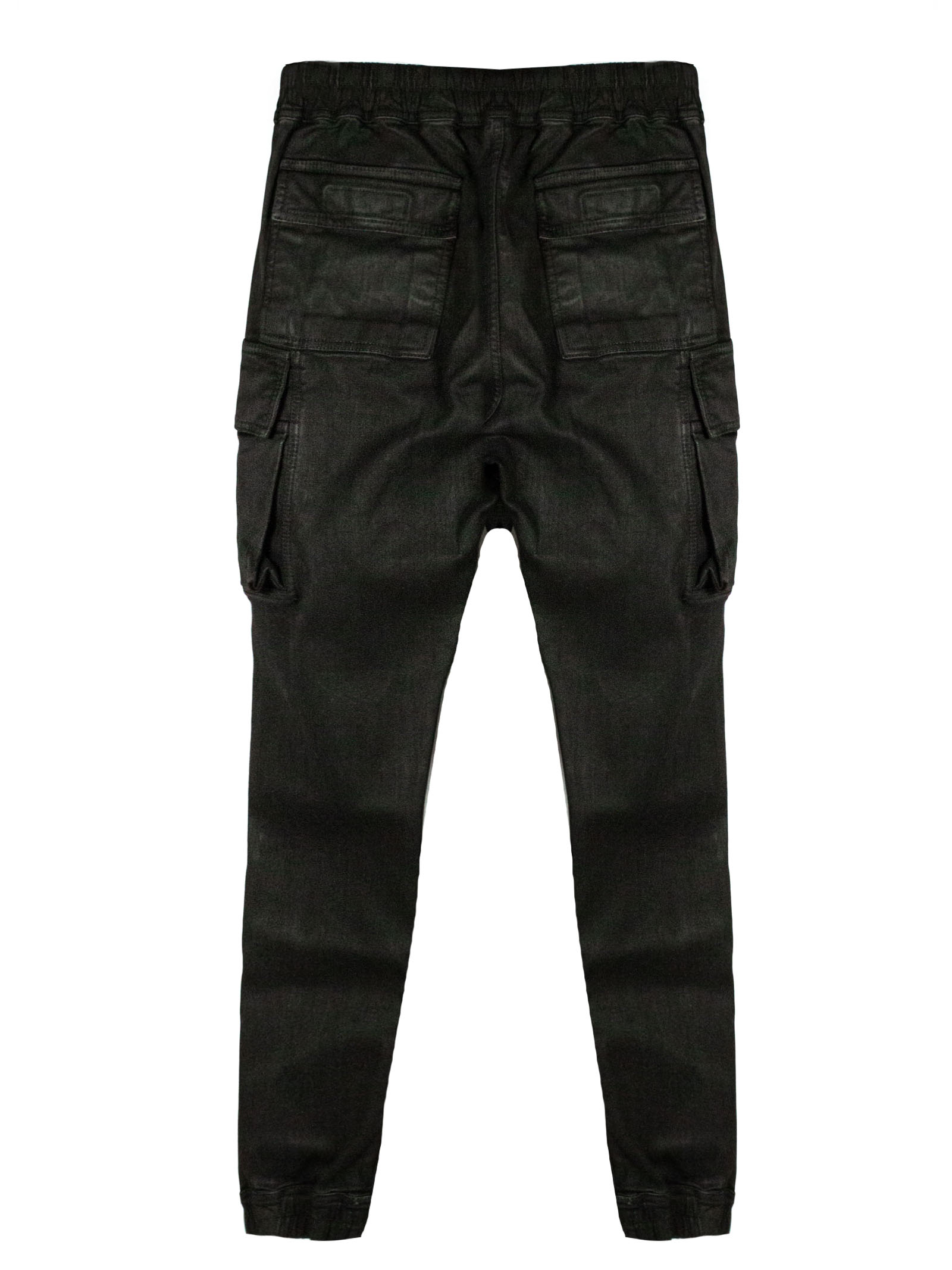 Black Wax Stretch Denim Pants, Slim Fit, Elasticized Waistband With Drawstring And Elasticized Cuffs. They Feature Two Side Welt Pockets, Two Zippered Cargo Pockets With Beveled Flaps On The Outer Thigh, And Back Patch Pockets With Flaps And Topstitching