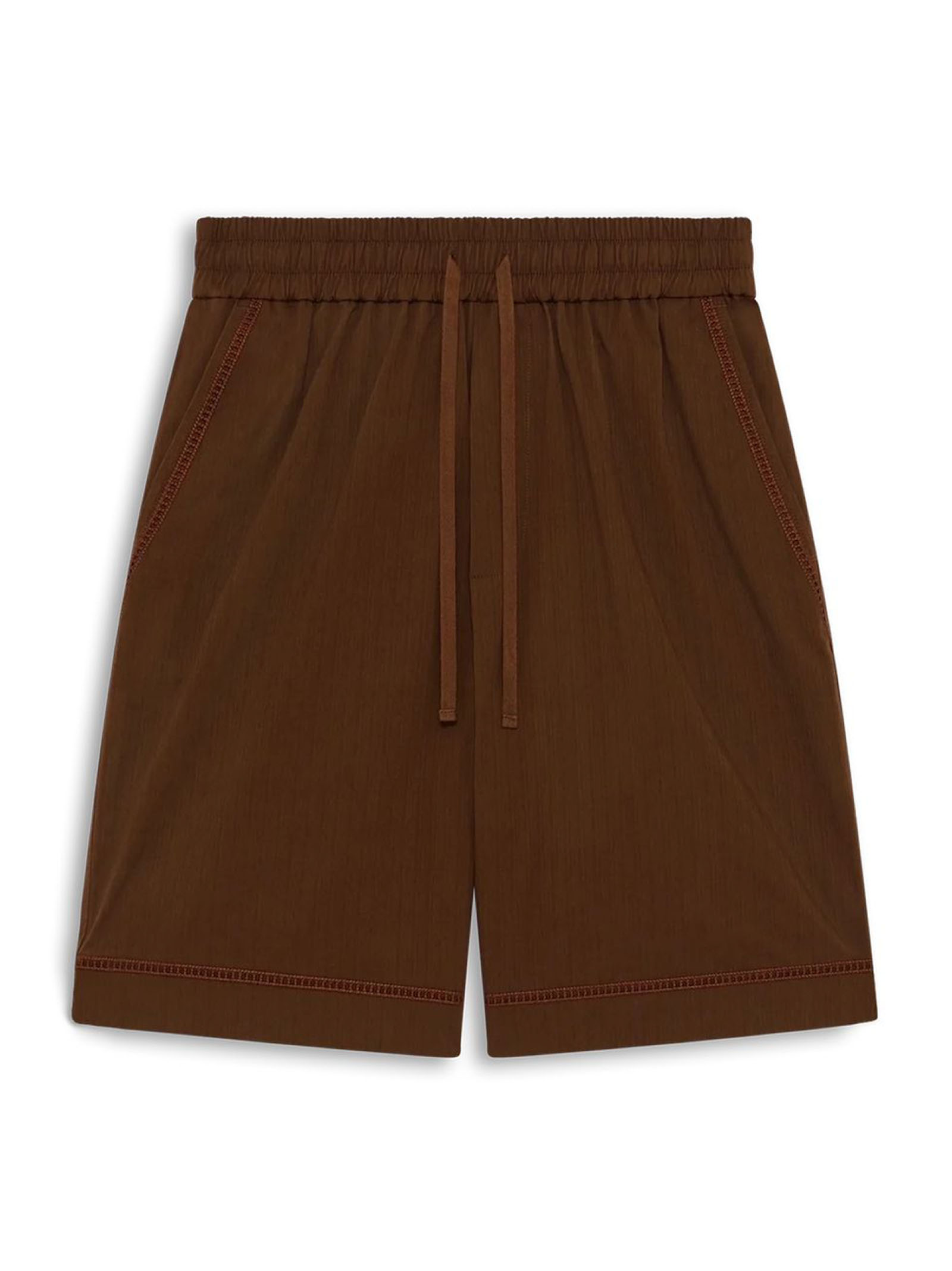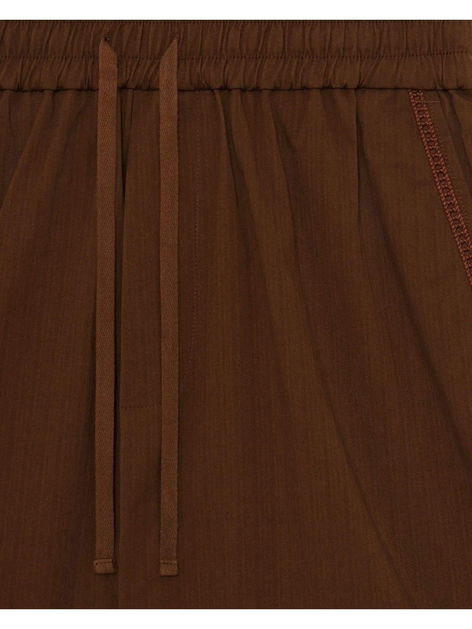 Brown cotton blend elasticated shorts, Elasticated shorts with drawstrings, 2 front Italian pockets, 1 patch pocket at the back, Echelle embroidery on the front and back pocket