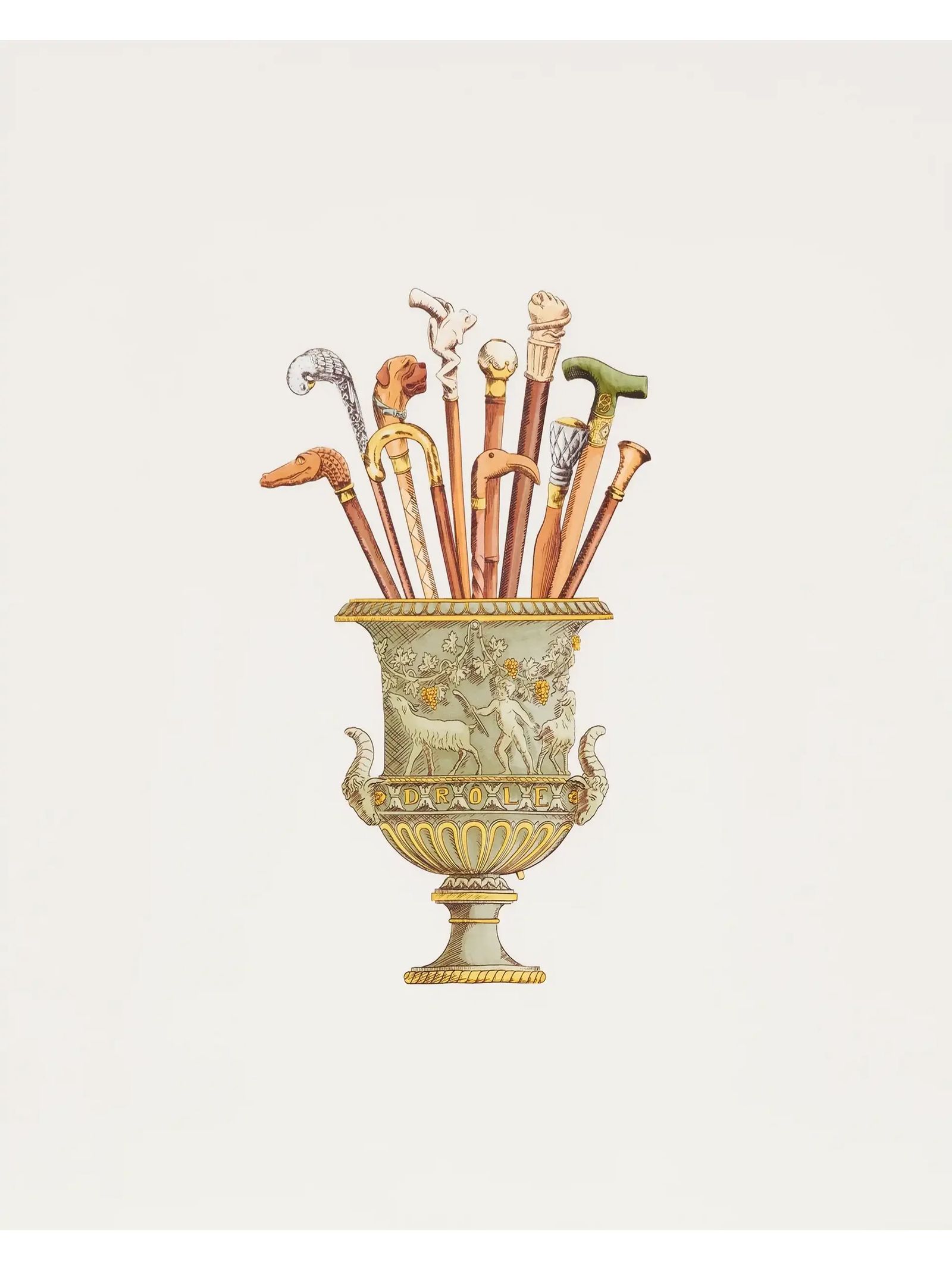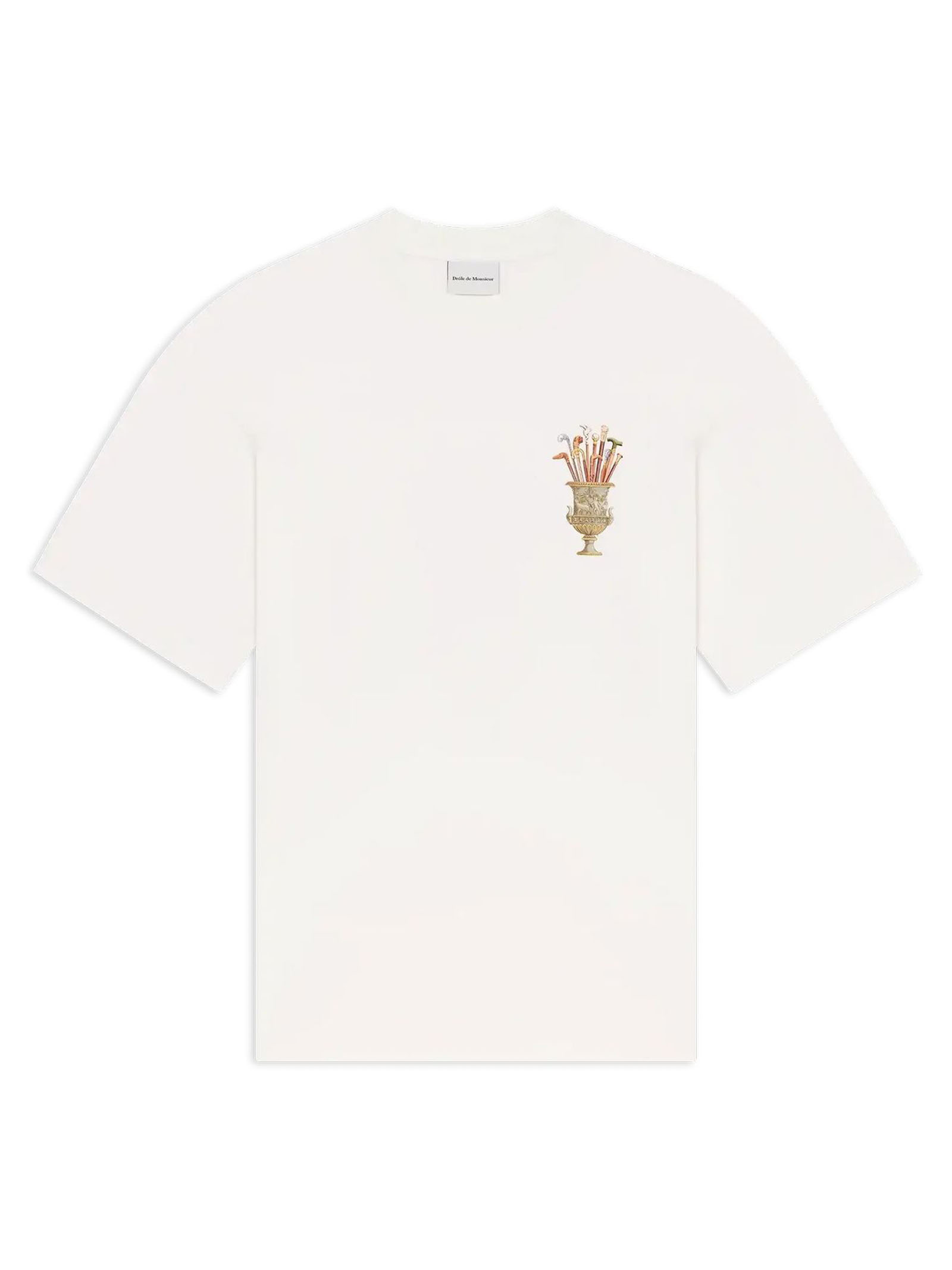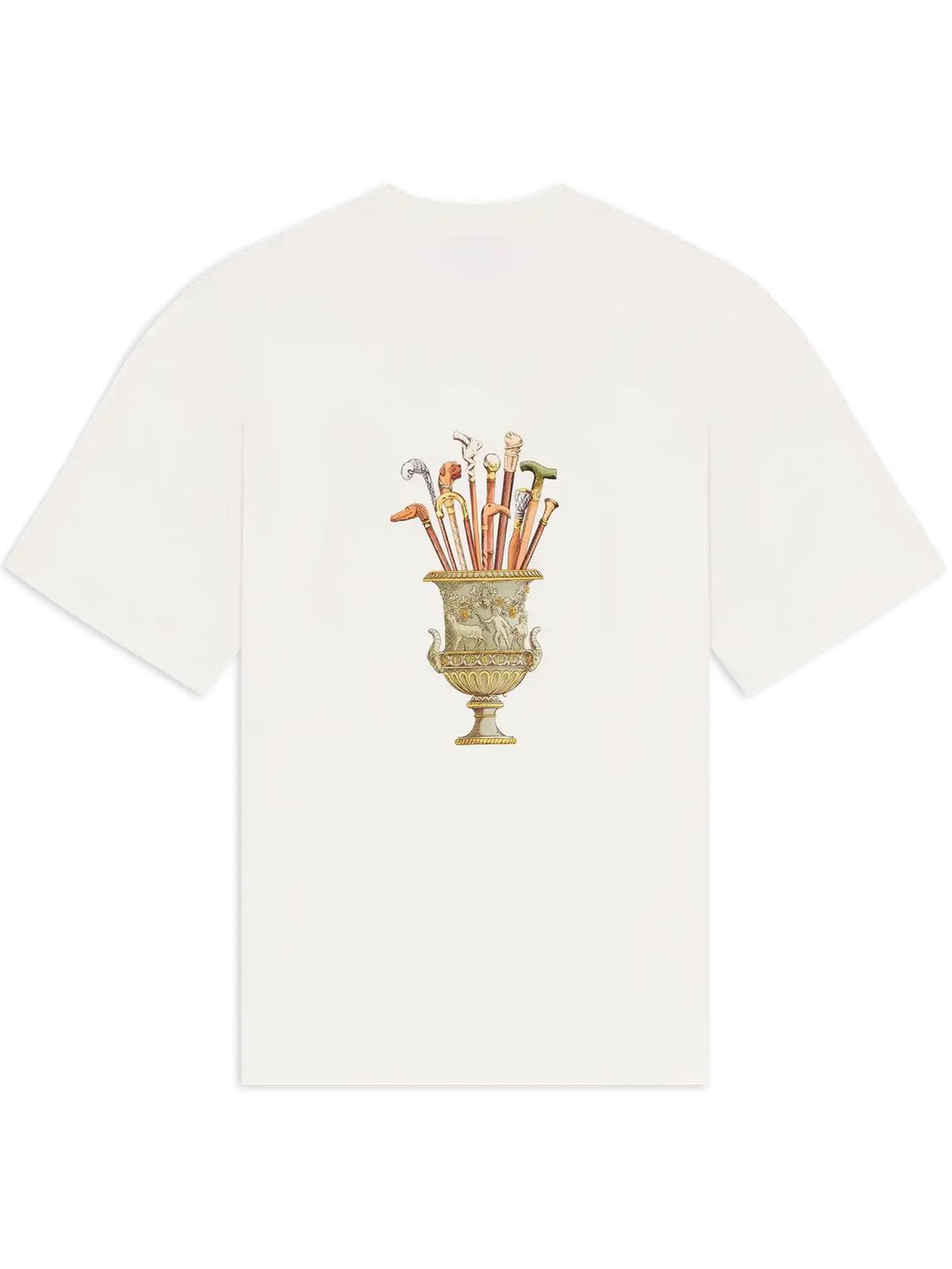 Off-white cotton t-shirt with a ribbed collar features a Vase Cannes print on the front and back