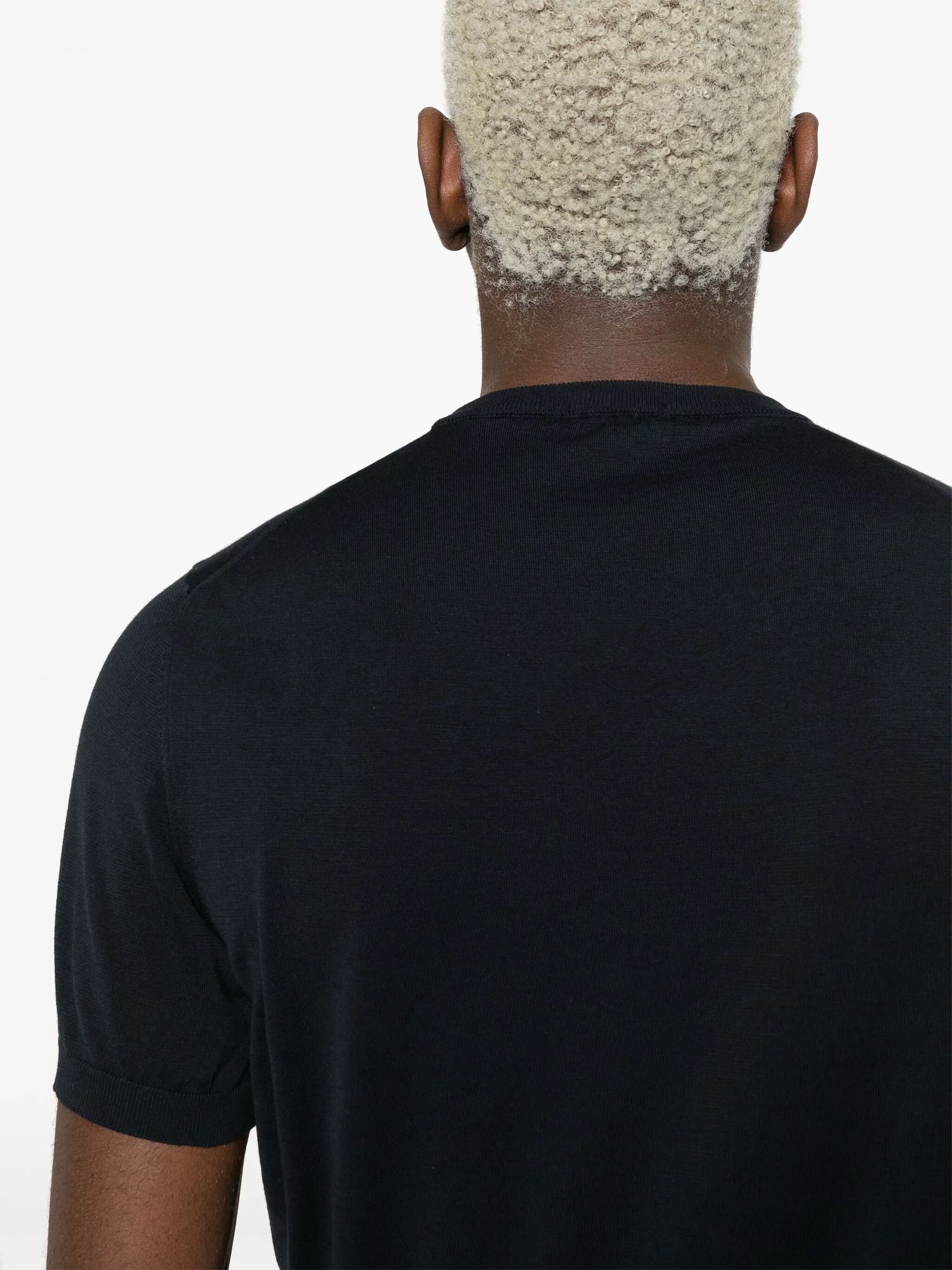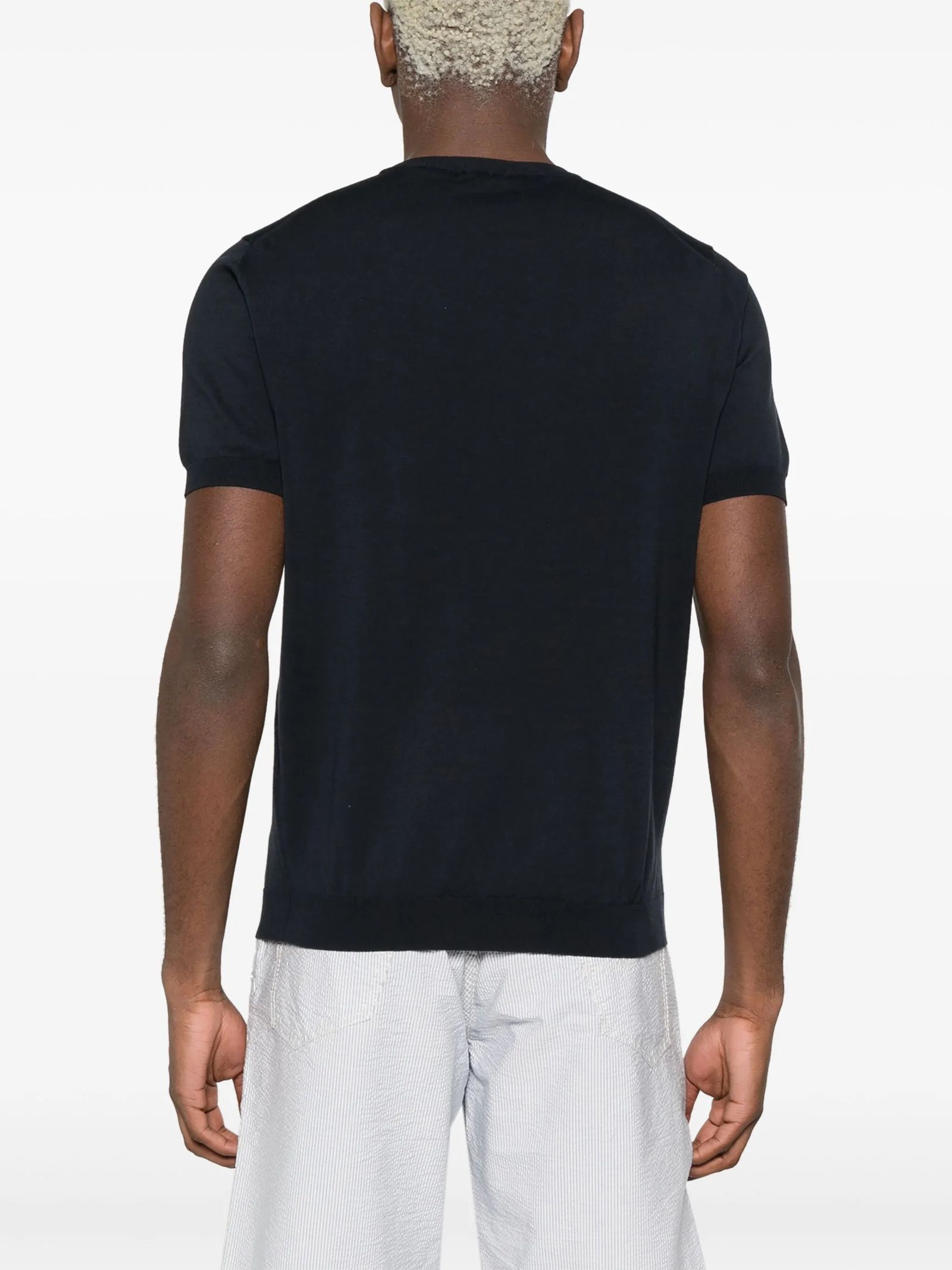 Dark Blue fine knit cotton T-shirt, knitted design, ribbed finish, round neck, short sleeves, unlined design, straight hem