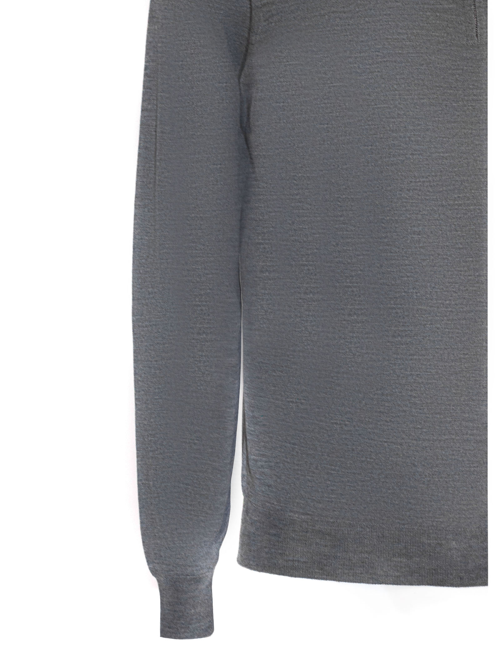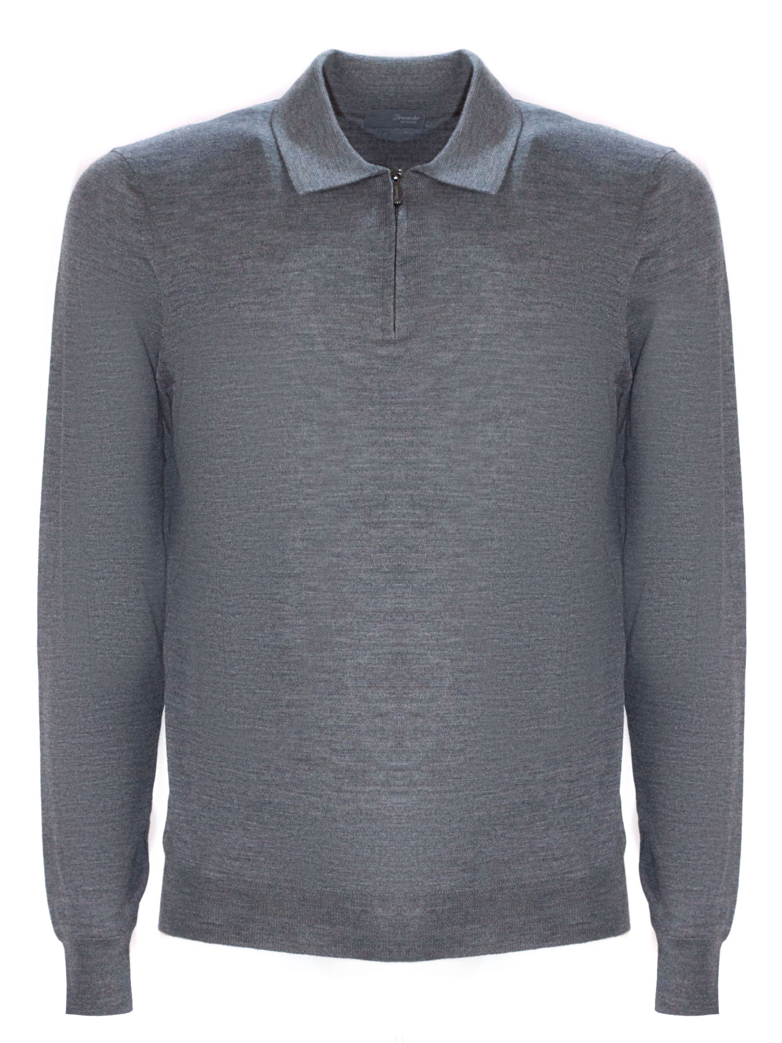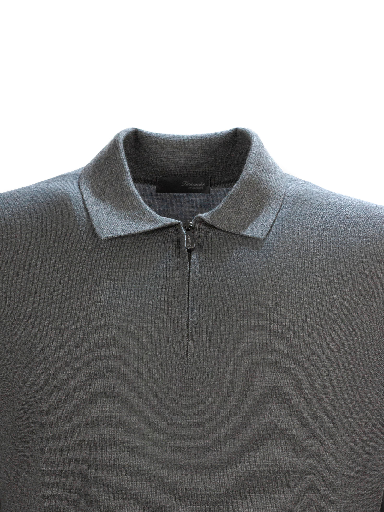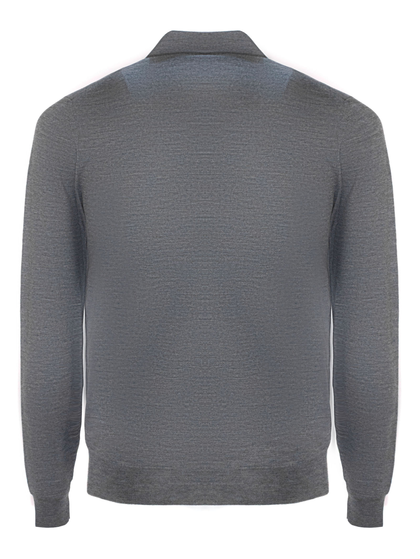 Grey merino wool polo shirt with classic collar and zip, long sleeves, ribbed trim