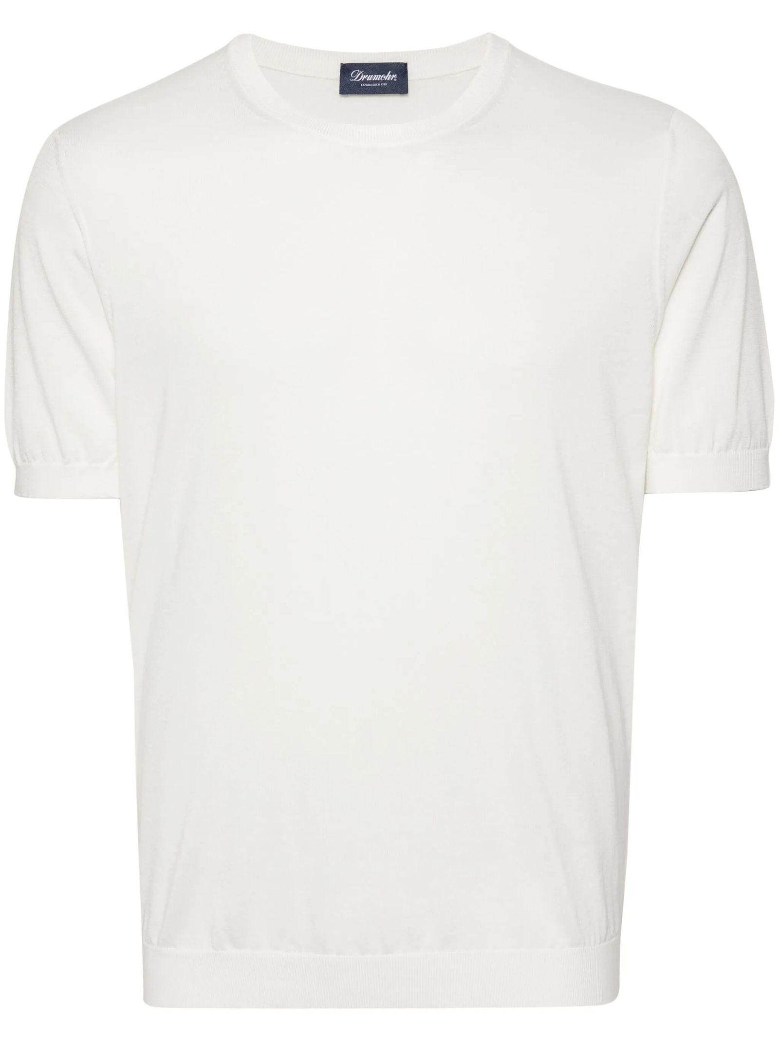 White fine knit cotton T-shirt, knitted design, ribbed finish, round neck, short sleeves, unlined design, straight hem