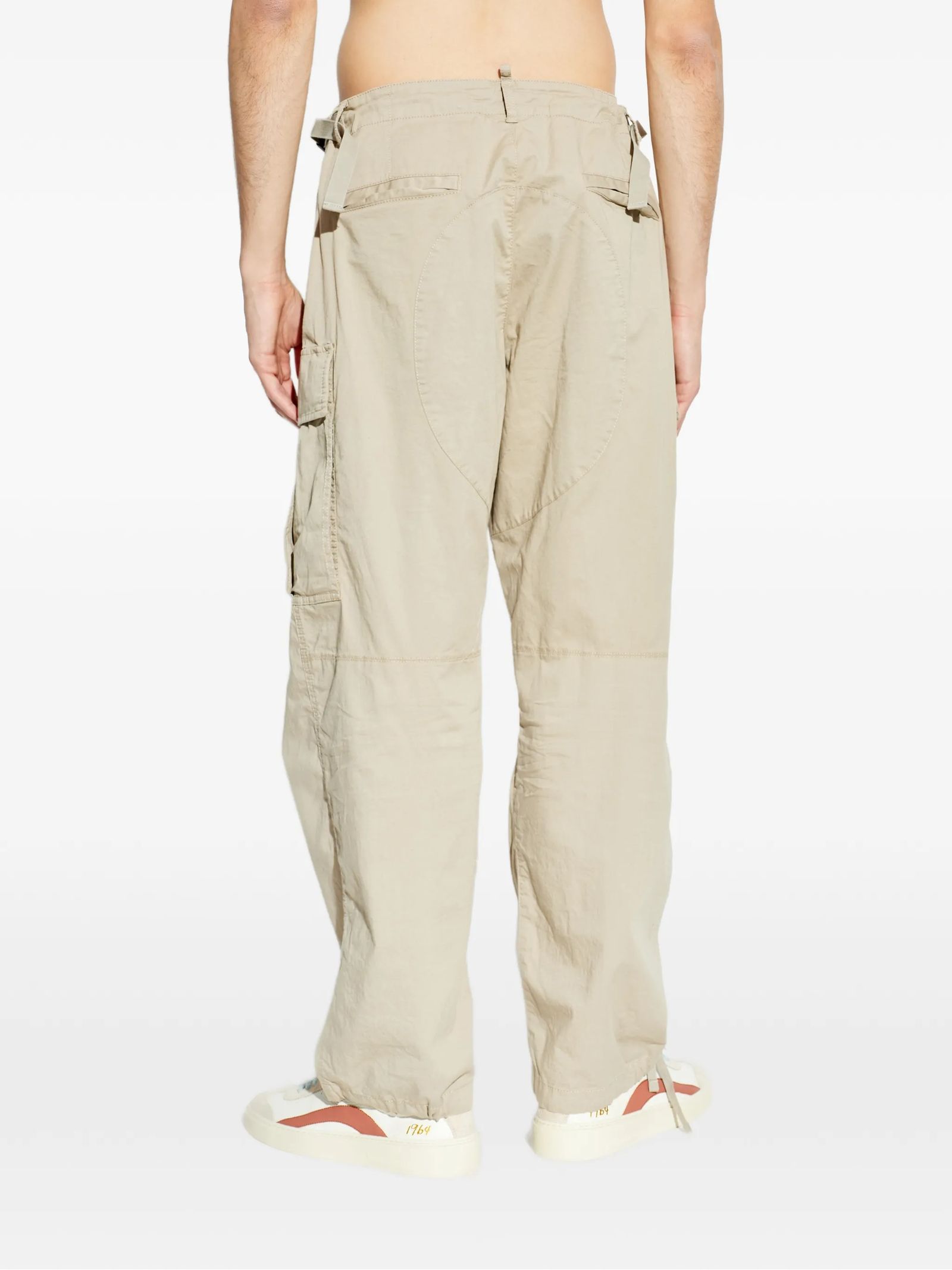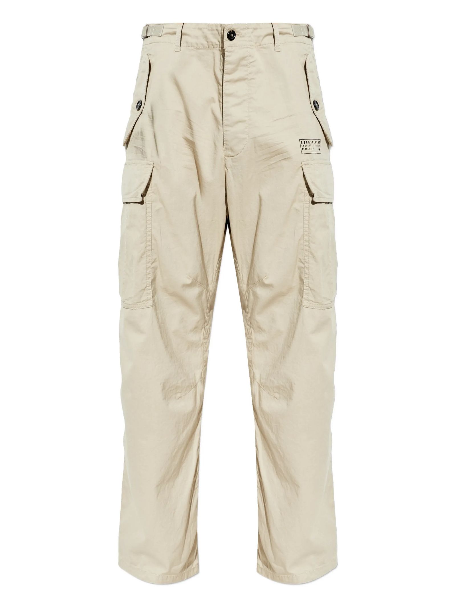 Cream cotton cargo trousers, multiple pockets, button fastening, logo detail, belt loops, relaxed fit