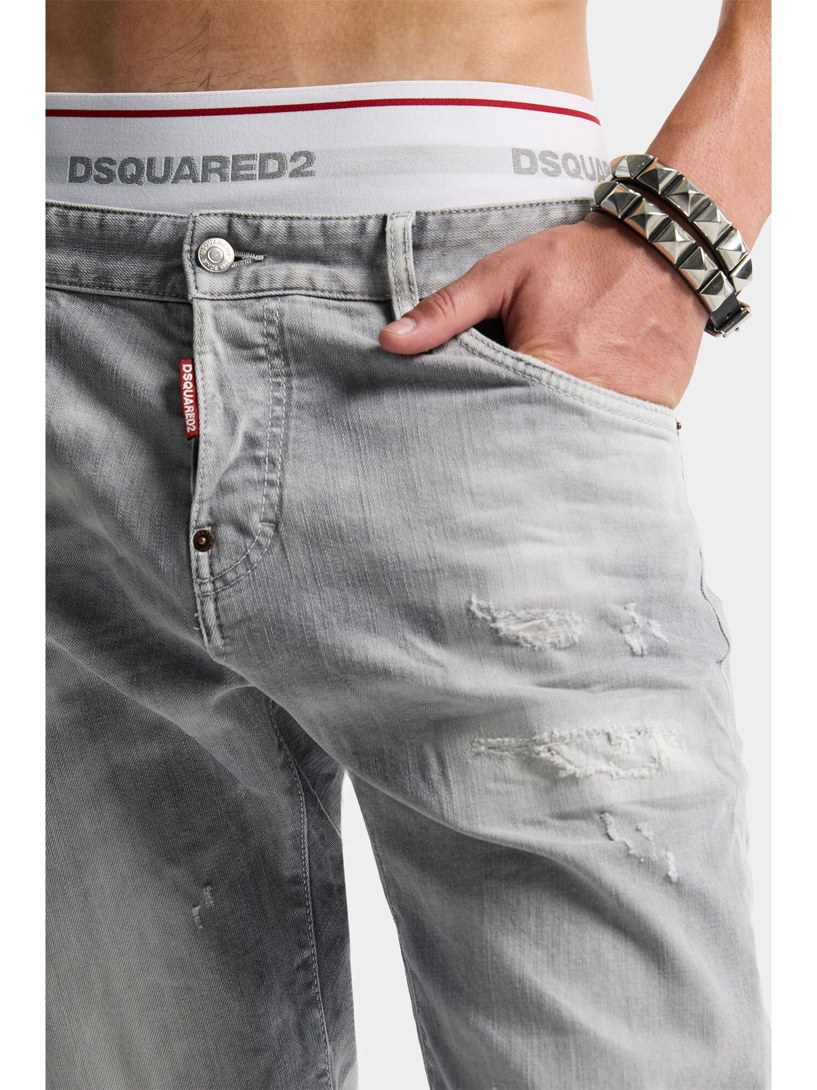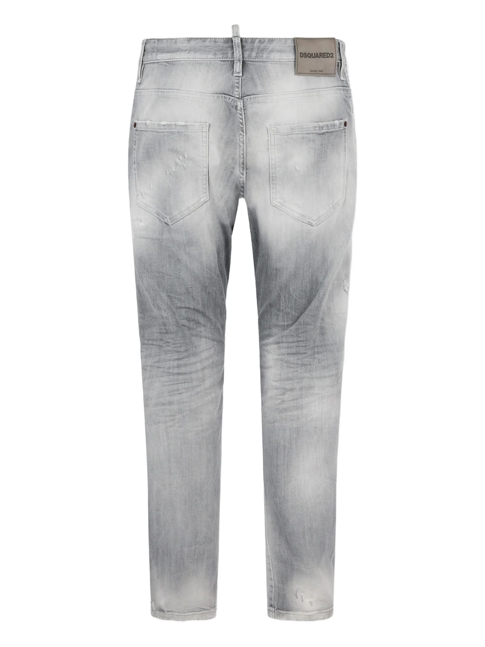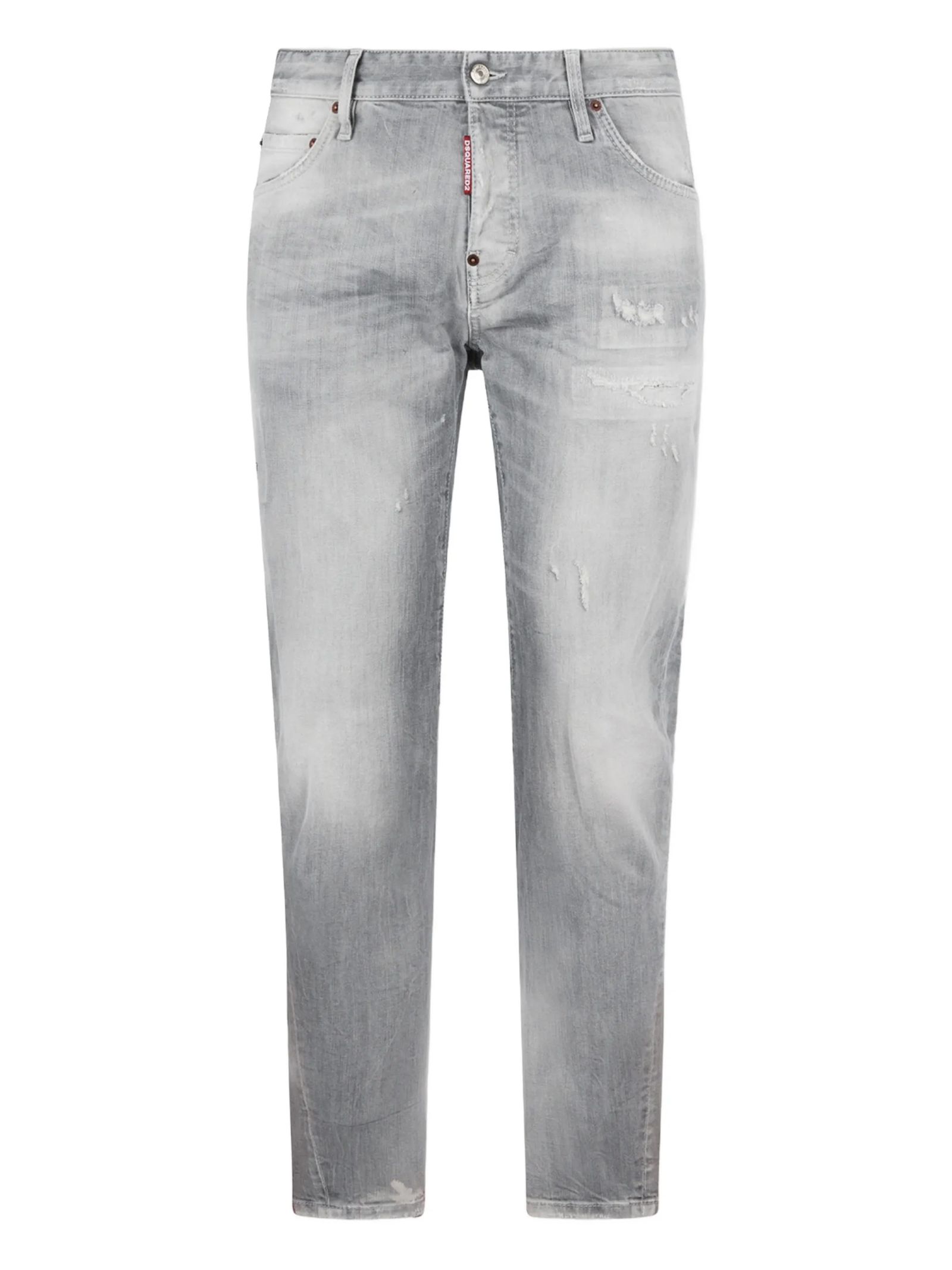 Grey cotton denim jeans with a slim fit, vintage wash and distressed details, button fly, five-pocket style, red Dsquared2 label, and logo-embossed waistband