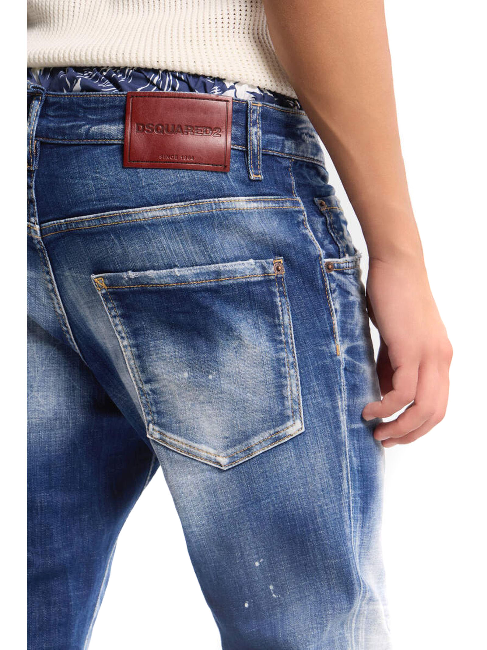 Stretch cotton denim jeans, vintage wash and distressed details, splashes of colour, concealed fastening, five-pocket style, red Dsquared2 label, logoed waistband