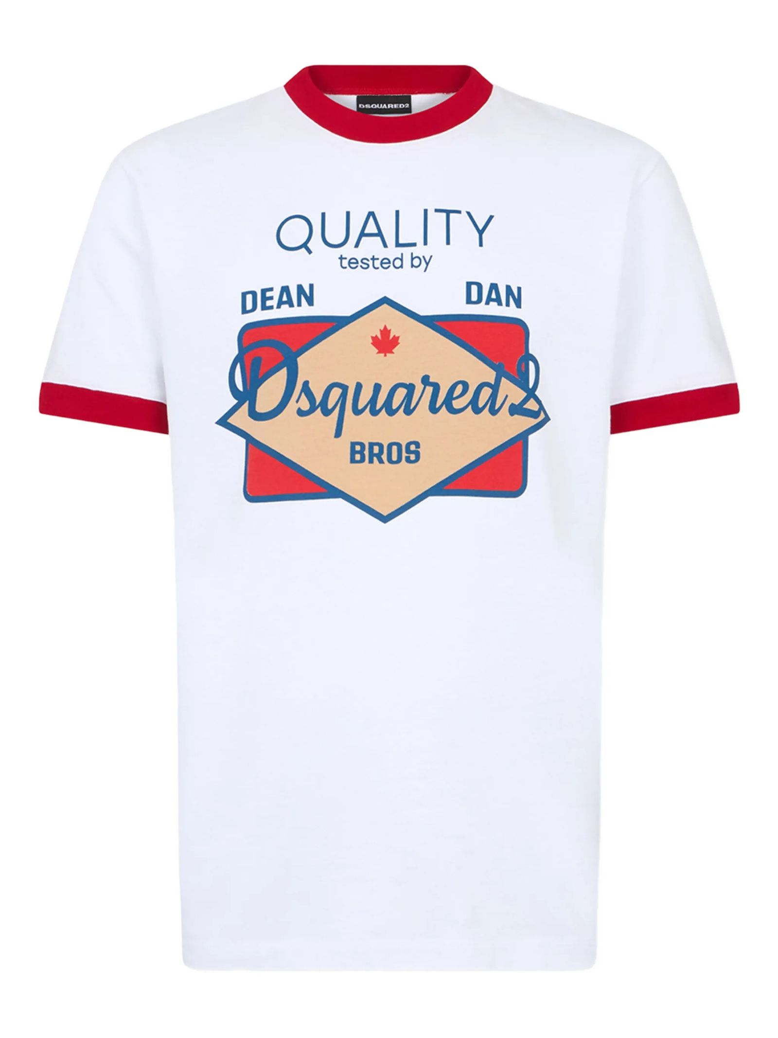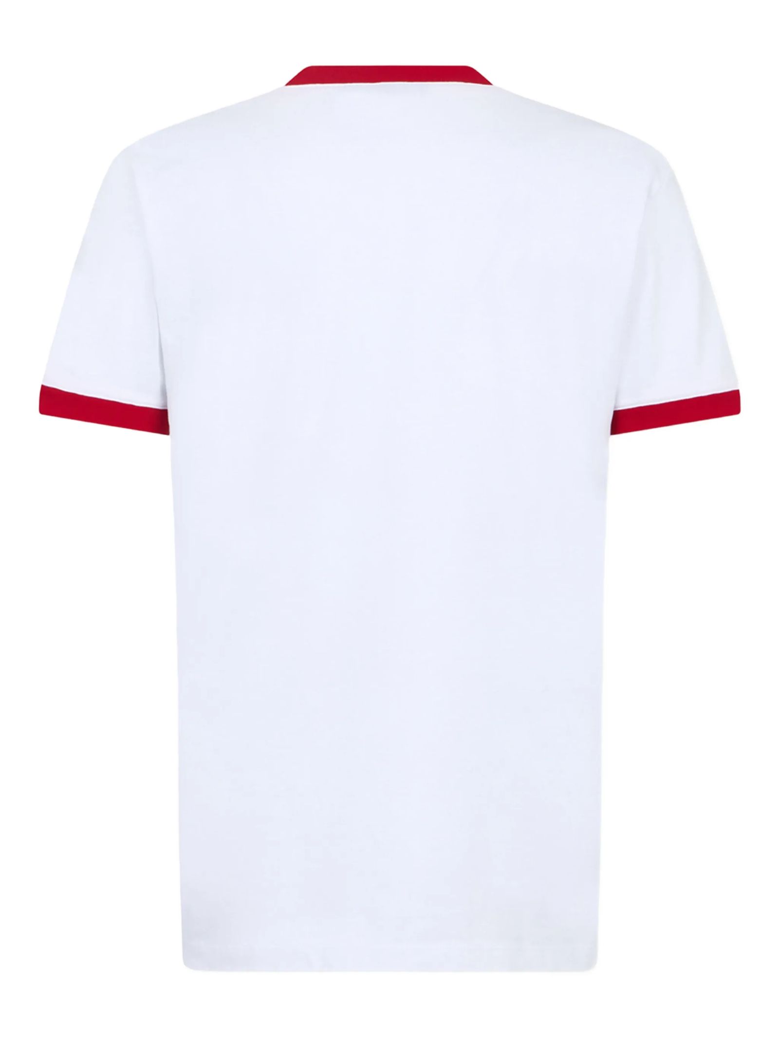 White cotton T-shirt with logo, crew neck, short sleeves, large logo print on the front, contrasting collar and sleeves, straight hem