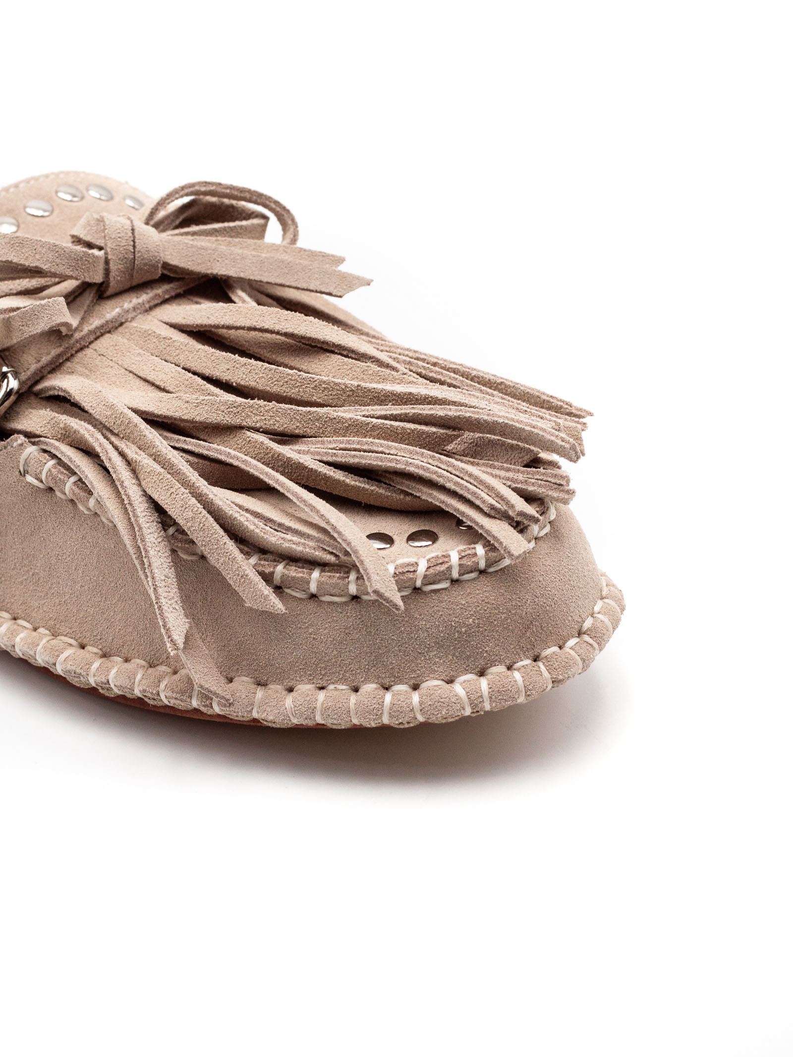 Beige suede mules with fringing, silver-coloured metal buckle detail, studs, leather sole