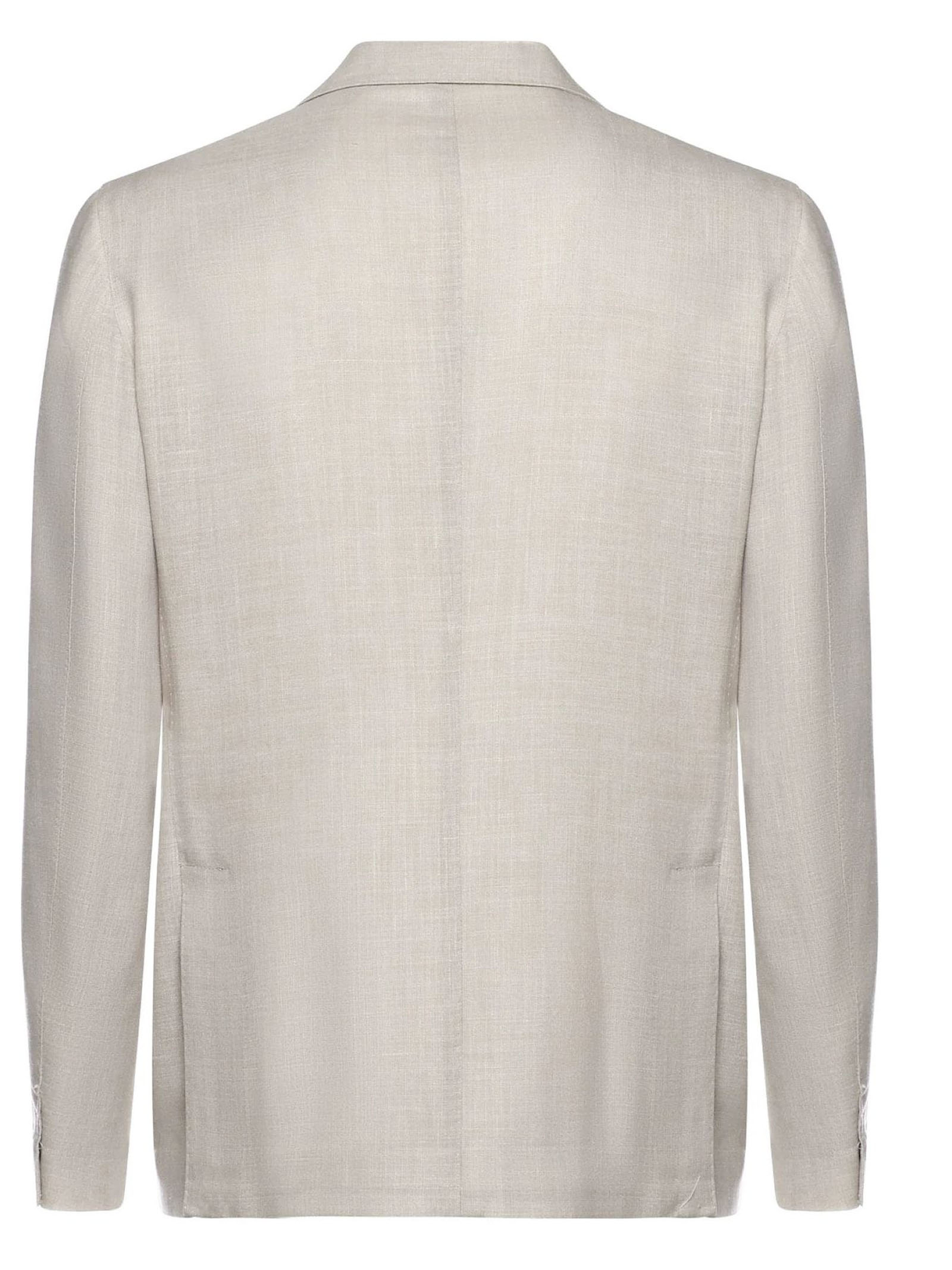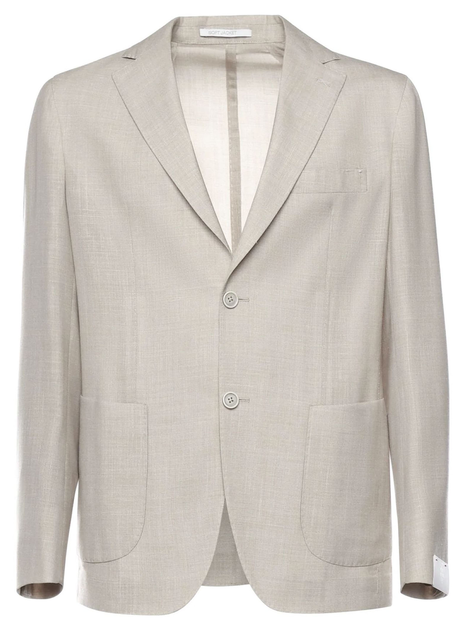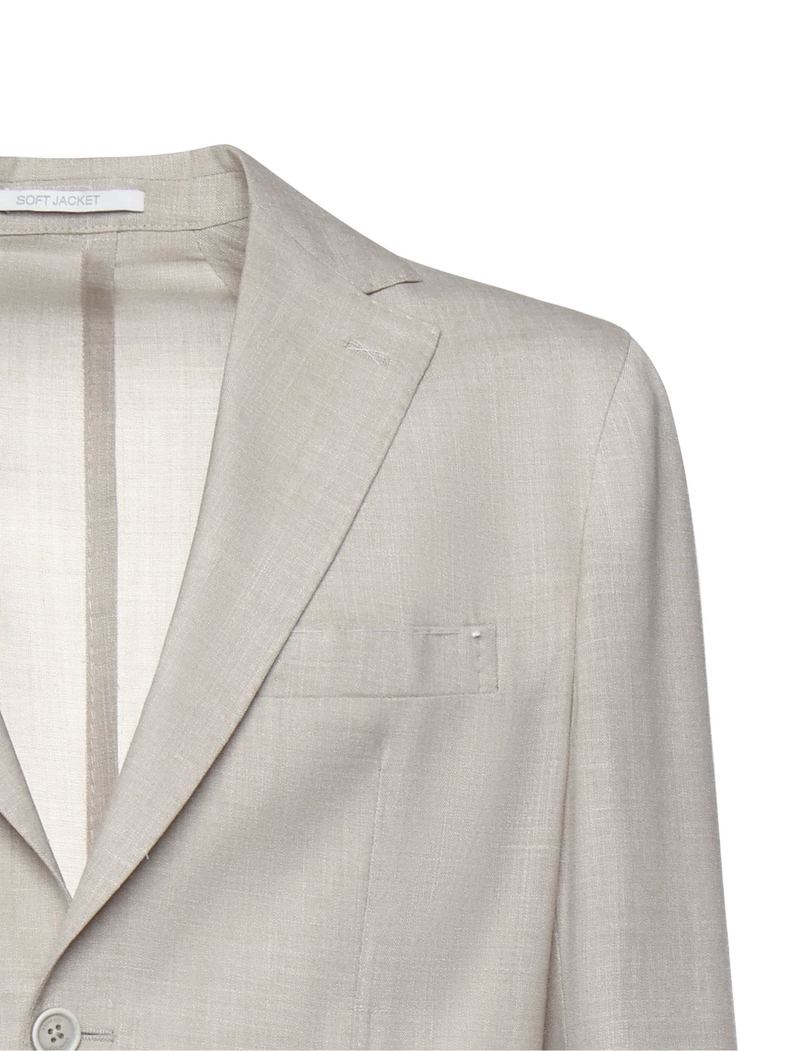 Beige single-breasted tailored blazer, made from wool, silk and linen, patch pockets, pocket square pocket, single-breasted closure with two buttons, classic lapels, regular fit