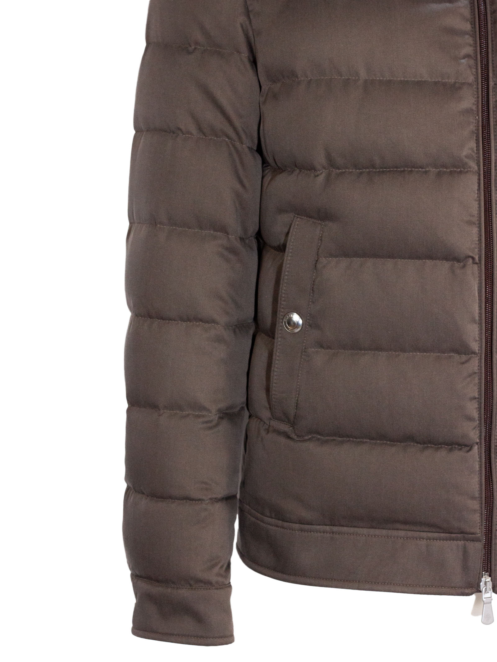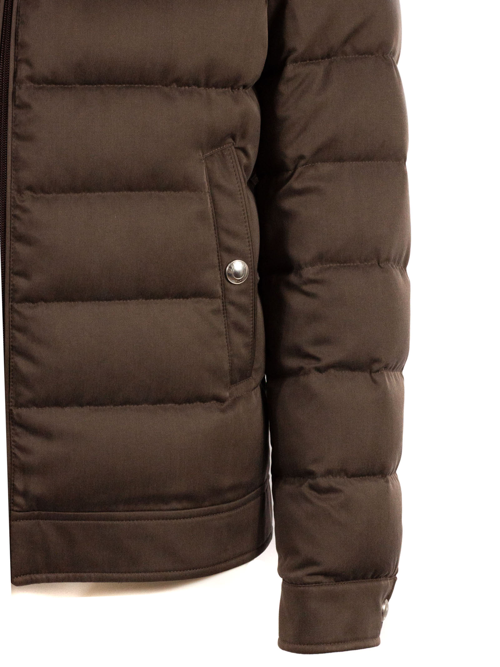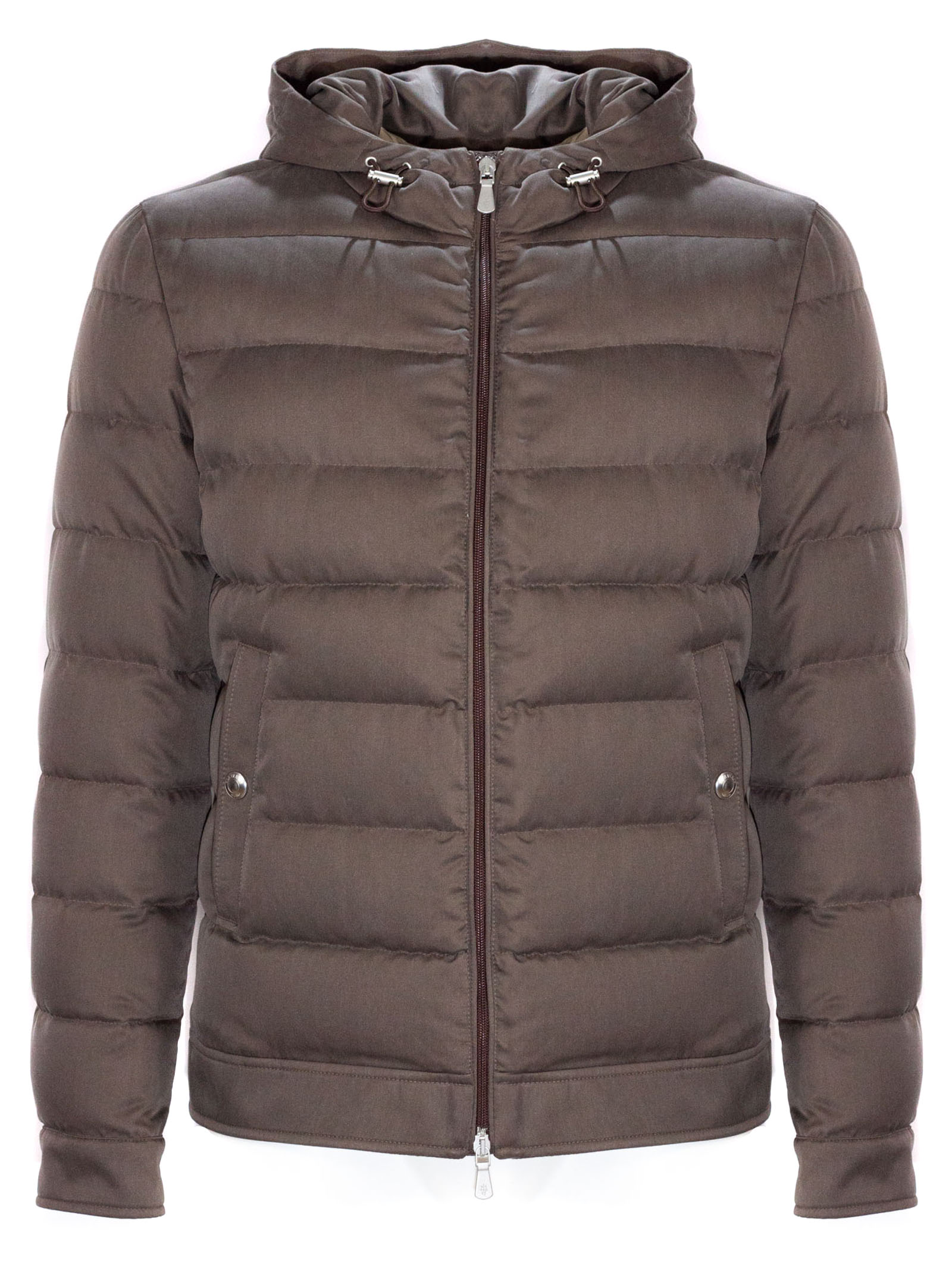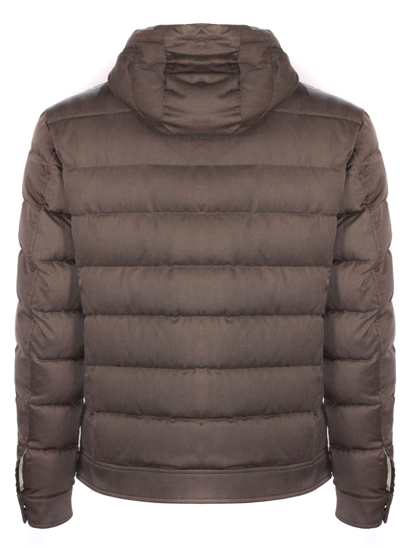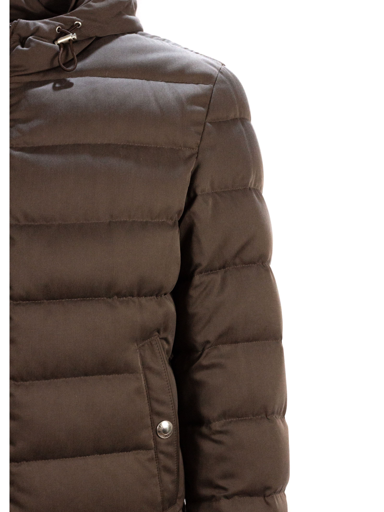 Brown silk jacket with hood, quilted design, drawstring hood, zip fastening, long sleeves
