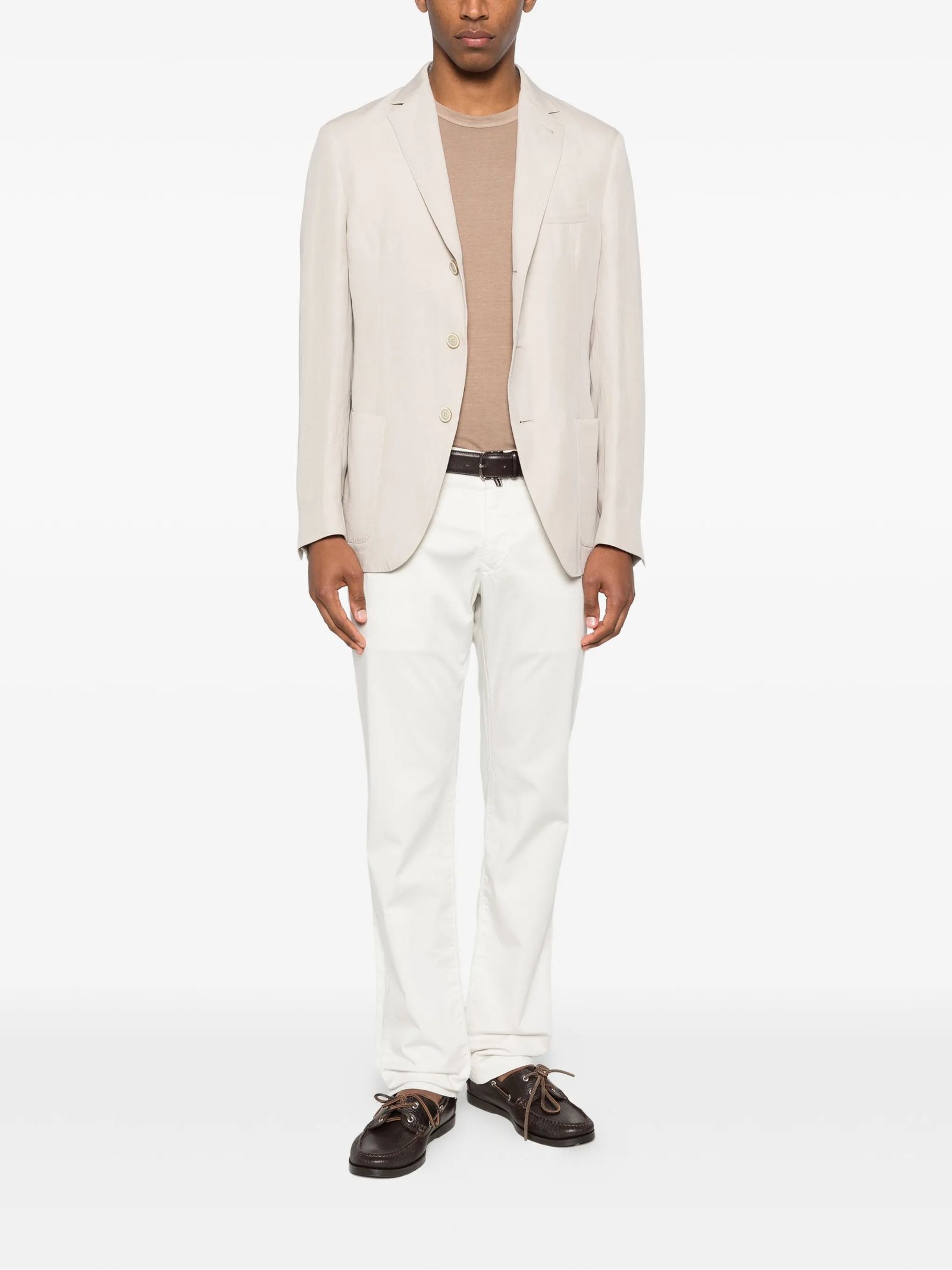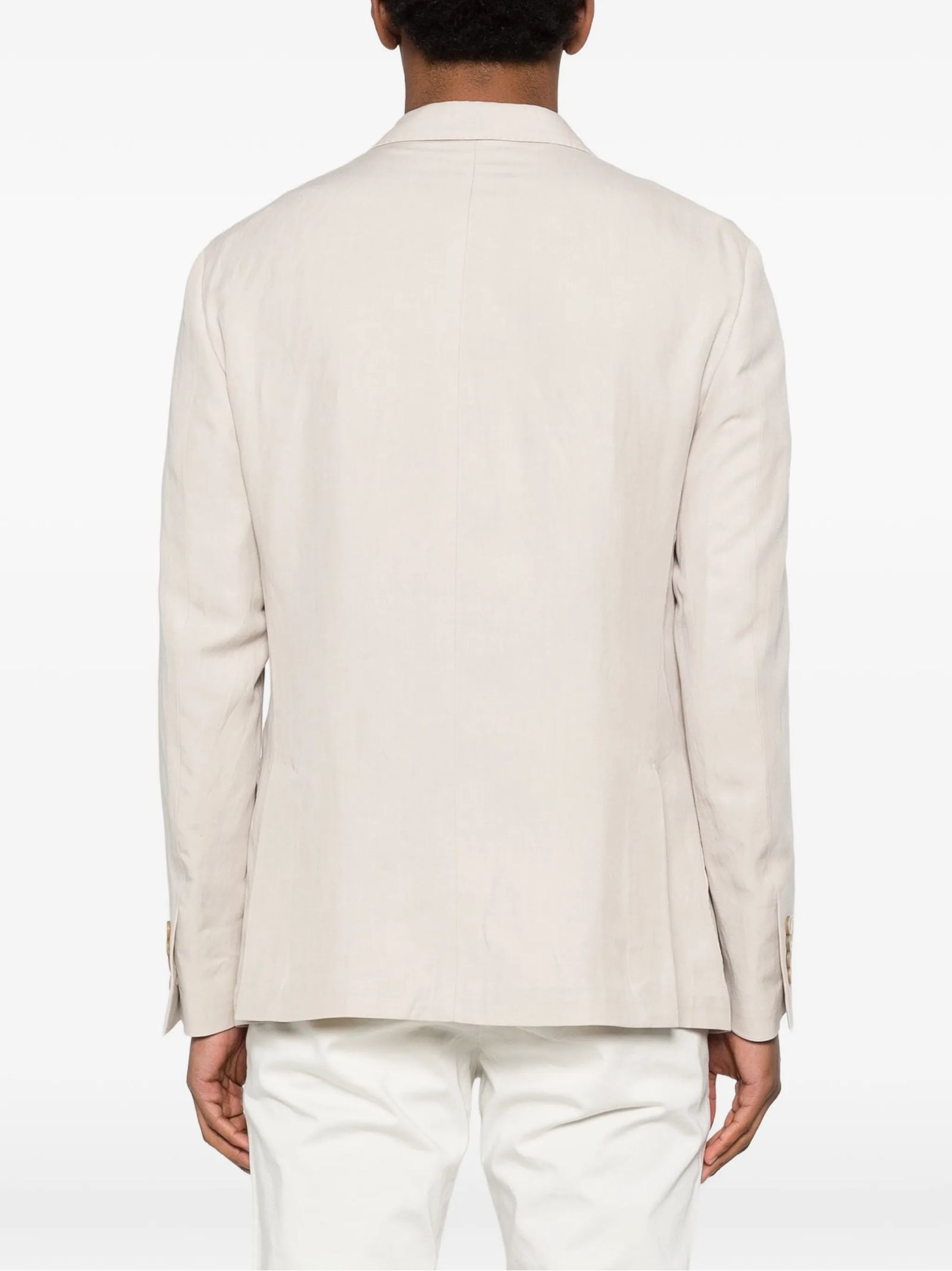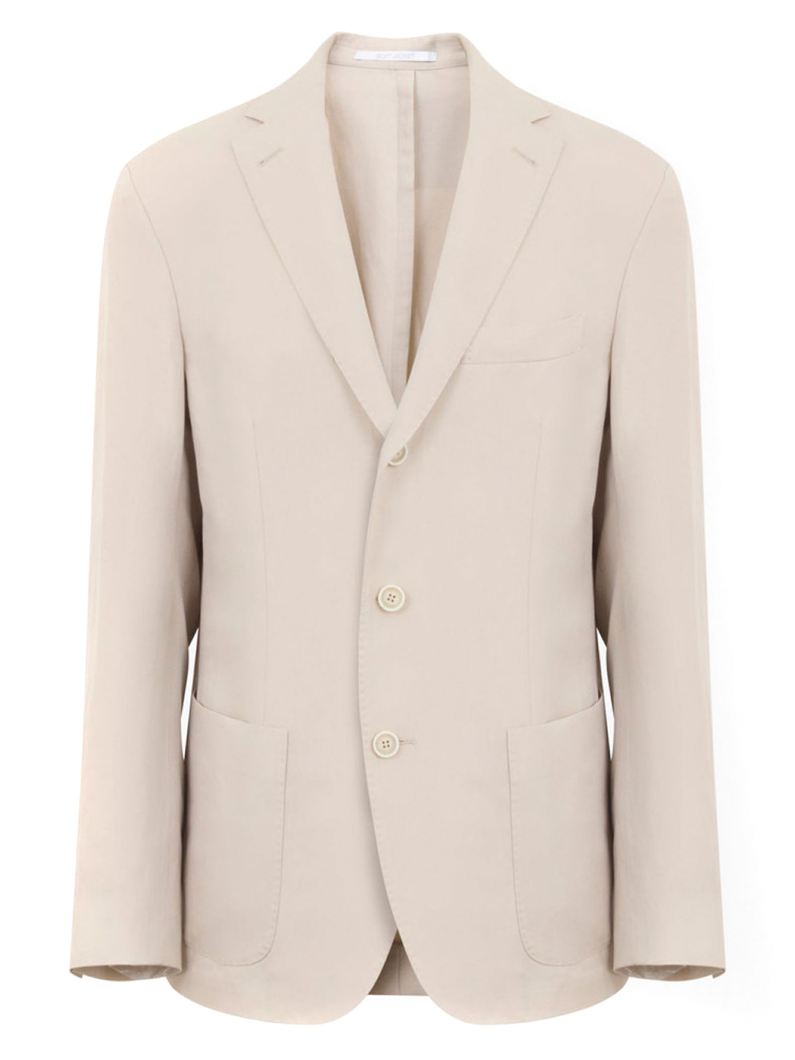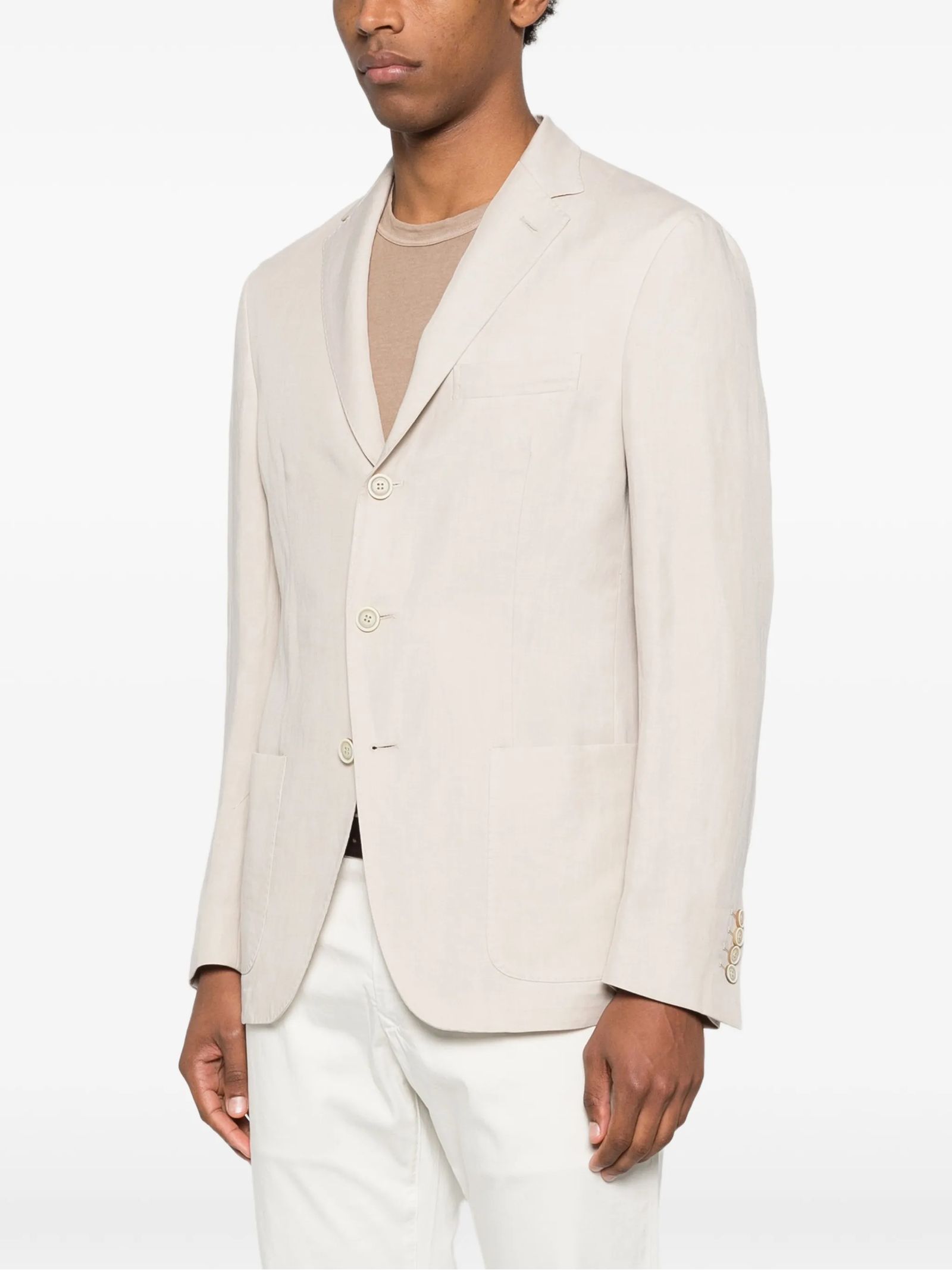 Light beige linen blazer featuring notched lapels, button fastening, patch pockets, buttoned cuffs