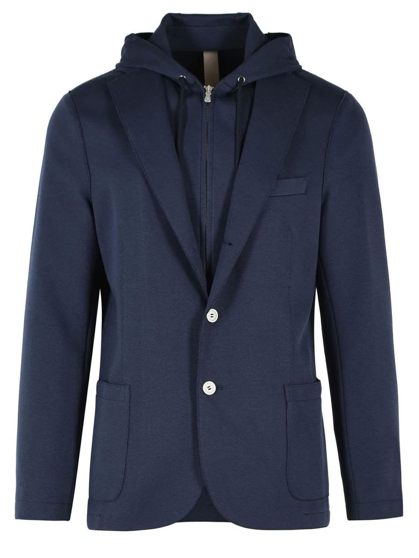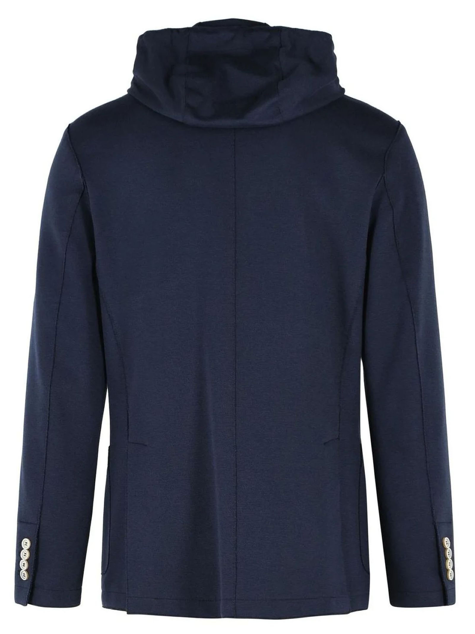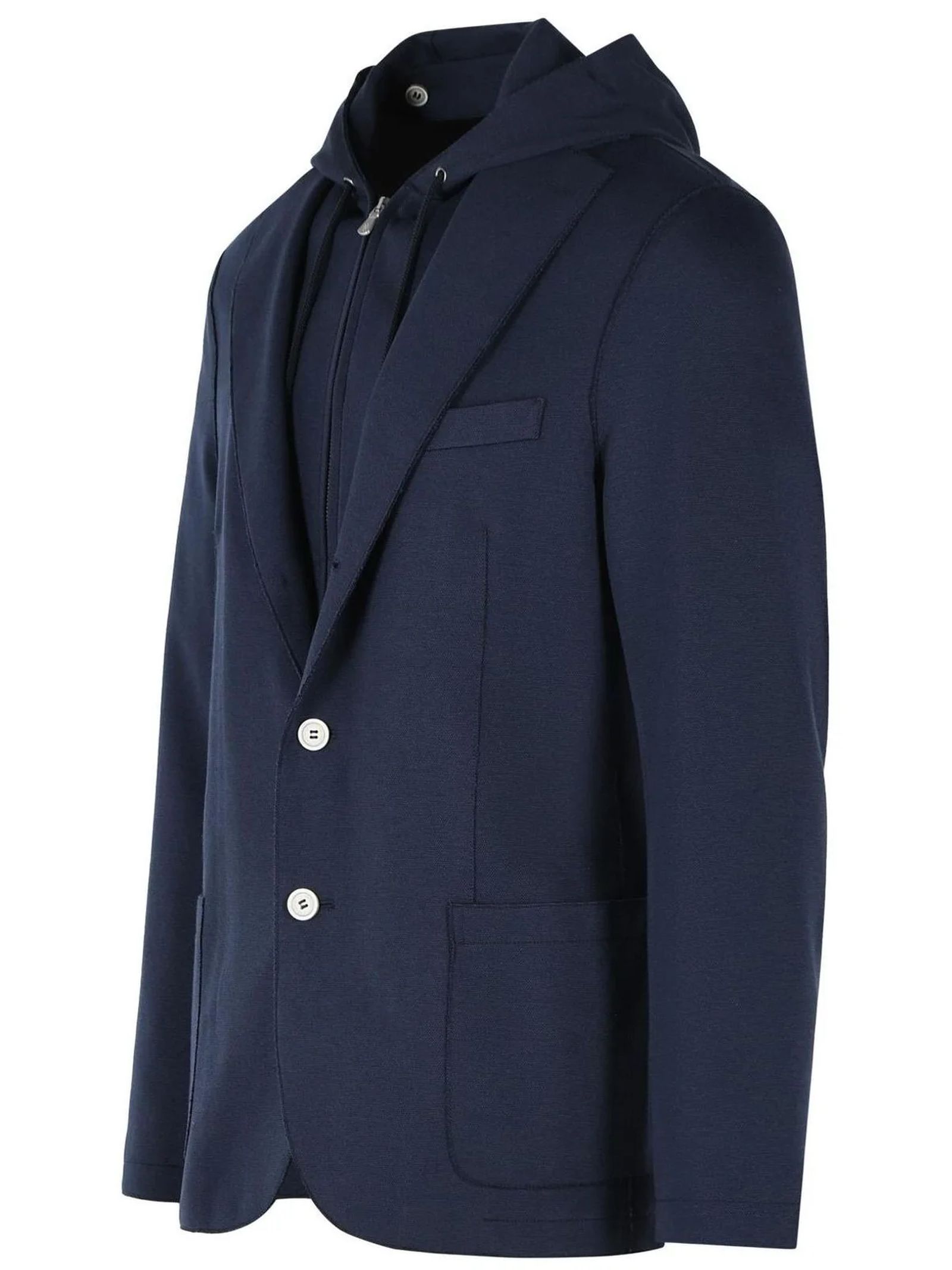 Single-breasted jacket in blue cotton blend jersey, featuring classic lapels, front button closure, removable bib with hood, multiple pockets, long sleeves with buttoned cuffs and side slits, semi-lined interior.