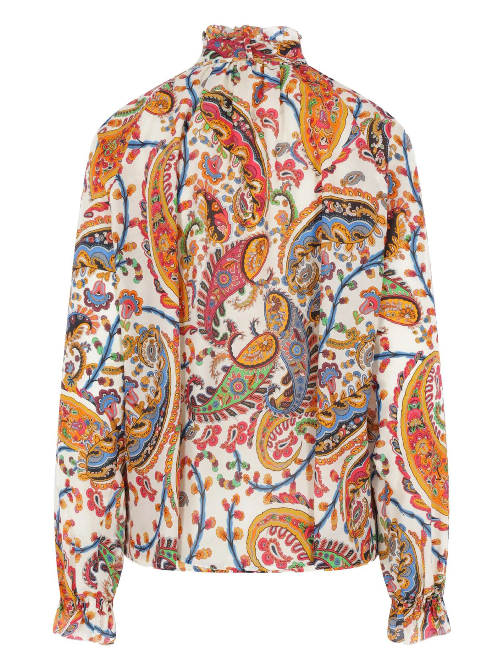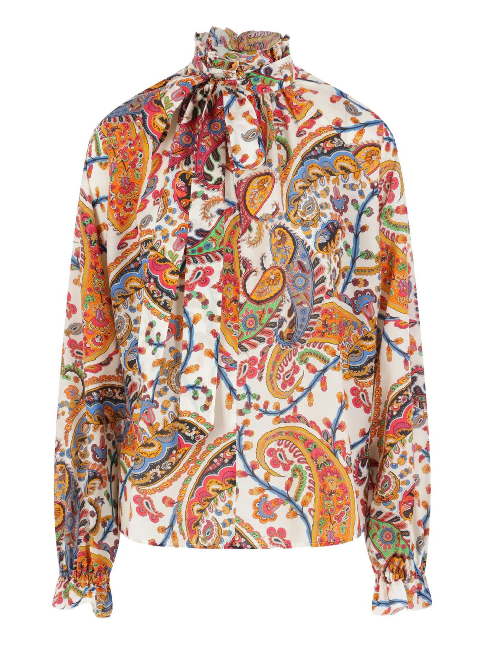 Blouse in white cotton and silk with an all-over multicoloured Paisley print, featuring a high ruffled collar and a covered button at the front, a detachable bow tie, long sleeves with elasticated cuffs and a straight hem