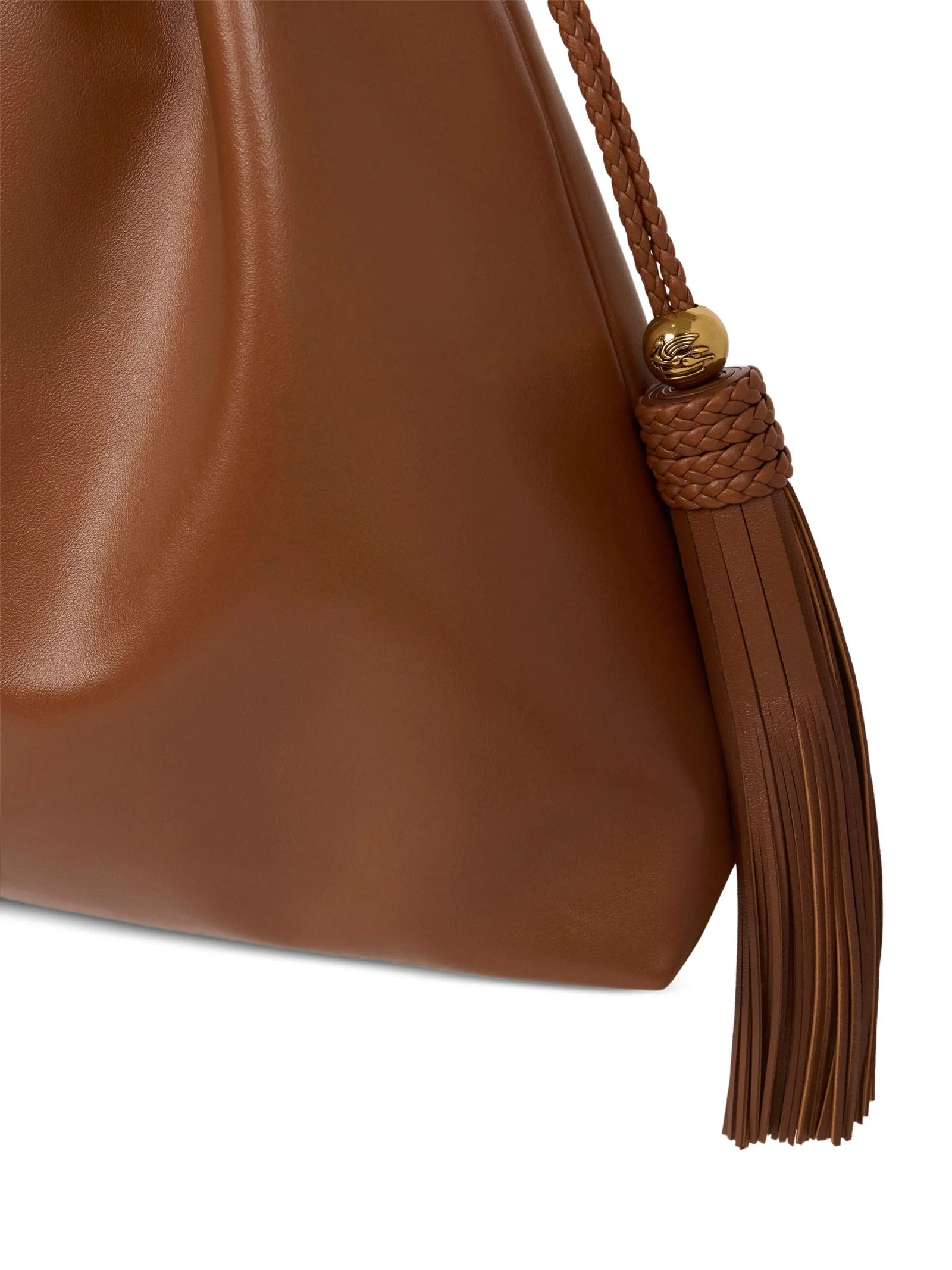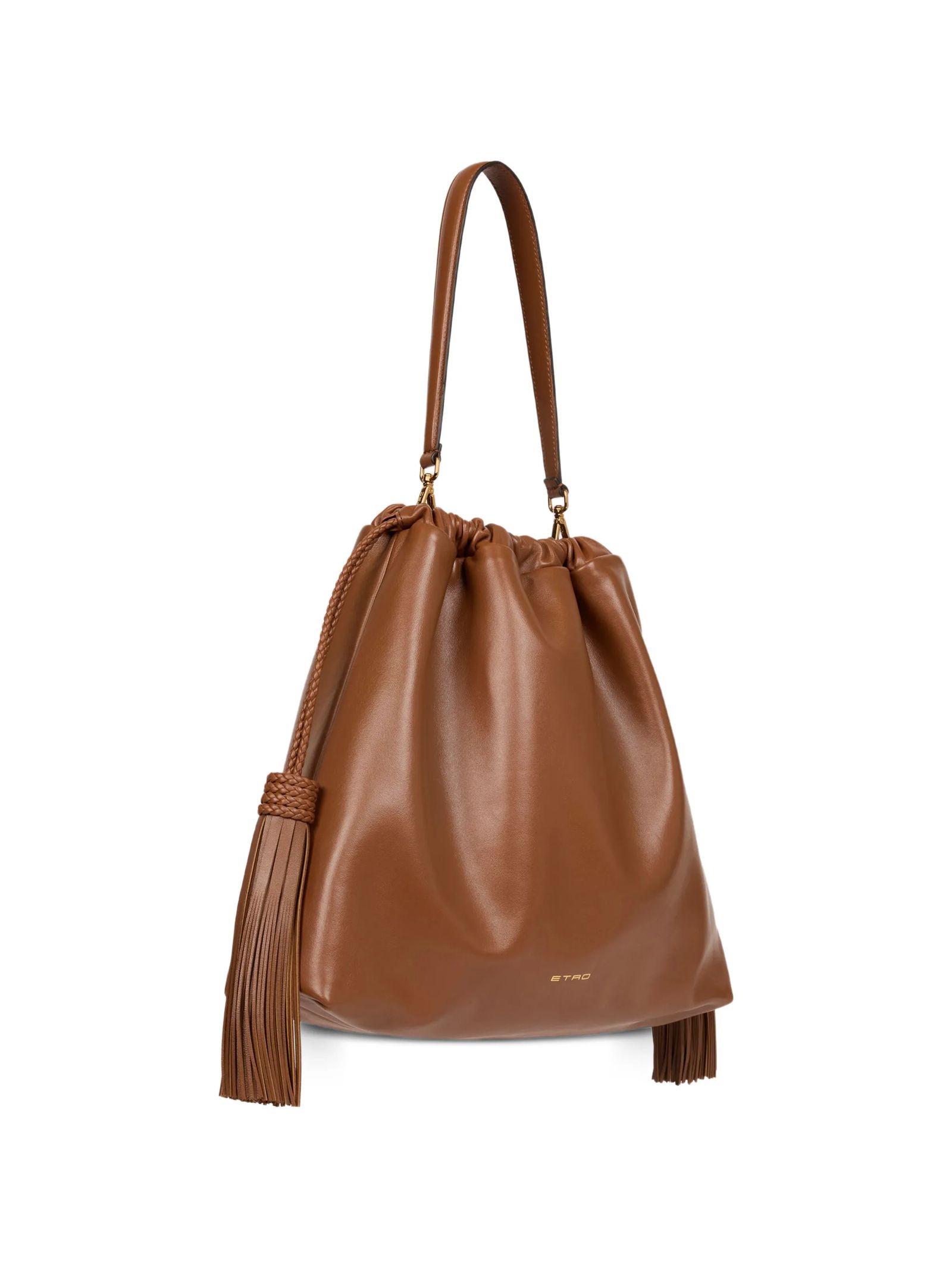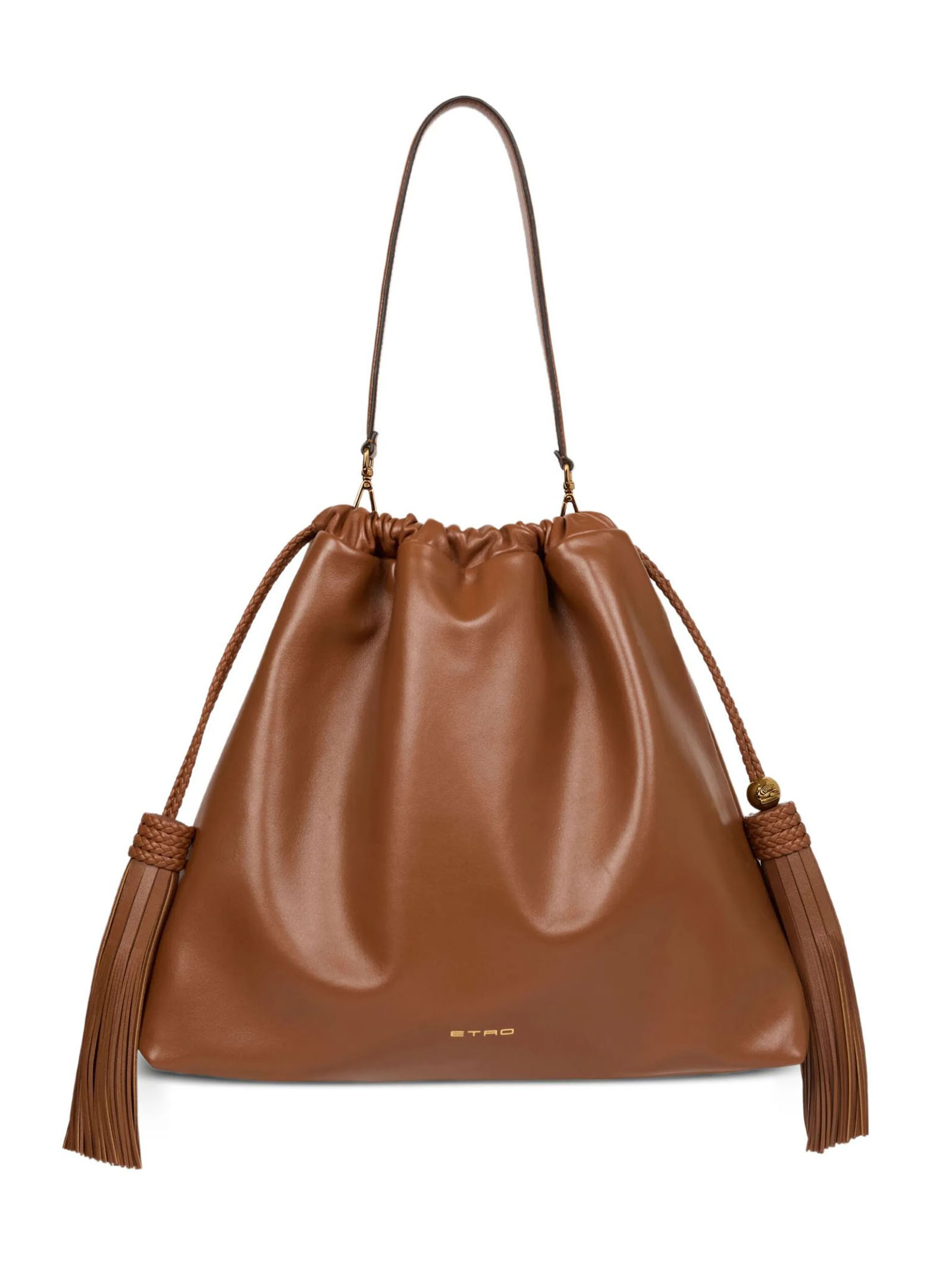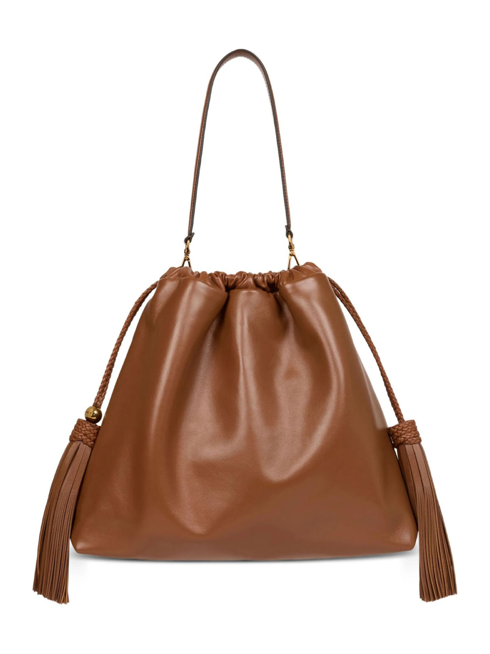 Large Kalispera sack bag in soft leather, featuring a braided drawstring closure, Removable handle, Internal slip pocket, Golden-finish metal elements, Dimensions (Width, Height): 14 x 14.8 x 3.9 inches (35.5 x 37.5 x 10 cm)